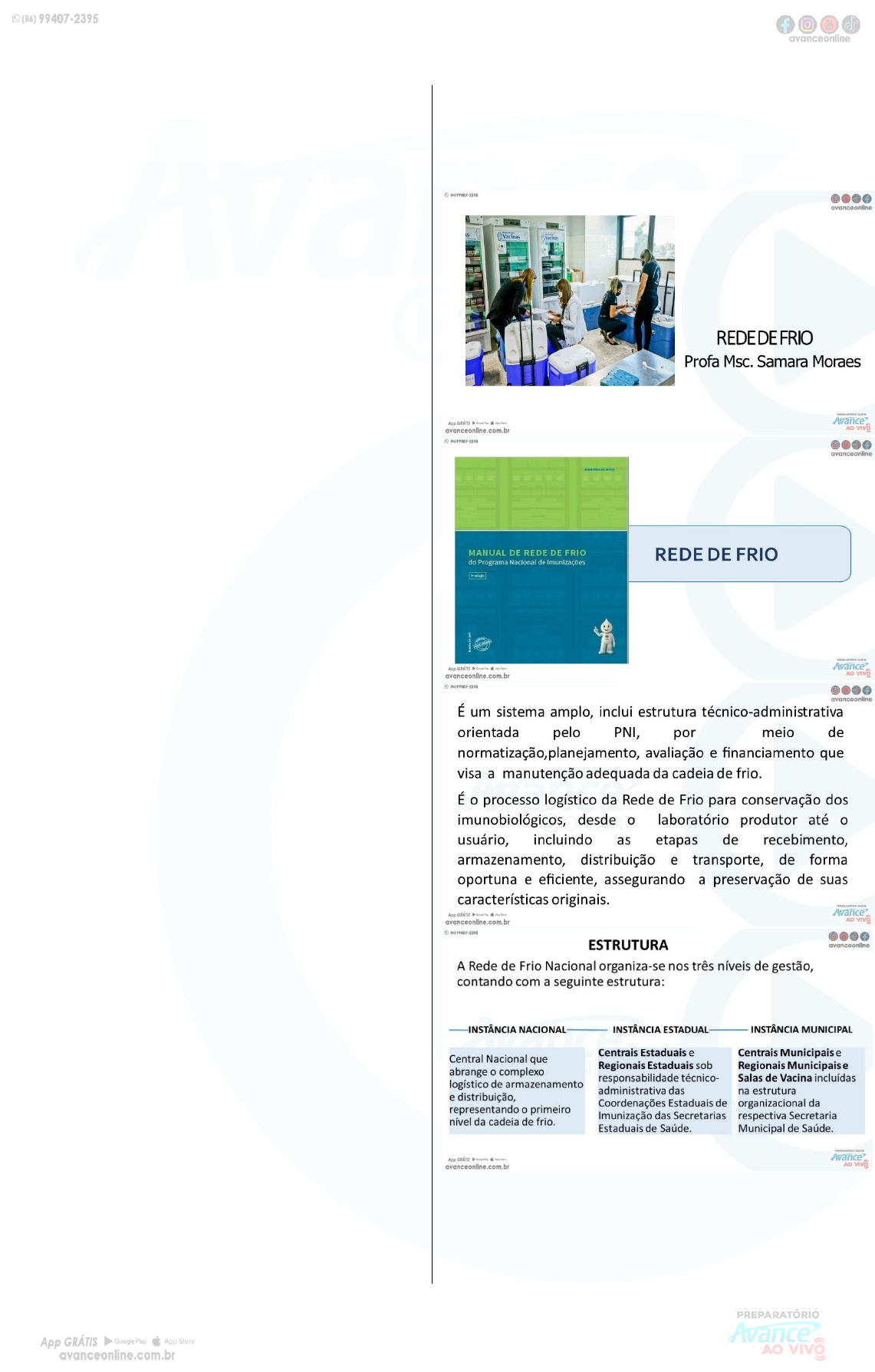 <p>TURMA DA POSSE – 09/02/2023 a 02/06/2023 - EXCLUSIVIDADE ALUNO AVANCE ONLINE</p><p>138</p><p>ESPECÍFICO DA ENFERMAGEM</p><p>Profa. Msc. Samara Moraes</p><p>Imunização</p><p>TURMA DA POSSE – 09/02/2023 a 02/06/2023 - EXCLUSIVIDADE ALUNO AVANCE ONLINE</p><p>139</p><p>TURMA DA POSSE – 09/02/2023 a 02/06/2023 - EXCLUSIVIDADE ALUNO AVANCE ONLINE</p><p>140</p><p>TURMA DA POSSE – 09/02/2023 a 02/06/2023 - EXCLUSIVIDADE ALUNO AVANCE ONLINE</p><p>141</p><p>TURMA DA POSSE – 09/02/2023 a 02/06/2023 - EXCLUSIVIDADE ALUNO AVANCE ONLINE</p><p>142</p><p>TURMA DA POSSE – 09/02/2023 a 02/06/2023 - EXCLUSIVIDADE ALUNO AVANCE ONLINE</p><p>143</p><p>TURMA DA POSSE – 09/02/2023 a 02/06/2023 - EXCLUSIVIDADE ALUNO AVANCE ONLINE</p><p>144</p><p>TURMA DA POSSE – 09/02/2023 a 02/06/2023 - EXCLUSIVIDADE ALUNO AVANCE ONLINE</p><p>145</p><p>TURMA DA POSSE – 09/02/2023 a 02/06/2023 - EXCLUSIVIDADE ALUNO AVANCE ONLINE</p><p>146</p><p>TURMA DA POSSE – 09/02/2023 a 02/06/2023 - EXCLUSIVIDADE ALUNO AVANCE ONLINE</p><p>147</p><p>TURMA DA POSSE – 09/02/2023 a 02/06/2023 - EXCLUSIVIDADE ALUNO AVANCE ONLINE</p><p>148</p><p>1- O Ministério da Saúde estabelece que o</p><p>recém-nascido receba a primeira dose da</p><p>vacina de hepatite B ao nascer. Na rede pública,</p><p>a continuidade do esquema vacinal é realizada</p><p>por meio da aplicação da vacina</p><p>a) tríplice viral</p><p>b) tríplice bacteriana</p><p>c) VIP inativada</p><p>d) tetraviral</p><p>e) pentavalente</p><p>2- Sobre vacina adsorvida difteria, tétano e</p><p>pertussis (acelular) tipo adulto (dTpa), e seu</p><p>esquema para gestantes, assinale a alternativa</p><p>correta.</p><p>a) Deve-se indicar 1 (uma) dose única da dTpa em</p><p>qualquer momento da gestação.</p><p>b) Para aquelas que perderam a oportunidade de</p><p>serem vacinadas durante a gestação, não pode</p><p>administrar a dose de dTpa no puerpério.</p><p>c) Não está indicada a vacina dTpa para gestantes.</p><p>d) Deve-se indicar 2 (duas) doses a cada gestação,</p><p>a partir da décima semana de gestação, com</p><p>intervalo de 60 dias.</p><p>e) Deve-se indicar 1 (uma) dose a cada gestação,</p><p>a partir da vigésima semana de gestação.</p><p>3- Muitas doenças comuns no Brasil e no</p><p>mundo deixaram de ser um problema de saúde</p><p>pública por causa da vacinação massiva da</p><p>população. Sobre vacinas, é correto afirmar:</p><p>a) A vacina tetraviral protege contra Sarampo,</p><p>Caxumba, Rubéola e Varicela.</p><p>b) A vacinação que protege contra Febre Amarela</p><p>está indicada nas áreas onde há evidência de</p><p>circulação do vírus da doença, devendo ser</p><p>aplicada a partir dos 6 meses de idade com</p><p>reforços anuais.</p><p>c) Dentre as vacinas que são recomendadas</p><p>administrar ao nascer destacam-se a BCG e a</p><p>DTP.</p><p>d) A vacina contra hepatite B é fundamental,</p><p>sobretudo para os profissionais da saúde, devendo</p><p>realizar o esquema completo que contempla 2</p><p>doses, com intervalo de 30 dias entre as mesmas.</p><p>e) A vacina que protege contra HPV está disponível</p><p>no esquema vacinal apenas para meninas em</p><p>idade fértil, e deve ser realizada em duas doses.</p><p>TURMA DA POSSE – 09/02/2023 a 02/06/2023 - EXCLUSIVIDADE ALUNO AVANCE ONLINE</p><p>149</p><p>4- A respeito do Programa Nacional de</p><p>Imunizações, julgue os itens a e b.</p><p>A. O referido programa consiste em uma ação</p><p>ineficaz em regiões de difícil acesso, pois, nessas</p><p>localidades, a refrigeração dos insumos é</p><p>prejudicada devido à precariedade de</p><p>armazenamento.</p><p>( ) certo ( ) errado</p><p>B. A vacina oral contra a poliomielite é do tipo vírus</p><p>atenuado.</p><p>( ) certo ( ) errado</p><p>5- O Programa Nacional de Imunizações (PNI)</p><p>prevê como ferramentas de qualificação e</p><p>instrumentalização um leque de normas e</p><p>orientações pertinentes às atividades de</p><p>imunização no Brasil. De acordo com o atual</p><p>Manual de Normas Técnicas e Procedimentos</p><p>para Vacinação, assinale verdadeiro (V) ou</p><p>falso (F).</p><p>( ) As equipes de Estratégia de Saúde da Família</p><p>devem verificar a caderneta e a situação vacinal da</p><p>população e, na necessidade, encaminhar para</p><p>iniciar ou completar o esquema vacinal, conforme</p><p>os calendários de vacinação.</p><p>( ) Procedimentos de manuseio, conservação,</p><p>preparo e administração, registro e descarte dos</p><p>resíduos de vacinação são desenvolvidos por</p><p>equipes de enfermagem, sendo o enfermeiro o</p><p>responsável pela supervisão do trabalho na sala de</p><p>vacinação e pelo processo de educação</p><p>permanente da equipe.</p><p>( ) A Rede de Frio, no âmbito da PNI, refere-se à</p><p>estrutura técnico-administrativa direcionada para a</p><p>manutenção adequada da Cadeia de Frio. A sala</p><p>de vacinação é a instância final da Rede de Frio,</p><p>onde os procedimentos de vacinação propriamente</p><p>ditos são executados mediante ações de rotina,</p><p>campanhas e outras estratégias.</p><p>( ) O estoque de imunobiológicos no serviço de</p><p>saúde não deve ser maior do que a quantidade</p><p>prevista para o consumo de um mês e devem ser</p><p>armazenados em equipamentos de refrigeração,</p><p>com temperaturas entre +2ºC e +8ºC, sendo o ideal</p><p>+5ºC.</p><p>( ) As seguintes vias podem ser utilizadas para</p><p>administração de imunobiológicos: oral;</p><p>intradérmica; subcutânea; intramuscular e</p><p>endovenosa.</p><p>A sequência, de cima para baixo, que completa</p><p>os parênteses corretamente está na alternativa:</p><p>a) V-V-F-V-F</p><p>b) V-V-V-V-V</p><p>c) V-V-V-V-F</p><p>d) F-F-V-F-F</p><p>e) V-V-F-V-V</p><p>6- Atente para o texto a seguir.</p><p>“Descoberta no final de 2019, a Covid-19 atacou</p><p>uma população que não conhecia seu vírus. O</p><p>número de doentes e mortos cresceu rapidame