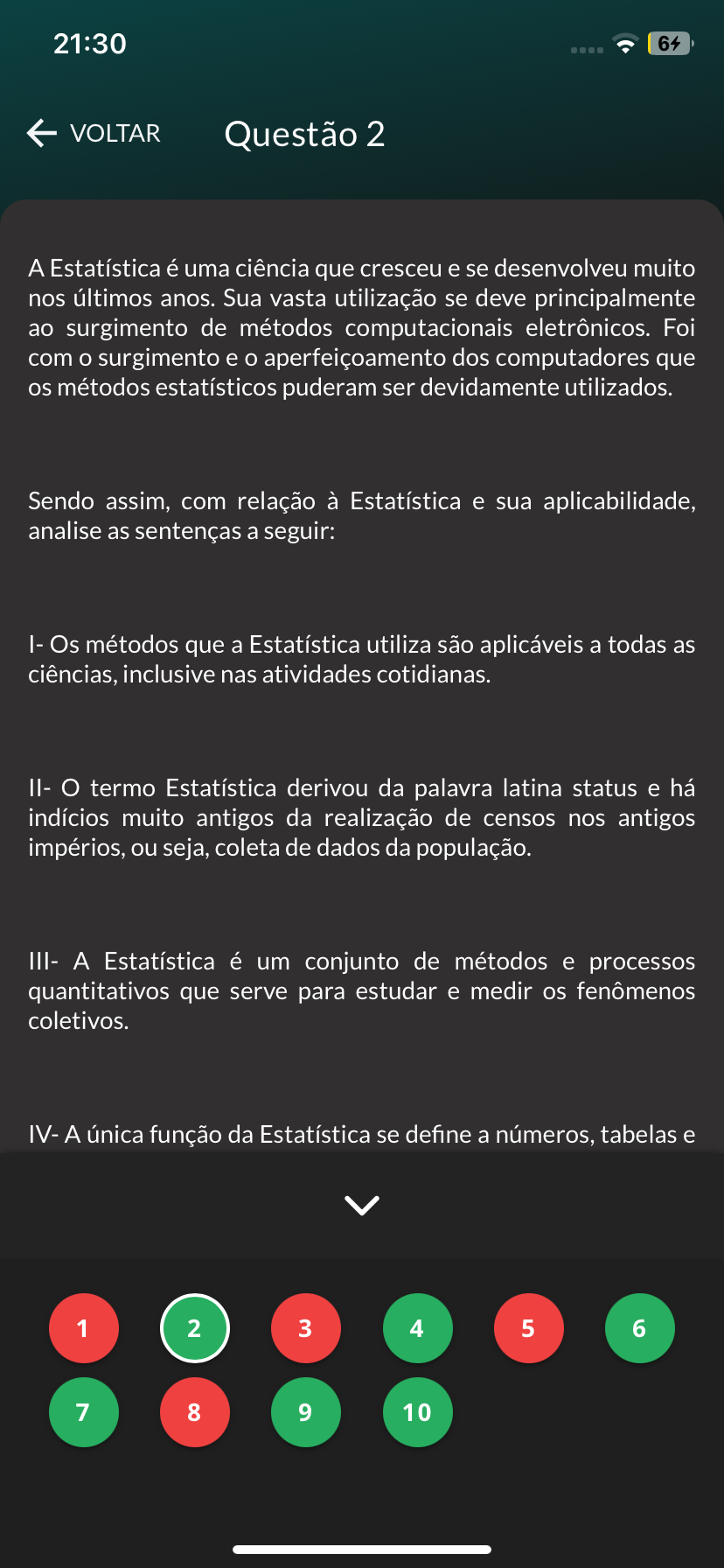 <p>21:30 64 VOLTAR Questão 2 A Estatística é uma ciência que cresceu e se desenvolveu muito nos últimos anos. Sua vasta utilização se deve principalmente ao surgimento de métodos computacionais eletrônicos. Foi com surgimento e aperfeiçoamento dos computadores que os métodos estatísticos puderam ser devidamente utilizados. Sendo assim, com relação à Estatística e sua aplicabilidade, analise as sentenças a seguir: I- Os métodos que a Estatística utiliza são aplicáveis a todas as ciências, inclusive nas atividades cotidianas. II- O termo Estatística derivou da palavra latina status e há indícios muito antigos da realização de censos nos antigos impérios, ou seja, coleta de dados da população. III- A Estatística é um conjunto de métodos e processos quantitativos que serve para estudar e medir os fenômenos coletivos. IV- A única função da Estatística se define a números, tabelas e 1 2 3 4 5 6 7 8 9 10</p>