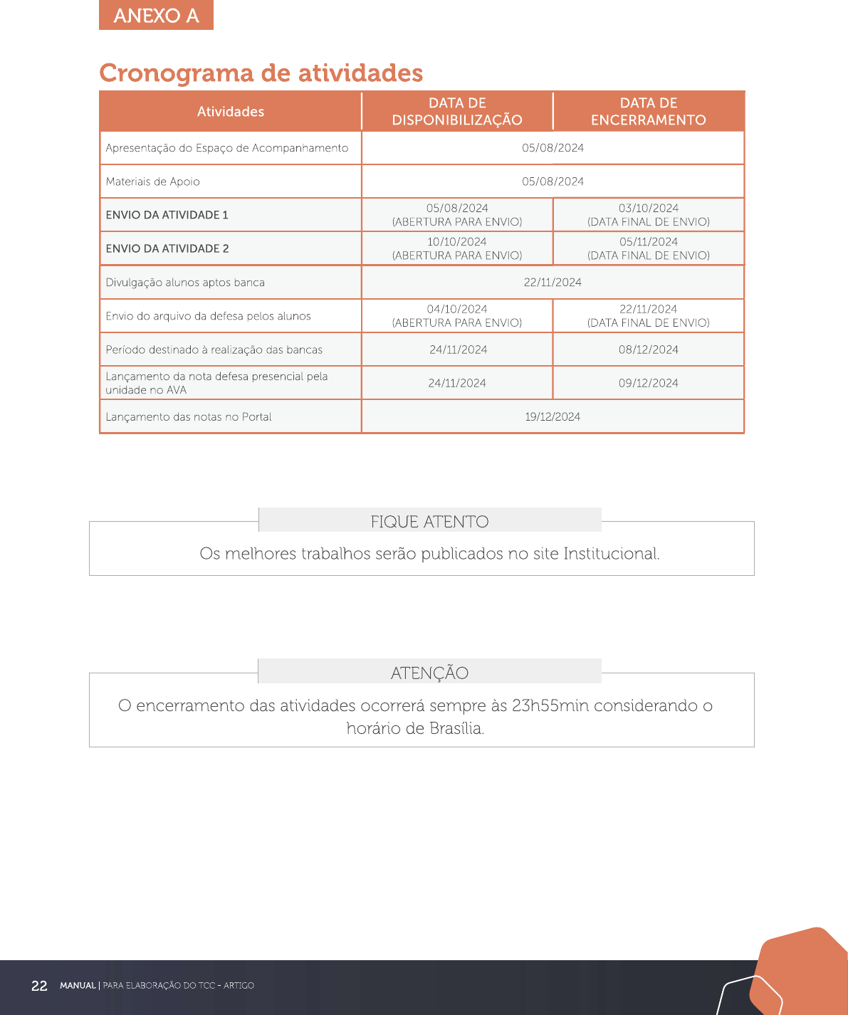 <p>ANEXO A Cronograma de atividades DATA DE DATA DE Atividades DISPONIBILIZAÇÃO ENCERRAMENTO Apresentação do Espaço de Acompanhamento 05/08/2024 Materiais de Apoio 05/08/2024 05/08/2024 03/10/2024 ENVIO DA ATIVIDADE 1 (ABERTURA PARA ENVIO) (DATA FINAL DE ENVIO) 10/10/2024 05/11/2024 ENVIO DA ATIVIDADE 2 (ABERTURA PARA ENVIO) (DATA FINAL DE ENVIO) Divulgação alunos aptos banca 22/11/2024 04/10/2024 22/11/2024 Envio do arquivo da defesa pelos alunos (ABERTURA PARA ENVIO) (DATA FINAL DE ENVIO) Período destinado à realização das bancas 24/11/2024 08/12/2024 Lançamento da nota defesa presencial pela 24/11/2024 09/12/2024 unidade no AVA Lançamento das notas no Portal 19/12/2024 FIQUE ATENTO Os melhores trabalhos serão publicados no site ATENÇÃO encerramento das atividades ocorrerá sempre às 23h55min considerando horário de Brasília. 22 MANUAL PARA ELABORAÇÃO DO TCC ARTIGO</p>