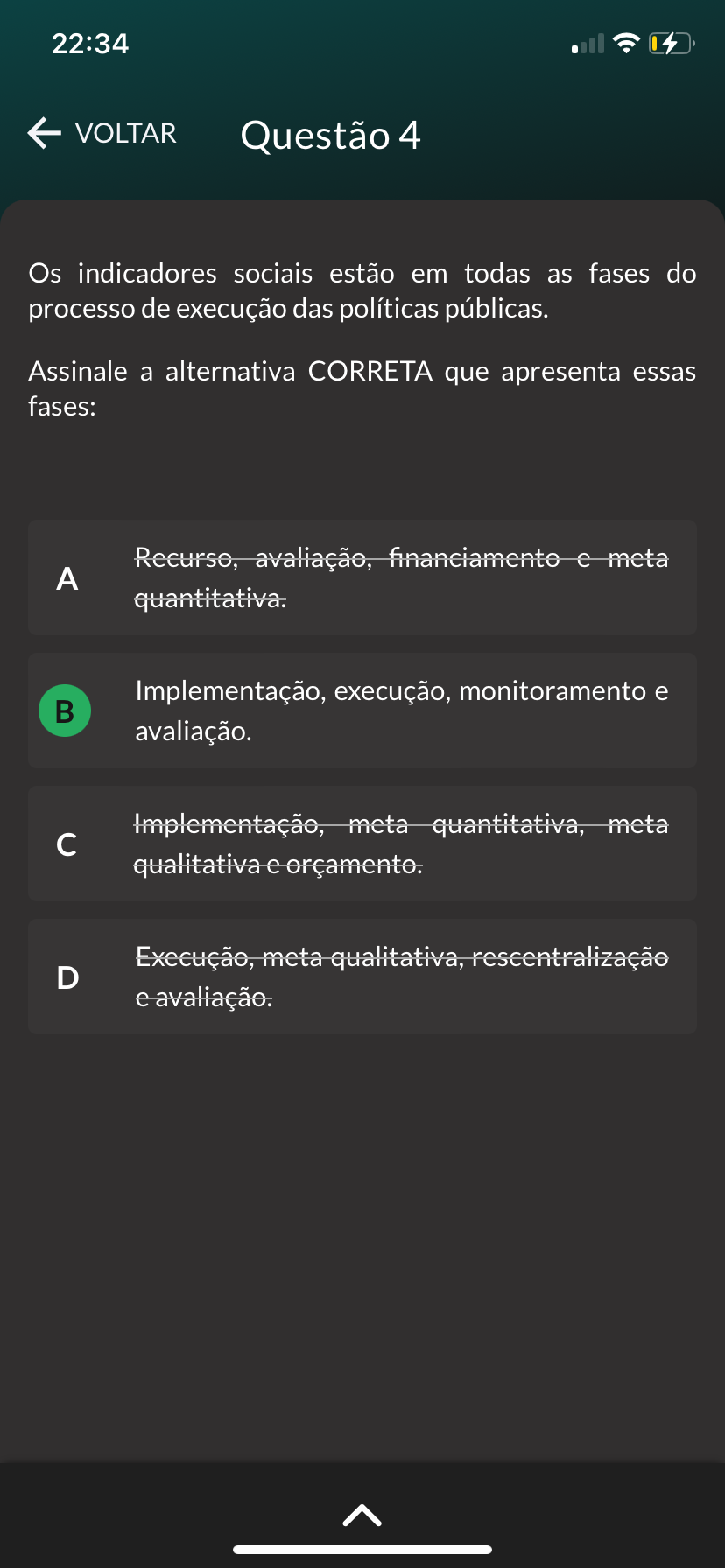 <p>22:34 VOLTAR Questão 4 Os indicadores sociais estão em todas as fases do processo de execução das políticas públicas. Assinale a alternativa CORRETA que apresenta essas fases: avaliação, e meta A quantitativa. Implementação, execução, monitoramento e avaliação. Implementação, meta quantitativa, meta C Execução, meta qualitativa, rescentralização D</p>