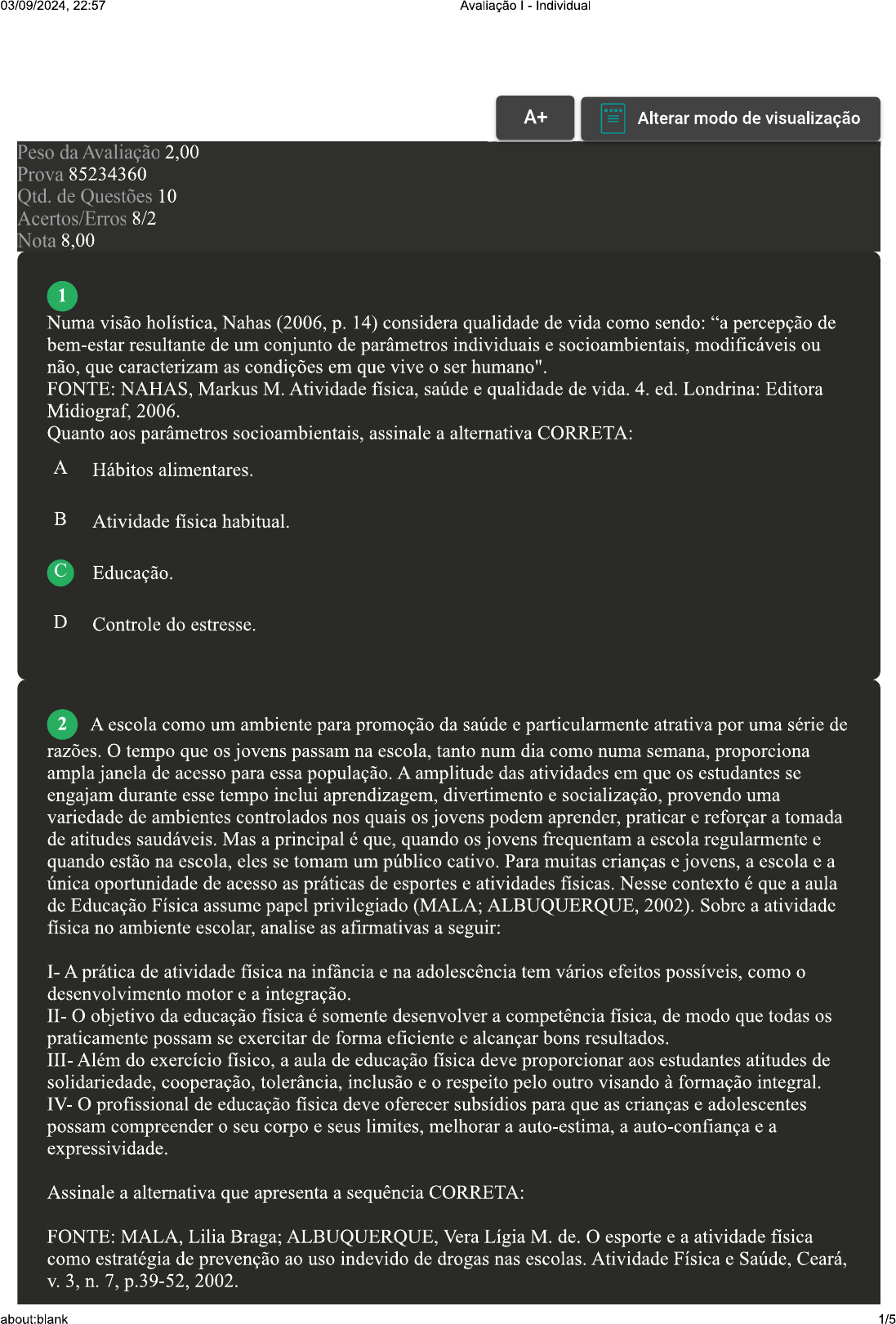 <p>03/09/2024, 22:57 Avaliação Individual A+ Alterar modo de visualização Peso da Avaliação 2,00 Prova 85234360 Otd. de Questões 10 Acertos/Erros 8/2 Nota 8,00 1 Numa visão holística, Nahas (2006, p. 14) considera qualidade de vida como sendo: "a percepção de bem-estar resultante de um conjunto de parâmetros individuais e socioambientais, modificáveis ou não, que caracterizam as condições em que vive ser humano". FONTE: NAHAS, Markus M. Atividade física, saúde e qualidade de vida. 4. ed. Londrina: Editora Midiograf, 2006. Quanto aos parâmetros socioambientais, assinale a alternativa CORRETA: A Hábitos alimentares. B Atividade física habitual. C Educação. D Controle do estresse. 2 A escola como um ambiente para promoção da saúde e particularmente atrativa por uma série de razões. O tempo que os jovens passam na escola, tanto num dia como numa semana, proporciona ampla janela de acesso para essa população. A amplitude das atividades em que os estudantes se engajam durante esse tempo inclui aprendizagem, divertimento e socialização, provendo uma variedade de ambientes controlados nos quais os jovens podem aprender, praticar e reforçar a tomada de atitudes saudáveis. Mas a principal é que, quando os jovens frequentam a escola regularmente e quando estão na escola, eles se tomam um público cativo. Para muitas crianças e jovens, a escola e a única oportunidade de acesso as práticas de esportes e atividades físicas. Nesse contexto é que a aula de Educação Física assume papel privilegiado (MALA; ALBUQUERQUE, 2002). Sobre a atividade física no ambiente escolar, analise as afirmativas a seguir: I- A prática de atividade física na infância e na adolescência tem vários efeitos possíveis, como desenvolvimento motor e a integração. II- O objetivo da educação física é somente desenvolver a competência física, de modo que todas os praticamente possam se exercitar de forma eficiente e alcançar bons resultados. III- Além do exercício físico, a aula de educação física deve proporcionar aos estudantes atitudes de solidariedade, cooperação, tolerância, inclusão e respeito pelo outro visando à formação integral. IV- O profissional de educação física deve oferecer subsídios para que as crianças e adolescentes possam compreender seu corpo e seus limites, melhorar a auto-estima, a auto-confiança e a expressividade. Assinale a alternativa que apresenta a sequência CORRETA: FONTE: MALA, Lilia Braga; ALBUQUERQUE, Vera Lígia M. de. O esporte e a atividade física como estratégia de prevenção ao uso indevido de drogas nas escolas. Atividade Física e Saúde, Ceará, V. n. 7, p.39-52, 2002. about:blank 1/5</p><p>03/09/2024, 22:57 Avaliação Individual A As afirmativas II e IV estão corretas. B As afirmativas I, III e IV estão corretas. C As afirmativas I e III estão corretas. D As afirmativas II, III e IV estão corretas. 3 Em 1986, no Canadá, aconteceu a primeira Conferência Internacional sobre Promoção da Saúde. O evento surgiu a partir das crescentes expectativas por uma nova saúde pública, defendendo ideias e a criação de ações efetivas na promoção da saúde em nível mundial. Sobre exposto, classifique V para as sentenças verdadeiras e F para as falsas: ( ) A promoção da saúde não é responsabilidade exclusiva do setor da saúde, pois vai além de ter uma vida ativa fisicamente, vai na direção de um bem-estar global. ( A saúde requer uma base sólida quanto a não violência social, habitação, educação, alimentação, renda, ecossistema estável, recursos sustentáveis, justiça social e equidade. ( ) A equidade em saúde da população ocorre por meio de ações que reduzam as diferenças no estado de saúde e asseguram oportunidades igualitárias. ( ) O compartilhamento da responsabilidade na promoção da saúde nos serviços de saúde, com outros setores como a educação e a própria comunidade são desnecessários. Assinale a alternativa que apresenta a sequência CORRETA: A B F-V-V-V C V-V-F-V D 4 O estilo de vida tem sido considerado um importante determinante da saúde do indivíduo e pode ser representado por crenças, valores e atitudes que, em conjunto, refletem um padrão de comportamento. Atualmente, existem muitos modelos e medidas que tentam explicar e avaliar bem- estar, estilo de vida, entre outros aspectos. Sobre Pentáculo do Bem-Estar, assinale a alternativa INCORRETA: A O Pentáculo do Bem-Estar demonstra os resultados obtidos no perfil do estilo de vida individual e pode ser considerado uma base conceitual para avaliação do estilo de As perguntas são uma autoavaliação e a escala corresponde a: 0 (quando não faz parte do seu B estilo de vida); 1 (às vezes corresponde ao seu comportamento); 2 (quase sempre verdadeiro no seu 3 (é sempre verdadeiro no seu comportamento). O ideal é que instrumento seja aplicado para grupos, bem como a análise dos resultados, para evitar eventuais constrangimentos. D O Pentáculo do Bem-Estar inclui cinco fatores: nutrição, controle do estresse, atividade física, relacionamentos e comportamento preventivo. about:blank 2/5</p><p>03/09/2024, 22:57 Avaliação Individual 5 Qualidade de vida tem um conceito variável para cada pessoa conforme relaciona os fatores individuais e socioambientais que determinam a sua condição de vida. O estilo de vida é um fator individual que traz aspectos considerados como preventivos para a qualidade de vida. Sobre os itens que apresentam aspecto preventivo, analise as sentenças a seguir: I- Não usar cinto de segurança no veículo. II- Usar equipamentos de segurança no trabalho. III- Atividade física habitual; usar protetor solar. IV- Não fumar; não ingerir bebida não usar drogas, dirigir defensivamente. Assinale a alternativa CORRETA: A As sentenças I, III e IV estão corretas. B As sentenças I, II e III estão corretas. C As sentenças II, III e IV estão corretas. D As sentenças I e II estão 