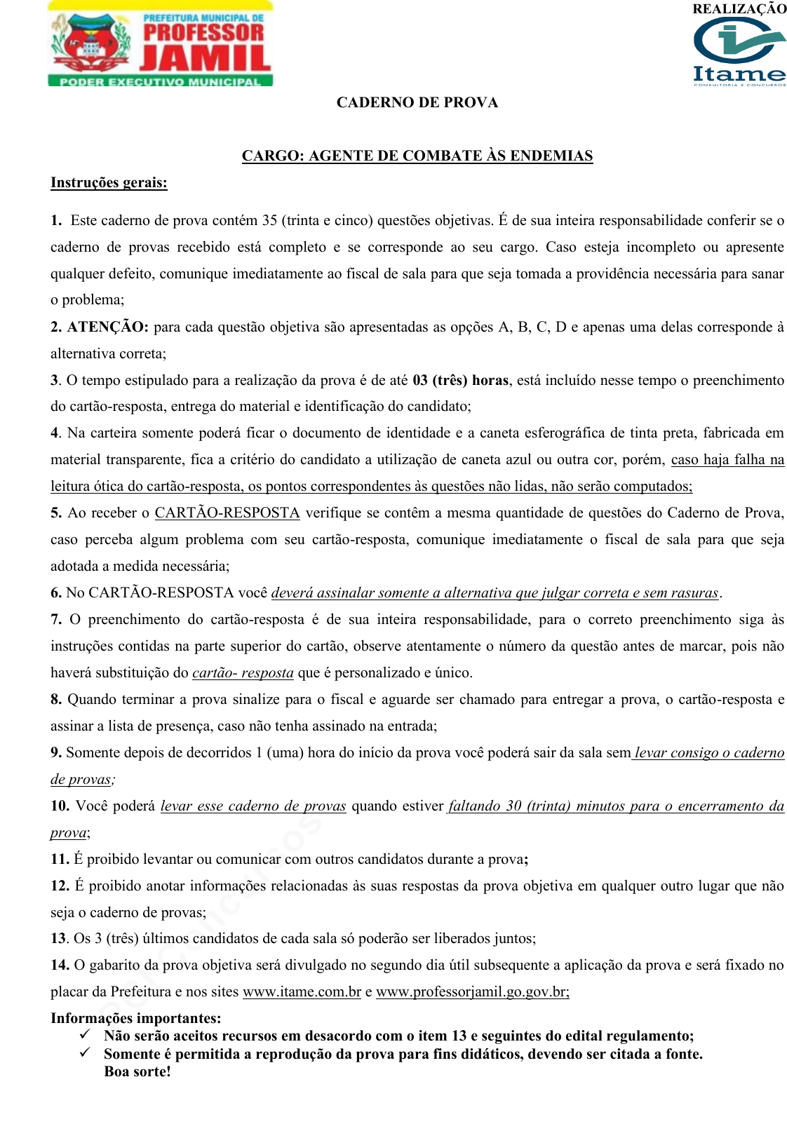 <p>pcimarkpci MDAwMDowMDAwOjAwMDA6MDAwMDowMDAwOmZmZmY6YmQwNDo0Yjg5:VHVlLCAwMyBTZXAgMjAyNCAyMjo1Njo1NSAtMDMwMA==</p><p>www.pciconcursos.com.br</p><p>REALIZAÇÃO</p><p>CADERNO DE PROVA</p><p>CARGO: AGENTE DE COMBATE ÀS ENDEMIAS</p><p>Instruções gerais:</p><p>1. Este caderno de prova contém 35 (trinta e cinco) questões objetivas. É de sua inteira responsabilidade conferir se o</p><p>caderno de provas recebido está completo e se corresponde ao seu cargo. Caso esteja incompleto ou apresente</p><p>qualquer defeito, comunique imediatamente ao fiscal de sala para que seja tomada a providência necessária para sanar</p><p>o problema;</p><p>2. ATENÇÃO: para cada questão objetiva são apresentadas as opções A, B, C, D e apenas uma delas corresponde à</p><p>alternativa correta;</p><p>3. O tempo estipulado para a realização da prova é de até 03 (três) horas, está incluído nesse tempo o preenchimento</p><p>do cartão-resposta, entrega do material e identificação do candidato;</p><p>4. Na carteira somente poderá ficar o documento de identidade e a caneta esferográfica de tinta preta, fabricada em</p><p>material transparente, fica a critério do candidato a utilização de caneta azul ou outra cor, porém, caso haja falha na</p><p>leitura ótica do cartão-resposta, os pontos correspondentes às questões não lidas, não serão computados;</p><p>5. Ao receber o CARTÃO-RESPOSTA verifique se contêm a mesma quantidade de questões do Caderno de Prova,</p><p>caso perceba algum problema com seu cartão-resposta, comunique imediatamente o fiscal de sala para que seja</p><p>adotada a medida necessária;</p><p>6. No CARTÃO-RESPOSTA você deverá assinalar somente a alternativa que julgar correta e sem rasuras.</p><p>7. O preenchimento do cartão-resposta é de sua inteira responsabilidade, para o correto preenchimento siga às</p><p>instruções contidas na parte superior do cartão, observe atentamente o número da questão antes de marcar, pois não</p><p>haverá substituição do cartão- resposta que é personalizado e único.</p><p>8. Quando terminar a prova sinalize para o fiscal e aguarde ser chamado para entregar a prova, o cartão-resposta e</p><p>assinar a lista de presença, caso não tenha assinado na entrada;</p><p>9. Somente depois de decorridos 1 (uma) hora do início da prova você poderá sair da sala sem levar consigo o caderno</p><p>de provas;</p><p>10. Você poderá levar esse caderno de provas quando estiver faltando 30 (trinta) minutos para o encerramento da</p><p>prova;</p><p>11. É proibido levantar ou comunicar com outros candidatos durante a prova;</p><p>12. É proibido anotar informações relacionadas às suas respostas da prova objetiva em qualquer outro lugar que não</p><p>seja o caderno de provas;</p><p>13. Os 3 (três) últimos candidatos de cada sala só poderão ser liberados juntos;</p><p>14. O gabarito da prova objetiva será divulgado no segundo dia útil subsequente a aplicação da prova e será fixado no</p><p>placar da Prefeitura e nos sites www.itame.com.br e www.professorjamil.go.gov.br;</p><p>Informações importantes:</p><p>✓ Não serão aceitos recursos em desacordo com o item 13 e seguintes do edital regulamento;</p><p>✓ Somente é permitida a reprodução da prova para fins didáticos, devendo ser citada a fonte.</p><p>Boa sorte!</p><p>pcimarkpci MDAwMDowMDAwOjAwMDA6MDAwMDowMDAwOmZmZmY6YmQwNDo0Yjg5:VHVlLCAwMyBTZXAgMjAyNCAyMjo1Njo1NSAtMDMwMA==</p><p>www.pciconcursos.com.brMunicípio de Professor Jamil -GO / Agente de Combate às Endemias 1</p><p>O que aconteceria com a Terra se a Lua</p><p>desaparecesse?</p><p>Quando a gente é criança, e aprende a desenhar, os</p><p>primeiros rabiscos sempre mostram pessoas feitas de</p><p>traços, nuvens, montanhas, o Sol e a Lua. São esboços</p><p>relativamente simples de serem feitos e muito</p><p>representativos desde a juventude.</p><p>Uma criança normalmente coloca o sol e a lua no</p><p>mesmo patamar: um cuida do dia e a outra da noite.</p><p>Ficamos mais velhos e aprendemos que os dois não têm</p><p>nada a ver um com o outro. O Sol é a estrela que ocupa</p><p>o papel central do sistema no qual estamos inseridos. Já</p><p>a Lua é o nosso satélite natural, que tem influência</p><p>apenas sobre o nosso planeta.</p><p>Mas é uma baita influência. Mais do que definir o fluxo</p><p>das marés, mais do que iluminar os céus nas noites</p><p>escuras (e nas cidades sem aquela nuvem de poluição)</p><p>… Mais do que servir de inspiração para os românticos,</p><p>a Lua é determinante para que a Terra seja</p><p>minimamente habitável. [...]</p><p>Disponível em: https://olhardigital.com.br/2024/05/05/ciencia-e-espaco/o-que-aconteceria-se-a-lua-desaparecesse-entenda-</p><p>a-importancia-do-nosso-satelite-natural/. (Adaptado). Acesso em: 18 maio 2024.</p><p>1. As palavras criança, Sol e Lua, destacadas no 2º</p><p>parágrafo exercem a função de.</p><p>(A) sujeito da oração.</p><p>(B) complemento verbal.</p><p>(C) núcleo do sujeito.</p><p>(D) núcleo do predicado.</p><p>2. Leia o fragmento e assinale a alternativa que</p><p>apresenta a classificação correta dos termos destacados.</p><p>“Uma criança normalmente coloca o sol e a lua no</p><p>mesmo patamar: um cuida do dia e a outra da noite.</p><p>Ficamos mais velhos e aprendemos que os dois não têm</p><p>nada a ver um com o outro.”</p><p>(A) o termo um, nas duas ocorrências, é artigo</p><p>indefinido; os outros dois são pronomes indefinidos.</p><p>(B) nas quatro ocorrências os termos são pronomes</p><p>indefinidos.</p><p>(C) o termo um é numeral nas duas ocorrências; outro</p><p>e outra são pronomes demonstrativos.</p><p>(D) nas quatro ocorrências os termos exercem a função</p><p>de numeral.</p><p>3. A classe gramatical de uma palavra pode mudar em</p><p>função da ausência de um acento gráfico. Em qual das</p><p>alternativas há uma palavra que, se não for acentuada,</p><p>deixa de ser substantivo e pas