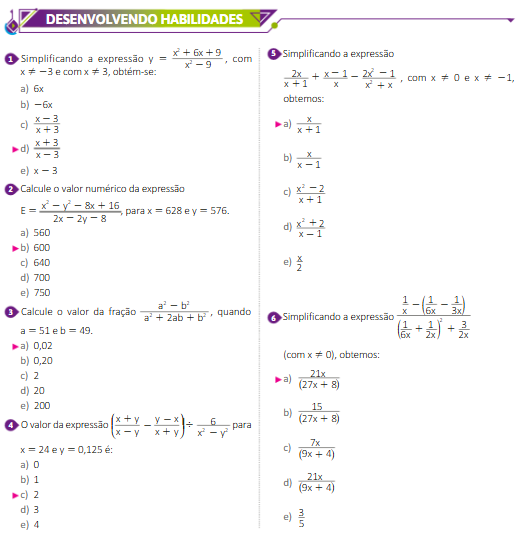 <p>DESENVOLVENDO HABILIDADES Simplificando a expressão = com 5 Simplificando a expressão 1 - 3 # 3, 2x +1 + - com # - -1, a) 6x b) -6x c) x-3 x+3 d) x+3 2 Calcule O valor numérico da expressão x+1 E = 2x para ey=576 a) 560 b) 600 c) 640 d) 700 e) 750 3 Calcule valor da fração + 2ab + quando 6 Simplificando a expressão a 6x a) 0,02 obtemos: b) 0,20 c) 2 d) 20 e) 200 valor da expressão para = 24 ey = c) a) 0 b) 1 c) 2 d) 3 e) e) 4</p>