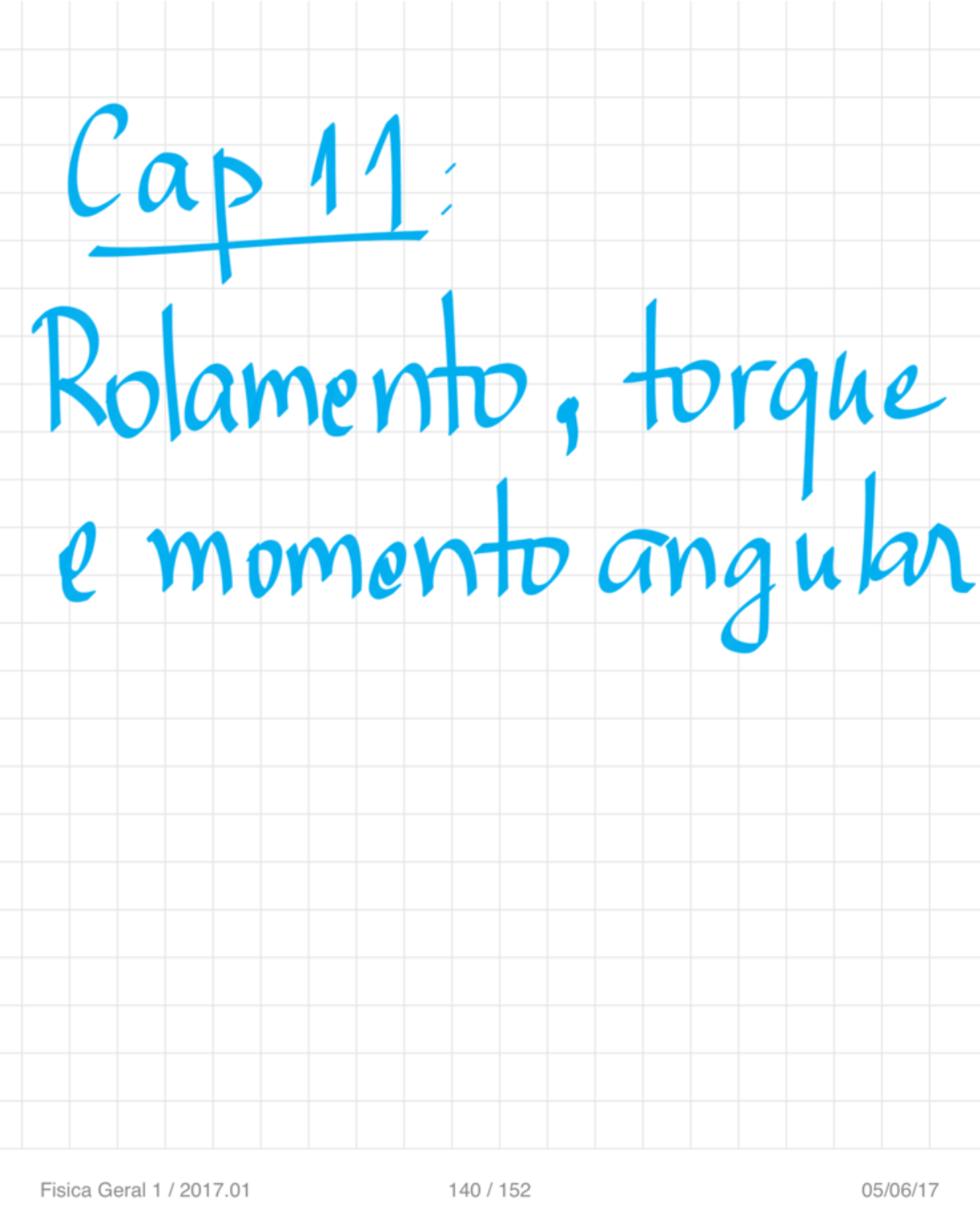 <p>Cap Rolamento torque e momento angular Fisica Geral 1 /2017.01 140/152 05/06/17</p><p>Neste capitulo a alguns dos no capitulo anterior estudaremos rolamento de objetos circula res, são combinados. Finalmente, conceito de bastante importante ser uma quantidade conservada, se now houver torgue sobre Rolamento pode ser visto de duas como uma mais uma ou como uma pura. + cm Vcm P K S=RO ds = R do WR = Vcm dt Rotacao pura + pura Rolamento = V=Vcm Vcm vcm V= No rolamento sem desliza- mento, de veloadade nula Fisica Geral 2017.01 141/152 05/06/17</p><p>Rolamento uma pura, em um cixo que se ponto da roda em contato chao tem rolamento pode ser visto comouma rotagao pura em torno do ponto de = W= Energia do a) + 1/2 + = K b) Rotagao = 1/2 [Icm + h = R = 2 Icm Mesma energia dos 2 pontus de vista !! Forças atuando no Se Vcm = constante = atuto atua! !! N Para mudar a velocidate da roda (estamos desprezando a resistencia do ar !!) força de com chao deve Fisica Geral /2017.01 142/152 05/06/17</p><p>Considere as situações abaixo. Quando houver superficies em contato suponha que seja nulo. Identifique todas as torgues e que atuam sobre T Ioio pendurado pelo Ioio descondo rampa parado em rampa parado rampa seguro for bar bante seguro for bar bante Ioio cm superficie horizontal, Ioio superficie horizontal, puxado por puxado por Fisica Geral /2017.01 143/152 07/06/17</p><p>Supondo nao haver deslizamento = WR dum = Rdw dt dt = acm tatrito Estatico, nao houver deslizamento Rolamento para baixo em uma N A e a normal NAO produzem Se now houver a roda rola: a rampa sem fahito Isolando corpo (roda) = Macm ; mg Mg seno - fa = Macm R I R Mgseno- Iacm = = R2 M+ I/R2 Fisica Geral 144/152 05/06/17</p><p>Ioio: a fisica por tras do funcionamento do é bastante inte- Pode ser particularmente rolamos ioio sobre uma mesa, puxando pela sua T mg -T=ma; = Ro 6 T= = I a R Ro Ro mg =mat Ia Ro a= mg g M+ 1+ I mg Revendo a de de 6 (torque) deve ser um vetor velocidade sao vetores ! vetorial do torgue rxF F = seny = ou =0 Vetor torgue e perpendicular ao plano definido pelos vetores F, conforme a Fisica Geral /2017.01 145/152 05/06/17</p><p>Momento Angular não confundir com !! l rxp = Importante depende da = m(rxv depende do sistema de Origem coordenadas que se escolhe v = l=mruseny Revendo a 2a Lei de Newton para Fres = dp isolada) Gres = Isolada) = m { dt xv + It de = It zero! = rx Fres 6 = Fisica Geral /2017.01 146/152 05/06/17</p><p>d = mrd senyl= Momento angular de um conjunto de particular V2 = + lzt ln = In i=1 V3 12 T3 Origem Mome angular total do sistema de particular = + + dln = = = res dt dt Gres = Momento angular de um girando cm torno de um fixo todas as partes do corpo tem a mesma velocidade angular a origem sobre O para facilitar a descrição Fisica Geral /2017.01 147/152 05/06/17</p><p>com velocidade angular W. li=ripisen 90°= ri = Vi=wri 90° ri = = Mi Li Momento inércia em torno do eixo i do eixo i A correspondente caso das da to = A vale para corpos mesmo que a expressao para um pouco mais complicada. do momento Sabemos que a externa resultante atuando sobre um conjunto de momento linear = Se Fres = O at ou = domomento linear) Fisica Geral /2017.01 148/152 06/06/17</p><p>Da mesma forma, o torgue resultante sobre um sistema enulo momento angular e conservado! Gres = Se Gres = O dt Notar que momento angular um vetor, assim Se torgue numa determinada for nulo momento naguela é Exemplo: bailarina girando com Ao fechar sua angular Lf = Li = Ao omomentode If>Ii wf = Iiwi > Wi If Pequeno animal sobre disco Wi 5 Wf rf ri Ii = Id + If = Id +mrf Wf = Wi Como ri Wf < Wi Fisica Geral 1/2017.01 149/152 06/06/17</p><p>Precessão de umgiroscopio similar a um peau mas, em geral, montado dentw de uma estrutura que pude girar qual quer Giroscopios saw em foguetes e misseis porque indicam mudanças de podem servir para manter a do movimento. A roda de bicicicleta pendurada por umde um examplo de untipode giroscopio = T at I Tenson produz torque porgue de alavanca r aplicada sobre mg Sobre a Torque da I 6 = mg. r. sen mg vetor do papel e I estasaindo do papel Ii Eixo da bicicleta gira no I I plano per a g f no sentido (visto de cima). Fisica Geral /2017.01 150/152 07/06/17</p><p>I AO = AL ( L = = 1 AL = mgr = mgr At L At L = mgr Iw determina a rapidez com a qual cixoda roda Quanto mais a roda gira cm torno do proprio cixu, angular mais lentamente eixo w Fisica Geral 1/2017.01 151/152 07/06/17</p>