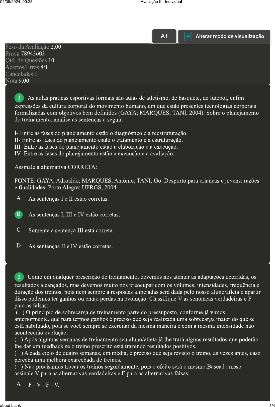 <p>04/09/2024, 00:25 Avaliação Individual A+ Alterar modo de visualização Peso da Avaliação 2,00 Prova 78943603 Qtd. de Questões 10 Acertos/Erros 8/1 Canceladas 1 Nota 9,00 1 As aulas práticas esportivas formais são aulas de atletismo, de basquete, de futebol, enfim expressões da cultura corporal do movimento humano, em que estão presentes tecnologias corporais formalizadas com objetivos bem definidos (GAYA; MARQUES; TANI, 2004). Sobre planejamento do treinamento, analise as sentenças a seguir: I- Entre as fases do planejamento estão diagnóstico e a reestruturação. II- Entre as fases do planejamento estão tratamento e a estruturação. III- Entre as fases do planejamento estão a elaboração e a execução. IV- Entre as fases do planejamento estão a execução e a avaliação. Assinale a alternativa CORRETA: FONTE: GAYA, MARQUES, António; TANI, Go. Desporto para crianças e jovens: razões e finalidades. Porto Alegre: UFRGS, 2004. A As sentenças I e II estão corretas. B As sentenças I, III e IV estão corretas. C Somente a sentença III está correta. D As sentenças II e IV estão corretas. 2 Como em qualquer prescrição de treinamento, devemos nos atentar as adaptações ocorridas, os resultados alcançados, mas devemos muito nos preocupar com os volumes, intensidades, frequência e duração dos treinos, pois nem sempre a respostas almejadas será dada pelo nosso aluno/atleta e apartir disso podemos ter ganhos ou então perdas na evolução. Classifique V as sentenças verdadeiras e F para as falsas: ) O principio de sobrecarga de treinamento parte do pressuposto, conforme já vimos anteriormente, que para termos ganhos é preciso que seja realizada uma sobrecarga maior do que se está pois se você sempre se exercitar da mesma maneira e com a mesma intensidade não acontecerão evolução. Após algumas semanas de treinamento seu aluno/atleta já lhe trará alguns resultados que poderão lhe dar um feedback se treino prescrito está trazendo resultados positivos. ( ) A cada ciclo de quatro semanas, em média, é preciso que seja revisto treino, as vezes antes, caso perceba uma melhora exarcebada de treinos. ( ) Não precisamos trocar os treinos seguidamente, pois efeito será mesmo. Baseado nisso assinale V para as alternativas verdadeiras e F para as alternativas falsas. A F-V-F-V about:blank 1/4</p><p>04/09/2024, 00:25 Avaliação Individual B C D F-F-V-V 3 Há criador do chamado "interval training", revolucionário que conseguiu ser uma inovação na época e vem sendo usado até os dias de hoje no treinamento de vários atletas. Sobre quem é essa pessoa, assinale a alternativa CORRETA: A Osolin, treinador da URSS. B Pihkala. C Willian Kraemer. D Woldemar Gerschler. 4 A prescrição de um treinamento adequado depende de uma série de fatores. Dentre os fatores mais importantes para periodização do treinamento, destaca-se uma boa periodização e respeito aos princípios do treinamento. Estes devem sempre guiar os treinamentos propostos. Sobre princípio da sobrecarga, assinale a alternativa CORRETA: A Este princípio baseia-se no fato de que cada indivíduo responde ao mesmo estímulo de uma forma diferente. B Este princípio baseia-se no fato de que estímulos adequados devem ser aplicados para que haja melhora física. C Este princípio baseia-se no fato de que melhorar a capacidade de um indivíduo que já é bem treinado é um desafio para os profissionais da área D Este princípio baseia-se no fato de que treinamento deve ser contínuo para que haja qualquer melhora física. 5 O Treinamento Desportivo é baseado em princípios científicos com objetivo de nortear a aplicação dos exercícios. Se um indivíduo mantém uma prática regular de atividades físicas ele terá ganhos e benefícios à saúde. O maior problema é que muitos não praticam exercícios regularmente ou param a prática por muito tempo, levando a diferentes adaptações. Sobre exposto, assinale a alternativa CORRETA: A O aumento da capacidade funcional ou as adaptações morfológicas adquiridas com treinamento são princípio da reversibilidade. B A diminuição da capacidade funcional ou das adaptações morfológicas que foram adquiridas com treinamento são princípio da reversibilidade. C O princípio da reversibilidade refere-se aos momentos adequados em que devem ser realizados novos estímulos. about:blank 2/4</p><p>04/09/2024, 00:25 Avaliação Individual D O princípio da reversibilidade explica que a partir do momento que ocorreram adaptações elas não serão mais perdidas. 6 Existem diversos métodos para treinamento nas modalidades esportivas coletivas. Um dos métodos adotados e praticado por muitos é "small games" ou "minijogo". Existem diversas vantagens quanto à utilização desse método de treinamento em esportes coletivos. Sobre exposto, classifique V para as sentenças verdadeiras e F para as falsas: ( ) Este modelo tem como desvantagem não conseguir desenvolver os padrões táticos de um time. ( ) Muito utilizados para otimizar tempo de treino e desenvolver capacidades fisiológicas. ( ) Este modelo de treinamento também pode desenvolver os padrões táticos de um time. ( ) Este modelo de treinamento desenvolve a tomada de decisão e atleta entende melhor jogo. Assinale a alternativa que apresenta a sequência CORRETA: A F F. B C D F-F-V-V Revisar Conteúdo do Livro 7 A prescrição adequada de exercícios físicos no treinamento desportivo depende do respeito do profissional de Educação Física pelas características e limitações dos indivíduos. Nesse contexto, a individualidade biológica que está relacionada com genótipo e fenótipo dos indivíduos são fatores extremamente importantes, uma vez que determinam essas características. Sobre O exposto, analise as sentenças a seguir: I- O genótipo pode ser entendido como conjunto de características genéticas do indivíduo. II- O consumo máximo de oxigênio é um exemplo de fenótipo. III- 