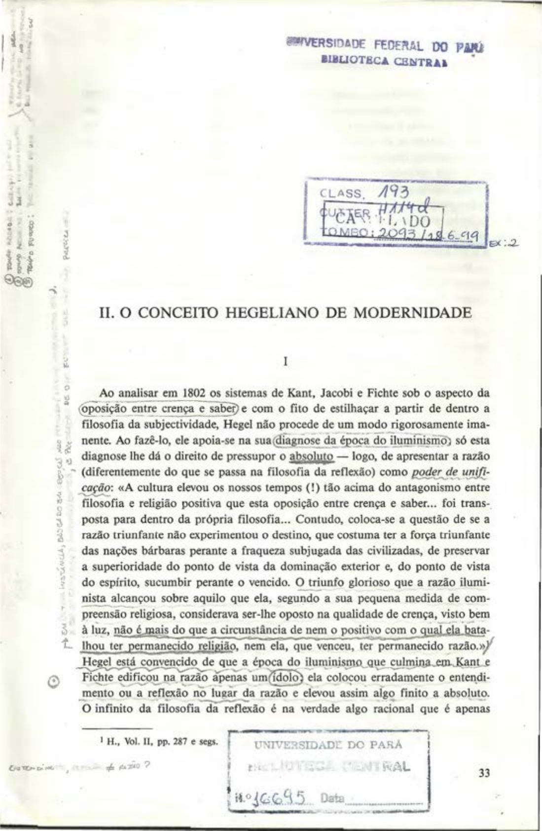 <p>FEDERAL DO BIBLIOTECA 193 CUTTER H114 d DO TOMBO 2093 16-99 II. CONCEITO HEGELIANO DE MODERNIDADE I Ao analisar em 1802 os sistemas de Kant, Jacobi e Fichte sob o aspecto da oposição entre crença e e com o fito de estilhaçar a partir de dentro a filosofia da subjectividade, Hegel não procede de um modo rigorosamente ima- nente. Ao fazê-lo, ele apoia-se na sua diagnose da época do só esta diagnose lhe dá o direito de pressupor o absoluto - logo, de apresentar a razão (diferentemente do que se passa na filosofia da reflexão) como poder de unifi- cação: cultura elevou os nossos tempos tão acima do antagonismo entre filosofia e religião positiva que esta oposição entre crença e saber... foi trans- posta para dentro da própria Contudo, coloca-se a questão de se a razão triunfante não experimentou o destino, que costuma ter a força triunfante das nações bárbaras perante a fraqueza subjugada das civilizadas, de preservar a superioridade do ponto de vista da dominação exterior e, do ponto de vista do espírito, sucumbir perante o vencido. o triunfo glorioso que a razão ilumi- nista alcançou sobre aquilo que ela, segundo a sua pequena medida de com- preensão religiosa, considerava ser-lhe oposto na qualidade de crença, visto bem à luz, não é mais do que a circunstância de nem o positivo com o qual ela bata- ter permanecido religião, nem ela, que venceu, ter permanecido Hegel está convencido de que a época do iluminismo que culmina em Kant e Fichte edificou na razão apenas um ela colocou erradamente o entendi- mento ou a reflexão no lugar da razão e elevou assim algo finito a absoluto. infinito da filosofia da reflexão é na verdade algo racional que é apenas H., Vol. II, pp. 287 e segs. UNIVERSIDADE DO PARA MENTRAL 33 Data</p><p>o DISCURSO FILOSÓFICO DA MODERNIDADE posto pelo entendimento, que se esgota na negação do finito: Fixando-o (o infinito), o entendimento opõe-no ao finito de modo absoluto e a reflexão que se tinha razão suprimindo o finito, ao fixar o actuar da razão na opo- sição, rebaixou-se de novo a entendimento; além disso, tem agora a pretensão de permanecer racional mesmo neste 2 Todavia, como mostra o dis- curso sem cerimónia sobre o Hegel pressupõe aqui, sub-repticia- mente, aquilo que pretende demonstrar: ele deveria primeiro mostrar, e não pura e simplesmente pressupor, que a razão, que é mais que entendimento abso- lutizado, pode unificar de um modo igualmente necessário aqueles antagonis- mos que a razão tem de destrinçar Aquilo que encoraja Hegel a fazer a pressuposição de um poder absoluto da unificação são também menos os argumentos do que as experiências que teve na sua vida - nomeadamente, aquelas experiências da crise da sua época que ele recolheu e ponderou em Tue- bingen, Berna e Frankfurt, e que depois levou para O jovem Hegel e os seus companheiros no seminário de Tuebingen eram, como se sabe, partidários dos movimentos de libertação do seu tempo. Viviam imediatamente no campo de tensões do iluminismo religioso e polemizavam com a ortodoxia protestante representada pelo teólogo Gottlieb Christian Storr. Orientavam-se, filosoficamente, pela filosofia kantiana da moral e da religião, politicamente, pelas ideias veiculadas pela Revolução Francesa. A ordem rigoro- samente regulamentada da vida no Seminário desempenhavam uma função pro- vocatória: teologia de Storr, o regulamento do convento e a constituição do Estado que conferia a sua protecção a ambas pareciam à maioria (dos semina- ristas) valerem uma 3 No quadro dos estudos teológicos a que Hegel e Schelling então se dedicavam este impulso rebelde assume a forma mais refreada de uma inspiração reformatória no âmbito do cristianismo primitivo. A intenção que eles atribuem a Jesus - moralidade na religiosidade da sua nação 4 é a deles próprios. Com isto eles viram-se tanto contra o partido do iluminismo como contra o da ortodoxia 5. Ambos os lados servem- -se dos instrumentos histórico-críticos da exegese bíblica, não obstante seguirem H., Vol. II, p. 21. 3 D. Henrich, Historische Voraussetzung von Hegels System (Pressupostos históricos do sistema de Hegel), in id., Hegel im Kontext (Hegel no seu contexto), Frankfurt, 1971, p. 55. 4 H., Vol. p. 107. 5 É o que Hegel insinua na sua observação: tipo de tratamento que se dá à religião muito abalada nos nossos dias, o qual toma a razão e a moralidade como base do seu exame e se socorre do espirito das nações e dos tempos para a sua explicação, é encarado por uma parte dos nossos muito respeitável em virtude do seu conhecimento, da sua lúcida razão e das suas boas intenções, como um benfazejo iluminismo que conduz aos fins da humanidade, da verdade e da virtude, e é denunciado pela outra parte, igualmente respeitável devido a semelhantes conhecimentos e fins igualmente benévolos e, além disso, suportada pelo de séculos e pelo poder público, como mera (Hegel, Vol. I, p. Henrich (1971), pp. 52 e segs. 34</p><p>FEDERAL CONCEITO HEGELIANO DE MODERNIDADE objectivos contrários nomeadamente, ou justificando a religião da razão, como é designada desde Lessing, ou defendendo contra esta a rigorosa doutrina de Lutero. A ortodoxia tinha passado à defensiva e tinha de se servir do método crítico dos seus adversários. A posição de Hegel corta estas duas frentes transversalmente. Como Kant, Hegel considera a religião como poder de executar (e) validar os direitos que a razão 6 Mas a ideia de Deus só pode conseguir um tal poder se a religião impregnar o espírito e os costumes de um povo, se ela estiver presente nas instituições do Estado e na praxis da sociedade, se ela tornar o modo de pensar dos Homens, bem como os seus motivos, sensíveis aos mandamentos da razão prática e lhos incutir na alma. Só como elemento da vida pública a reli- gião pode conferir eficiência prática à razão. Hegel deixa-se inspirar por Rous- seau quando es