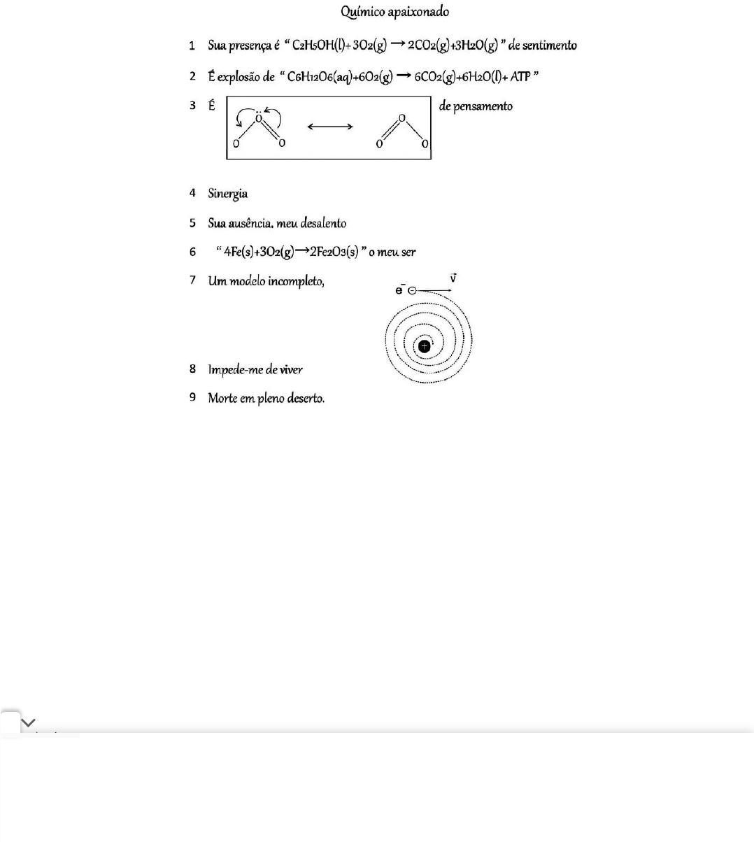 <p>Enem: lista de exercícios sobre NOX e</p><p>oxirredução</p><p>Nesta lista de exercícios, você poderá testar o que aprendeu sobre NOX e oxirredução, temas</p><p>importantíssimos para a prova de Química do Enem.</p><p>Perguntas</p><p>Questão: 1</p><p>(Fuvest 2021) No fragmento a seguir, o autor explora conceitos químicos na forma de poesia:</p><p>Wilmo Ernesto Francisco Junior, Ciência em prosa e verso –</p><p>Acepipes para quem ousa gostar (ou ensinar), 2018 (adaptado),</p><p>apud Lopes, MJ.M. Dissertação de Mestrado, 2019. Disponível em</p><p>http://www.repositorio.ufal.br/.</p><p>Sobre os conceitos mencionados, foram feitas as seguintes afirmações:</p><p>I. A equação química mostrada na linha 2 pode ser associada à liberação de energia, pois corresponde à reação de</p><p>fotossíntese com consumo de gás carbônico.</p><p>II. A equação química apresentada na linha 6 representa uma reação na qual o número de oxidação das espécies é</p><p>alterado, sendo associada à corrosão.</p><p>III. O modelo incompleto referido na linha 7 refere-se ao proposto por Thomson, que identificava a presença de partículas</p><p>com carga negativa dentro de uma esfera.</p><p>Está correto o que se afirma no(s) item(ns):</p><p>a) I, apenas.</p><p>b) II, apenas.</p><p>c) I e III, apenas.</p><p>04/09/2024, 10:28 Enem: lista de exercícios sobre NOX e oxirredução - Brasil Escola</p><p>https://exercicios.brasilescola.uol.com.br/imprimir/123637 1/14</p><p>d) II e III, apenas.</p><p>e) I, II e III.</p><p>Questão: 2</p><p>(Unesp 2021) Analise as reações:</p><p>Reação 1 – Obtenção de água sanitária</p><p>Cl2 (g) + 2NaOH (aq) → NaClO (aq) + NaCl (aq) + H2O (l)</p><p>Reação 2 – Reação de carga de uma bateria chumbo/ácido</p><p>2PbSO4 (s) + 2H2O (l) → Pb (s) + PbO2 (s) + 2H2SO4 (aq)</p><p>Reação 3 – Combustão de magnésio metálico</p><p>Mg (s) + ½O2 (g) → MgO (s)</p><p>Reação 4 – Obtenção de cal</p><p>CaCO3 (s) → CaO (s) + CO2 (g)</p><p>São exemplos de oxirredução, que apresentam um reagente atuando simultaneamente como oxidante e redutor, as</p><p>reações:</p><p>a) 1 e 3.</p><p>b) 2 e 3.</p><p>c) 1 e 4.</p><p>d) 2 e 4.</p><p>e) 1 e 2.</p><p>Questão: 3</p><p>(Unesp 2021) As bacteriorrizas são exemplos de associações simbióticas entre bactérias e raízes de plantas leguminosas.</p><p>Essas bactérias fixam o nitrogênio atmosférico (N2), transformando-o em amônia (NH3). Nessa transformação, o número de</p><p>oxidação do elemento nitrogênio é alterado de:</p><p>a) +2 para –3, sendo reduzido.</p><p>b) +2 para +1, sendo reduzido.</p><p>c) 0 para +3, sendo oxidado.</p><p>d) 0 para +1, sendo oxidado.</p><p>e) 0 para –3, sendo reduzido.</p><p>Questão: 4</p><p>(Farmep 2021) O iodo é um elemento relativamente raro, cuja forma elementar (I2) é produzida a partir de suas espécies</p><p>iônicas encontradas na natureza. As algas marinhas e as águas-mães do processamento do salitre do Chile são fontes</p><p>naturais de íons iodeto (I–) e iodato (IO3</p><p>–), respectivamente. A conversão desses íons em iodo molecular ocorre de acordo</p><p>com as equações 1 e 2.</p><p>Equação 1:</p><p>MnO2 + 2KI + 2H2SO4 → Mn2+ + I2 + 2K+ + 2H2O + 2SO4</p><p>2–</p><p>04/09/2024, 10:28 Enem: lista de exercícios sobre NOX e oxirredução - Brasil Escola</p><p>https://exercicios.brasilescola.uol.com.br/imprimir/123637 2/14</p><p>Equação 2:</p><p>2IO3</p><p>– + 5NaHSO3 → I2 + 5Na+ + 3H+ + 5SO4</p><p>2– + H2O</p><p>De acordo com os processos descritos, o elemento iodo sofre:</p><p>a) redução na equação 1 e oxidação na equação 2.</p><p>b) oxidação em ambas as equações.</p><p>c) redução em ambas as equações.</p><p>d) oxirredução apenas na equação 1.</p><p>e) oxidação na equação 1 e redução na equação 2.</p><p>Questão: 5</p><p>(UEPG 2019) Considerando a reação abaixo, assinale o que for correto.</p><p>6 CO2 + 6 H2O → C6H12O6 + 6 O2</p><p>01. A reação química descrita acima é uma reação de oxidorredução.</p><p>02. O carbono (C) é o elemento reduzido.</p><p>04. O hidrogênio (H) é o elemento oxidado.</p><p>08. O número de oxidação (NOX) do elemento carbono (C) diminui.</p><p>16. O oxigênio (O) é o elemento oxidado.</p><p>Questão: 6</p><p>(Fatec 2019) A reação que ocorre entre a fosfina e o oxigênio é representada pela equação química:</p><p>2 PH3 (g) + 4 O2 (g) → P2O5 (g) + 3 H2O (g)</p><p>As substâncias que atuam como agente oxidante e agente redutor desse processo são, respectivamente:</p><p>a) O2 e PH3.</p><p>b) O2 e H2O.</p><p>c) O2 e P2O5.</p><p>d) PH3 e H2O.</p><p>e) PH3 e P2O5.</p><p>Questão: 7</p><p>(Unesp 2020)</p><p>Lâmpadas sem mercúrio</p><p>Agora que os LEDs estão jogando para escanteio as lâmpadas fluorescentes compactas e seu conteúdo pouco amigável ao</p><p>meio ambiente, as preocupações voltam-se para as lâmpadas ultravioletas, que também contêm o tóxico mercúrio.</p><p>Embora seja importante proteger-nos de muita exposição à radiação UV do Sol, a luz ultravioleta também tem propriedades</p><p>muito úteis. Isso se aplica à luz UV com comprimentos de onda curtos, de 100 a 280 nanômetros, chamada luz UVC, que é</p><p>especialmente útil por sua capacidade de destruir bactérias e vírus.</p><p>Para eliminar a necessidade do mercúrio para geração da luz UVC, Ida Hoiaas, da Universidade Norueguesa de Ciência e</p><p>Tecnologia, montou um diodo pelo seguinte procedimento: inicialmente, depositou uma camada de grafeno (uma variedade</p><p>04/09/2024, 10:28 Enem: lista de exercícios sobre NOX e oxirredução - Brasil Escola</p><p>https://exercicios.brasilescola.uol.com.br/imprimir/123637 3/14</p><p>cristalina do carbono) sobre uma placa de vidro. Sobre o grafeno, dispôs nanofios de um semicondutor chamado nitreto de</p><p>gálio-alumínio (AlGaN). Quando o diodo é energizado, os nanofios emitem luz UV, que brilha através 