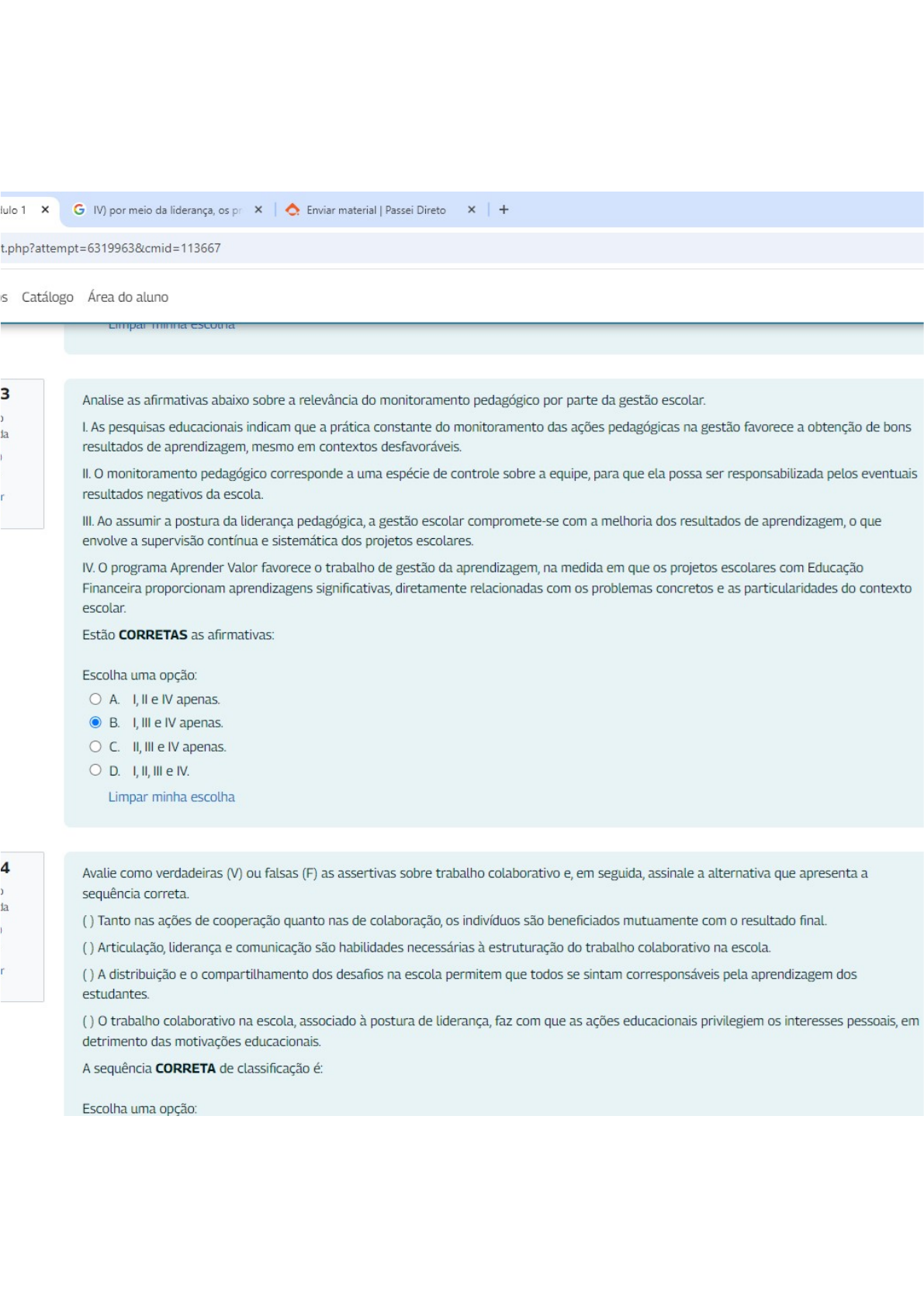 <p>dulo 1 G IV) por meio da liderança, os pr Enviar material Passei Direto + Catálogo Área do aluno 3 Analise as afirmativas abaixo sobre a relevância do monitoramento pedagógico por parte da gestão escolar. I. As pesquisas educacionais indicam que a prática constante do monitoramento das ações pedagógicas na gestão favorece a obtenção de bons resultados de aprendizagem, mesmo em contextos II. o monitoramento pedagógico corresponde a uma espécie de controle sobre a equipe, para que ela possa ser responsabilizada pelos eventuais resultados negativos da escola. III. Ao a postura da liderança pedagógica, a gestão escolar compromete-se com a melhoria dos resultados de aprendizagem, o que envolve a supervisão contínua e sistemática dos projetos IV. o programa Aprenden Valor favorece o trabalho de gestão da aprendizagem, na medida em que os projetos escolares com Educação Financeira proporcionam aprendizagens significativas, diretamente relacionadas com os problemas concretos e as particularidades do contexto escolar. Estão CORRETAS as afirmativas: Escolha uma opção: A. I, e IV apenas. B. I, III e IV apenas. C. II, III e IV apenas. D. I, II, III e IV. minha escolha 4 Avalie como verdadeiras (V) ou falsas (F) as assertivas sobre trabalho colaborativo e, em seguida, assinale a alternativa que apresenta a sequência correta. () Tanto nas ações de cooperação quanto nas de colaboração, os indivíduos são beneficiados mutuamente com o resultado final. () Articulação, liderança e comunicação são habilidades necessárias à estruturação do trabalho colaborativo na escola. () A distribuição e o compartilhamento dos desafios na escola permitem que todos se sintam corresponsáveis pela aprendizagem dos estudantes. () o trabalho colaborativo na escola, associado à postura de liderança, faz com que as ações educacionais privilegiem os interesses pessoais, em detrimento das motivações A sequência CORRETA de classificação é: Escolha uma opção:</p>