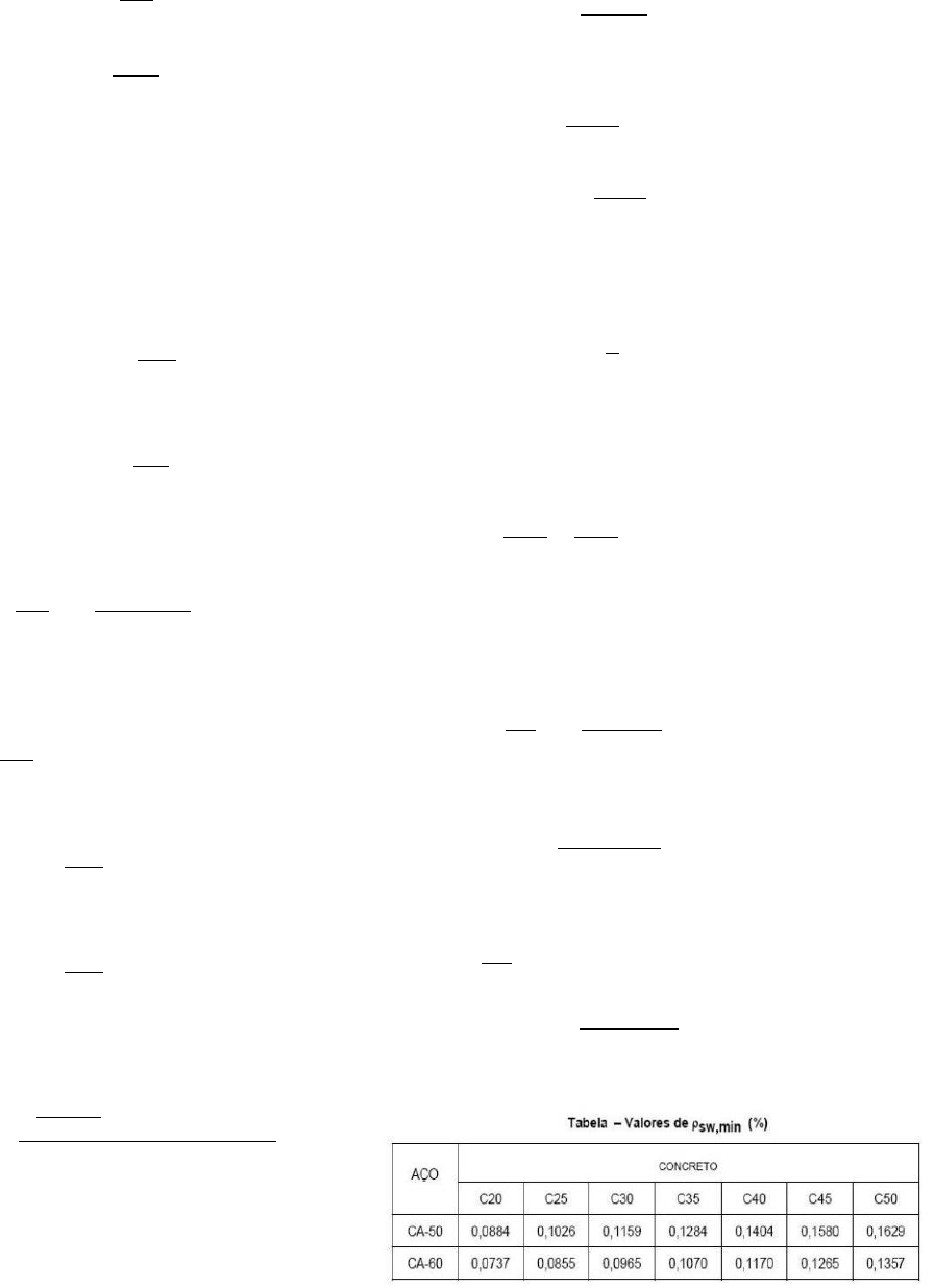 <p>PUCRS – FENG</p><p>Concreto Armado II – Engenharia Civil – Prof. Paulo S. Kunzler</p><p>Formulário1 –2020/01</p><p>TENSÕES NO CONCRETO E AÇO</p><p>𝑓𝑐𝑑 =</p><p>𝑓𝑐𝑘</p><p>1,4</p><p>𝑓𝑡𝑑 =</p><p>𝑓𝑦𝑘</p><p>1,15</p><p>𝑓𝑐𝑡𝑑 = 0,15. (𝑓𝑐𝑘)2/3</p><p>𝑓𝑦𝑤𝑑 = 𝑚𝑒𝑛𝑜𝑟 (𝑓𝑦𝑘 ; 435 𝑀𝑃𝑎)</p><p>𝑑 = ℎ − (𝑐 + 1)</p><p>CISALHAMENTO</p><p>VERIFICAÇÃO DA BIELA</p><p>𝑉𝑠𝑑 ≤ 𝑉𝑅𝑑2 𝑜𝑢</p><p>𝑉𝑠𝑑</p><p>𝑉𝑅𝑑2</p><p>≤ 1</p><p>𝑉𝑟𝑑2 = 0,27. 𝛼𝑣2. 𝑓𝑐𝑑 . 𝑏𝑤 . 𝑑</p><p>𝛼𝑣2 = (1 −</p><p>𝑓𝑐𝑘</p><p>250</p><p>)</p><p>𝑉𝑠𝑑 = 1,4. 𝑉𝑠𝑘</p><p>CÁLCULO ARMADURA TRANSVERSAL</p><p>(</p><p>𝐴𝑠𝑤</p><p>𝑠</p><p>) = [</p><p>𝑉𝑠𝑑 − 𝑉𝑐𝑜</p><p>0,9. 𝑑. 𝑓𝑦𝑤𝑑</p><p>]</p><p>𝑉𝑐𝑜 = 0,6. 𝑓𝑐𝑡𝑑 . 𝑏𝑤 . 𝑑</p><p>CÁLCULO ARMADURA TRANSVERSAL MÍNIMA</p><p>(</p><p>𝐴𝑠𝑤</p><p>𝑠</p><p>)</p><p>𝑚𝑖𝑛</p><p>= 𝜌𝑚𝑖𝑛. 𝑏𝑤 . 100</p><p>CALCULO ESPAÇAMENTO MÁXIMO</p><p>𝑆𝑒</p><p>𝑉𝑠𝑑</p><p>𝑉𝑅𝑑2</p><p>≤ 0,67;</p><p>𝑆𝑚𝑎𝑥 = 𝑀𝑒𝑛𝑜𝑟(0,6. 𝑑 ; 30𝑐𝑚)</p><p>𝑆𝑒</p><p>𝑉𝑠𝑑</p><p>𝑉𝑅𝑑2</p><p>> 0,67;</p><p>𝑆𝑚𝑎𝑥 = 𝑀𝑒𝑛𝑜𝑟(0,3. 𝑑 ; 20𝑐𝑚)</p><p>CALCULO CORTANTE MÍNIMO</p><p>𝑉𝑠𝑘,𝑚𝑖𝑛 =</p><p>[(</p><p>𝐴𝑠𝑤,𝑚𝑖𝑛</p><p>𝑠</p><p>) . 0,9. 𝑑. 𝑓𝑦𝑤𝑑] + 𝑉𝑐𝑜</p><p>1,4</p><p>CALCULO ARMADURA DE ANCORAGEM DA</p><p>BIELA</p><p>𝐴𝑠𝑏 =</p><p>1,4 . 𝑉𝑠𝑘</p><p>𝑓𝑦𝑑</p><p>CALCULO ARMADURA DE SUSPENSÃO</p><p>𝐴𝑠𝑤,𝑠 = (</p><p>1,4 . 𝐹</p><p>𝑓𝑦𝑑</p><p>) ÷ ℎ</p><p>𝐴𝑠𝑤,𝑠 = (</p><p>1,4 . 𝑞</p><p>𝑓𝑦𝑑</p><p>)</p><p>TORÇÃO</p><p>DADOS GEOMÉTRICOS</p><p>ℎ𝑒 = 𝑚𝑎𝑖𝑜𝑟 (</p><p>𝐴</p><p>𝑢</p><p>; 2. 𝑐1)</p><p>𝐴𝑒 = (𝑏 − ℎ𝑒). (ℎ − ℎ𝑒)</p><p>𝑈𝑒 = 2. (𝑏 − ℎ𝑒) + 2. (ℎ − ℎ𝑒)</p><p>VERIFICAÇÃO DA BIELA</p><p>𝑇𝑠𝑑</p><p>𝑇𝑅𝑑2</p><p>+</p><p>𝑉𝑠𝑑</p><p>𝑉𝑅𝑑2</p><p>≤ 1</p><p>𝑇𝑟𝑑2 = 0,50. 𝛼𝑣2. 𝑓𝑐𝑑 . 𝐴𝑒 . ℎ𝑒</p><p>𝑇𝑠𝑑 = 1,4. 𝑇𝑠𝑘</p><p>CALCULO ARMADURA TRANSVERAL</p><p>(</p><p>𝐴90</p><p>𝑠</p><p>) = [</p><p>𝑇𝑠𝑑</p><p>𝑓𝑦𝑤𝑑 . 𝐴𝑒</p><p>]</p><p>CALCULO ARMADURA LONGITUDINAL</p><p>𝐴𝑠𝑙 = [</p><p>𝑇𝑠𝑑 . 𝑈𝑒</p><p>2. 𝑓𝑦𝑤𝑑 . 𝐴𝑒</p><p>]</p><p>CÁLCULO ARMADURA TRANSVERSAL MÍNIMA</p><p>(</p><p>𝐴90</p><p>𝑠</p><p>)</p><p>𝑚𝑖𝑛</p><p>= 𝜌𝑚𝑖𝑛. 𝑏𝑤 . 100</p><p>𝐴𝑠𝑙,𝑚𝑖𝑛 =</p><p>𝜌𝑚𝑖𝑛. ℎ𝑒 . 𝑈𝑒</p><p>100</p><p>TABELA ρ,min</p><p>ANCORAGEM</p><p>COMPRIMENTO BÁSICO DE ANCORAGEM</p><p>𝑙𝑏 =</p><p>∅</p><p>4</p><p>.</p><p>𝑓𝑦𝑑</p><p>𝑓𝑏𝑑</p><p>≥ 25∅</p><p>𝑓𝑏𝑑 = 𝜂1. 𝜂2. 𝜂3. 𝑓𝑐𝑡𝑑</p><p>𝜂1 1 barra lisa</p><p>1,4 barra entalhada</p><p>2,25 barra nervurada</p><p>𝜂2 1,0 boa aderência</p><p>0,7 má aderência</p><p>𝜂3 1 para φ < 32mm</p><p>COMPRIMENTO NECESSÁRIO DE ANCORAGEM</p><p>𝑙𝑏,𝑛𝑒𝑐 = 𝛼1 𝑙𝑏 (</p><p>𝐴𝑠,𝑐𝑎𝑙𝑐</p><p>𝐴𝑠,𝑑𝑒𝑡</p><p>) ≥ 𝑙𝑏,𝑚𝑖𝑛</p><p>𝛼1 0,7 com gancho</p><p>1,0 sem gancho</p><p>COMPRIMENTO DE ANCORAGEM MINIMO</p><p>𝑙𝑏,𝑚𝑖𝑛 = 𝑚𝑎𝑖𝑜𝑟 ( 0,3 𝑙𝑏 ; 10∅ ; 10𝑐𝑚)</p><p>TRASPASSE</p><p>BARRAS COMPRIMIDAS</p><p>𝑙𝑜𝑐 = 𝑙𝑏,𝑛𝑒𝑐 ≥ 𝑙𝑜𝑐,𝑚𝑖𝑛</p><p>𝑙𝑜𝑐,𝑚𝑖𝑛 = 𝑚𝑎𝑖𝑜𝑟 ( 0,6 𝑙𝑏 ; 15∅ ; 200𝑚𝑚)</p><p>BARRAS TRACIONADAS</p><p>𝑙𝑜𝑐 = 𝛼𝑜𝑡 . 𝑙𝑏,𝑛𝑒𝑐 ≥ 𝑙𝑜𝑡,𝑚𝑖𝑛</p><p>𝑙𝑜𝑡,𝑚𝑖𝑛</p><p>= 𝑚𝑎𝑖𝑜𝑟 ( 0,3. 𝛼𝑜𝑡 . 𝑙𝑏; 15∅; 200𝑚𝑚)</p><p>% <20 25 33 50 >50</p><p>𝛼𝑜𝑡 1,2 1,4 1,6 1,8 2</p><p>% = % Barras emendadas na mesma seção</p><p>ARMADURA DE FISSURAÇÃO (PELE)</p><p>CALCULO ARMADURA</p><p>𝐴𝑠𝑓 = 0,001 . 𝑏. ℎ/𝑓𝑎𝑐𝑒</p><p>ARMADURA MÁXIMA</p><p>𝐴𝑠𝑓,𝑀𝐴𝑋 =</p><p>5𝑐𝑚2</p><p>𝑚</p><p>/𝑓𝑎𝑐𝑒</p><p>ALOJAMENTO ARMADURA NA SEÇÃO</p><p>TRANSVERSAL</p><p>ESPAÇAMENTO HORIZONTAL</p><p>𝑒ℎ = 𝑚𝑎𝑖𝑜𝑟(2𝑐𝑚; 𝜑; 1,2𝑑𝑚𝑎𝑥)</p><p>ESPAÇAMENTO VERTICAL</p><p>𝑒𝑣 = 𝑚𝑎𝑖𝑜𝑟(2𝑐𝑚; 𝜑; 0,5𝑑𝑚𝑎𝑥)</p><p>LARGURA ÚTIL</p><p>𝑏ú𝑡𝑖𝑙 = 𝑏 − 2(𝜑𝑡 + 𝑐𝑜𝑏)</p><p>BARRAS POR CAMADA</p><p>𝑛 =</p><p>𝑏ú𝑡𝑖𝑙 − 𝜑</p><p>𝑒ℎ + 𝜑</p><p>Arredondar para cima</p><p>ESCALONAMENTO DE ARMADURAS</p><p>𝑎𝑙 ≈ 𝑑</p><p>𝑟𝑒𝑓𝑒𝑟ê𝑛𝑐𝑖𝑎 1 − 10𝜑</p><p>𝑟𝑒𝑓𝑒𝑟ê𝑛𝑐𝑖𝑎 2 − 𝑙𝑏</p><p>ANCORAGEM MINIMA NO APOIO</p><p>𝑙𝑙𝑏,𝑛𝑒𝑐,𝑎𝑝,𝑚𝑖𝑛 = 𝑚𝑎𝑖𝑜𝑟(𝑙𝑏, 𝑚𝑖𝑛;</p><p>𝑟 + 5,5𝜑 ; 6𝑐𝑚)</p><p>𝑅𝑎𝑖𝑜 𝑑𝑒 𝑑𝑜𝑏𝑟𝑎</p><p>CA-50 CA-60</p><p>𝜑 < 20 2,5𝜑 3𝜑</p><p>𝜑 ≥ 20 4𝜑 N/A</p>