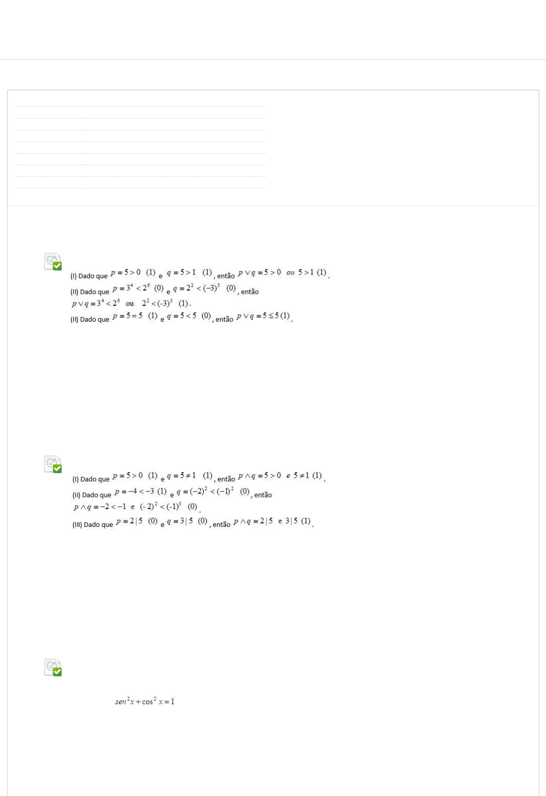 <p>29/09/2023, 11:45 Revisar envio do teste: QUESTIONÁRIO UNIDADE I – LÓGICA ...</p><p>https://ava.ead.unip.br/webapps/assessment/review/review.jsp?attempt_id=_97854339_1&course_id=_299258_1&content_id=_3506128_1&outc… 1/3</p><p>Revisar envio do teste: QUESTIONÁRIO UNIDADE ILÓGICA MATEMÁTICA D60E_13701_R_20232_01 CONTEÚDO</p><p>Usuário ROBERT ESTEVAN DA SILVA JUNIOR</p><p>Curso LÓGICA MATEMÁTICA</p><p>Teste QUESTIONÁRIO UNIDADE I</p><p>Iniciado 23/09/23 13:05</p><p>Enviado 23/09/23 14:29</p><p>Status Completada</p><p>Resultado da tentativa 4,5 em 5 pontos</p><p>Tempo decorrido 1 hora, 24 minutos</p><p>Resultados exibidos Respostas enviadas, Perguntas respondidas incorretamente</p><p>Pergunta 1</p><p>Resposta Selecionada: c.</p><p>Analise as a�rmações a seguir, atribuindo (1) para a sentença verdadeira e (0) para a sentença falsa:</p><p>Assinale a alternativa correta:</p><p>As a�rmações (I) e (III) são verdadeiras e (II) é falsa.</p><p>Pergunta 2</p><p>Resposta Selecionada: b.</p><p>Analise as a�rmações a seguir:</p><p>Assinale a alternativa correta:</p><p>As a�rmações (I) e (II) são verdadeiras e (III) é falsa.</p><p>Pergunta 3</p><p>Resposta Selecionada: c.</p><p>Analise as a�rmações a seguir:</p><p>(I) A lógica matemática tem como princípios (leis) fundamentais do pensamento: o princípio da identidade, o princípio da não contradição e o</p><p>princípio do terceiro excluído.</p><p>(II) A proposição é uma proposição composta.</p><p>(III) A proposição P: o número 2 é par ou ímpar é uma proposição composta.</p><p>Assinale a alternativa correta:</p><p>As a�rmações (I) e (III) são verdadeiras e (II) é falsa.</p><p>UNIP BIBLIOTECAS MURAL DO ALUNOCONTEÚDOS ACADÊMICOS</p><p>0,5 em 0,5 pontos</p><p>0,5 em 0,5 pontos</p><p>0,5 em 0,5 pontos</p><p>http://company.blackboard.com/</p><p>https://ava.ead.unip.br/webapps/blackboard/execute/courseMain?course_id=_299258_1</p><p>https://ava.ead.unip.br/webapps/blackboard/content/listContent.jsp?course_id=_299258_1&content_id=_3487347_1&mode=reset</p><p>https://ava.ead.unip.br/webapps/portal/execute/tabs/tabAction?tab_tab_group_id=_49_1</p><p>https://ava.ead.unip.br/webapps/portal/execute/tabs/tabAction?tab_tab_group_id=_27_1</p><p>https://ava.ead.unip.br/webapps/portal/execute/tabs/tabAction?tab_tab_group_id=_47_1</p><p>https://ava.ead.unip.br/webapps/portal/execute/tabs/tabAction?tab_tab_group_id=_25_1</p><p>https://ava.ead.unip.br/webapps/login/?action=logout</p><p>29/09/2023, 11:45 Revisar envio do teste: QUESTIONÁRIO UNIDADE I – LÓGICA ...</p><p>https://ava.ead.unip.br/webapps/assessment/review/review.jsp?attempt_id=_97854339_1&course_id=_299258_1&content_id=_3506128_1&outc… 2/3</p><p>Pergunta 4</p><p>Resposta Selecionada: b.</p><p>Analise as a�rmações a seguir:</p><p>(I) A proposição "P: o número 5 é par ou ímpar" pode ser decomposta em duas: 1) p: o número 5 é par (falsa); 2) q: o número 5 é ímpar</p><p>(verdadeira), e assim é uma proposição verdadeira.</p><p>(II) A proposição "Q: o número 15 é primo ou é um número composto" pode ser decomposta em duas: 1) p: o número 15 é primo (falsa); 2) q: o</p><p>número 15 é composto (verdadeira), e assim é uma proposição verdadeira.</p><p>(III) A proposição "M: o número 2 é ímpar e primo" é uma proposição verdadeira.</p><p>Assinale a alternativa correta:</p><p>As a�rmações (I) e (II) são verdadeiras e (III) é falsa.</p><p>Pergunta 5</p><p>Resposta Selecionada: c.</p><p>Analise as a�rmações a seguir:</p><p>(I) A tabela-verdade mostra os casos em que a proposição composta é verdadeira (V) ou falsa (F), já que o seu valor lógico só depende dos</p><p>valores lógicos das proposições simples componentes.</p><p>(II) Se então não é uma solução de A.</p><p>(III) O número de linhas da tabela-verdade de uma proposição composta depende do número de proposições simples que a formam. Assim, a</p><p>tabela-verdade de uma proposição composta com n proposições simples componentes contém 2n. Assim, o número de linhas da tabela-</p><p>verdade de uma proposição composta com três proposições simples é 8.</p><p>Assinale a alternativa correta:</p><p>As a�rmações (I) e (III) são verdadeiras e (II) é falsa.</p><p>Pergunta 6</p><p>Resposta Selecionada: c.</p><p>Analise as a�rmações a seguir:</p><p>(I) Na condicional “p→q”, diz-se que p é o antecedente e q o consequente. O símbolo “→” é chamado símbolo da implicação.</p><p>(II) A proposição "M: o número 2 é par, então é primo" é uma proposição verdadeira.</p><p>(III) Dados " " (verdadeira) e " " (falsa), temos que " " (falsa).</p><p>Assinale a alternativa correta:</p><p>As a�rmações (I) e (III) são verdadeiras e (II) é falsa.</p><p>Pergunta 7</p><p>Resposta Selecionada: b.</p><p>Analise as a�rmações a seguir:</p><p>A partir da expressão p ∧ q ∨ r pode se obter duas proposições colocando-se os parênteses de forma adequada: (I) (p ∧ q) ∨ r e (II) p ∧ (q ∨ r),</p><p>uma vez que os conectivos “∨” e“∧” possuem a mesma hierarquia na precedência de conectivos.</p><p>(III) Sabendo-se que o valor lógico das proposições p e q são respectivamente 1 (verdadeiro) e 0 (falso), então valor lógico da proposição</p><p>é 0 (falso).</p><p>Assinale a alternativa correta:</p><p>As a�rmações (I) e (II) são verdadeiras e (III) é falsa.</p><p>Pergunta 8</p><p>Analise as a�rmações a seguir:</p><p>0,5 em 0,5 pontos</p><p>0,5 em 0,5 pontos</p><p>0,5 em 0,5 pontos</p><p>0,5 em 0,5 pontos</p><p>0 em 0,5 pontos</p><p>29/09/2023, 11:45 Revisar envio do teste: QUESTIONÁRIO UNIDADE I – LÓGICA ...</p><p>https://ava.ead.unip.br/webapps/assessment/review/review.jsp?attempt_id=_97854339_1&course_id=_299258_1&content_id=_3506128_1&outc… 3/3</p><p>Sexta-feira, 29 de Setembro de 2023 11h44min51s GMT-03:00</p><p>Resposta Selecionada: c.</p><p>(I) A proposição ∼p tem semp