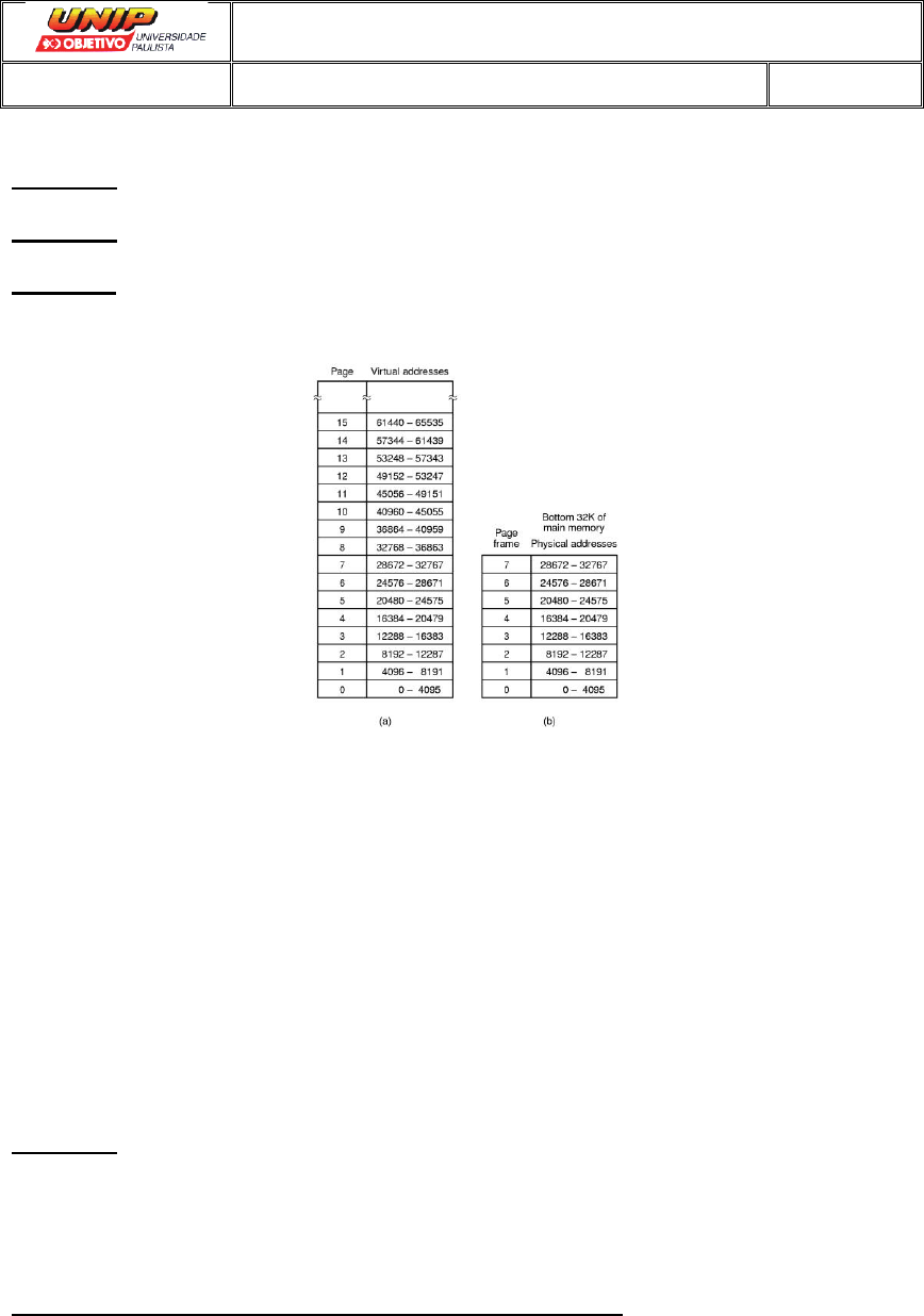 <p>Sistemas Operacionais Abertos e Mobile - Exercícios</p><p>RA.: Nome: Turma:</p><p>Questão 1: O que é endereço físico? O que é endereço lógico?</p><p>Questão 2: O que é MMU?</p><p>Questão 3: A seguinte figura ilustra em a) os 64KB do espaço de endereços virtuais divididos em</p><p>16 páginas e em b) a memória principal de 32KB dividida em 8 molduras de página.</p><p>Figura 1 – Os primeiros 64KB do espaço de endereços virtuais divididos em 16 páginas</p><p>, de 4KB de cada uma. (b) Memória principal de 32KB dividida em 8 molduras de</p><p>página de 4K cada. (Figura extraída de Tanenbaum A. S. Organização Estruturada de</p><p>Computadores, fig. 6.21)</p><p>A partir desta figura, responda:</p><p>a) Uma máquina apresenta tamanhos de páginas igual a 8KB. Sabendo-se que o espaço de</p><p>endereçamento virtual é endereçável com 32 bits, pergunta-se quantas páginas existem</p><p>na máquina?</p><p>b) Qual é o tamanho da moldura da página na memória física?</p><p>Questão 4: Considere a seguinte afirmação</p><p>Quando os programas esperam por memória livre para serem executados devido à insuficiência</p><p>de memória principal, o sistema operacional pode solucionar esse problema com a aplicação da</p><p>técnica de paginação. É verdadeira our falsa? Justifique sua resposta.</p><p>Questão 5: (Fundamentada na questão 26 de POSCOMP 2009 )</p><p>Considere uma arquitetura de memória com as seguintes características:</p><p>• Memória logicamente particionada em segmentos paginados.</p><p>• Endereços virtuais de 32 bits: 8 para segmentos, 11 para páginas e o restante para o</p><p>endereçamento na página</p><p>• Endereços físicos de 20 bits e páginas de 8KB;</p><p>Caso o particionamento lógico fosse o de paginação pura, calcule a o número de páginas</p><p>virtuais e o número de frames.</p><p>Questão 6: (1 pto.) Considerando a tabela de páginas abaixo, com páginas de 500 bytes, informe</p><p>os endereços físicos correspondentes aos endereços lógicos 983, 1822, 4.223, 8433, 7500,</p><p>indicados em decimal.</p><p>Página 0 1 2 3 4 5 6 7 8 9 10 11 12 13 14 15</p><p>quadro 3 12 6 5 9 2 10 8 0 1 11 13 14 7 12 4</p><p>Questão 7: Definir:</p><p>a. Memória Virtual</p><p>b. Swapping</p><p>Questão 8: Considere um sistema de memória com quatro quadros de RAM e oito</p><p>páginas a alocar. Os quadros contêm inicialmente as páginas 7, 4 e 1, carregadas em</p><p>memória nessa sequência. Determine quantas faltas de página ocorrem na sequência de</p><p>acesso {0, 1, 7, 2, 3, 2, 7, 1, 0, 3}, para o algoritmo de escalonamento de memória LRU.</p><p>Repita o problema para os algoritmos FIFO e Ótimo.</p>