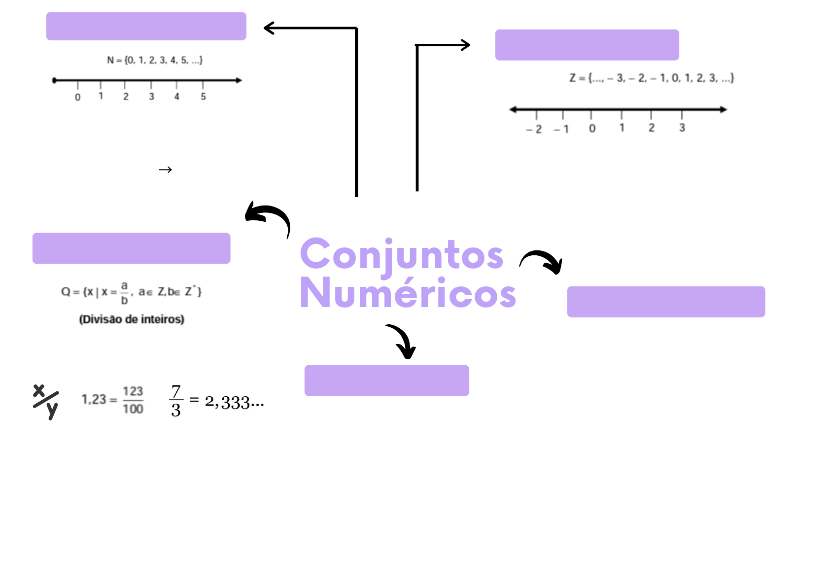<p>Números Irracionais (I)</p><p>Números Racionais (Q)</p><p>Números Naturais (N)</p><p>Números Inteiros (Z)</p><p>@mapeandoaprovacao | @mireleotto @revisa.van</p><p>Números Reais (R)</p><p>ConjuntosConjuntos</p><p>NuméricosNuméricos</p><p>Um subconjunto importante de N é o</p><p>conjunto N*:</p><p>N* = {1, 2, 3, 4, 5, ...} → o zero foi</p><p>excluído do conjunto N.</p><p>Z* = Z − {0} Z + = conjunto dos inteiros não</p><p>negativos Z + = {0, 1, 2, 3, 4, 5, ...}</p><p>Z − = conjunto dos inteiros não positivos</p><p>Z − = {0, − 1, − 2, −3, − 4, − 5, ...}</p><p>Frações, decimais finitos e Dízimas</p><p>Periódicas.</p><p>Os números irracionais são decimais</p><p>infinitas não periódicas, ou seja, os</p><p>números que não podem ser escritos na</p><p>forma de fração (divisão de dois números</p><p>inteiros).</p><p>Exemplos: √𝟐 = 1,4142135... √𝟑 = 1,7320508...</p><p>Um número irracional bastante</p><p>conhecido, muito utilizado</p><p>principalmente na geometria, é o número</p><p>= 3,1415926535..</p><p>Dados os conjuntos dos números</p><p>racionais (Q) e dos irracionais (I),</p><p>definimos o conjunto dos números</p><p>reais como: R = Q I = {x | x é</p><p>racional ou x é irracional}</p><p>@mapeandoaprovacao | @mireleotto @revisa.van</p>