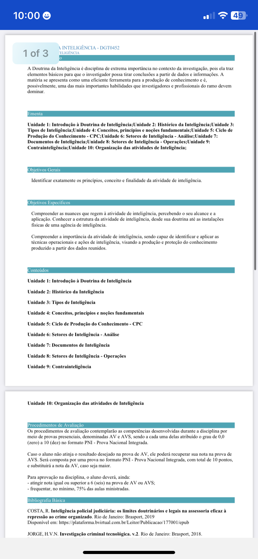 <p>10:00 49 INTELIGÊNCIA - DGT0452 1 of 3 A Doutrina da Inteligência é disciplina de extrema importância no contexto da investigação, pois ela traz elementos básicos para que o investigador possa tirar conclusões a partir de dados e informações. A matéria se apresenta como uma eficiente ferramenta para a produção de conhecimento e é, possivelmente, uma das mais importantes habilidades que investigadores e profissionais do ramo devem Ementa Unidade 1: Introdução à Doutrina de Inteligência;Unidade 2: Histórico da 3: Tipos de Inteligência;Unidade 4: Conceitos, princípios e noções fundamentais:Unidade 5: Ciclo de Produção do Conhecimento Unidade 6: Setores de Inteligência Unidade 7: Documentos de Inteligência; Unidade 8: Setores de Inteligência Unidade 9: Contrainteligência;Unidade 10: Organização das atividades de Inteligência; Objetivos Gerais Identificar exatamente os conceito e finalidade da atividade de inteligência. Objetivos Específicos Compreender as nuances que regem à atividade de inteligência, percebendo o seu alcance e a aplicação. Conhecer a estrutura da atividade de inteligência, desde sua doutrina até as instalações físicas de uma agência de inteligência Compreender a importância da atividade de inteligência, sendo capaz de identificar e aplicar as técnicas operacionais e ações de inteligência, visando a produção e proteção do conhecimento produzido a partir dos dados reunidos. Conteúdos Unidade 1: Introdução à Doutrina de Inteligência Unidade 2: Histórico da Inteligência Unidade 3: Tipos de Inteligência Unidade 4: princípios e noções fundamentais Unidade 5: de Produção do Conhecimento - CPC Unidade 6: Setores de Inteligência Análise Unidade 7: Documentos de Inteligência Unidade 8: Setores de Inteligência Operações Unidade 9: Contrainteligência Unidade 10: Organização das atividades de Inteligência Procedimentos de Avaliação Os procedimentos de avaliação contemplarão as competências desenvolvidas durante a disciplina por meio de provas presenciais, denominadas AV e AVS, sendo a cada uma delas atribuído o grau de 0,0 (zero) a 10 (dez) no formato PNI Prova Nacional Integrada. Caso o aluno não atinja o resultado desejado na prova de AV, ele poderá recuperar sua nota na prova de AVS. Será composta por uma prova no formato PNI Prova Nacional Integrada, com total de 10 pontos, e substituirá a nota da caso seja maior. Para aprovação na disciplina, o aluno deverá, ainda: atingir nota igual ou superior a 6 (seis) na prova de AV ou frequentar, no mínimo, 75% das aulas ministradas Bibliografia Básica COSTA. Inteligência policial judiciária: os limites doutrinários e legais na assessoria eficaz à repressão ao crime organizado. Rio de Janeiro: Brasport, 2019 Disponível em: H.V.N. Investigação criminal v.2. Rio de Janeiro: Brasport, 2018.</p>