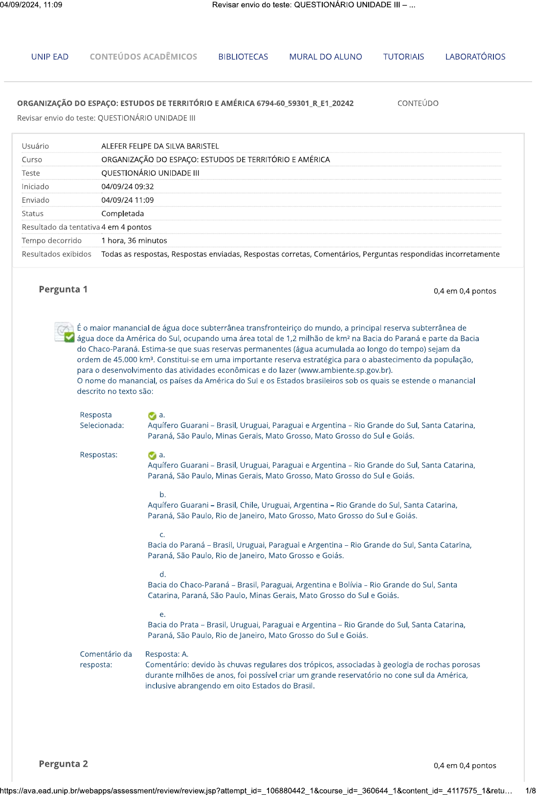 <p>04/09/2024, 11:09 Revisar envio do teste: QUESTIONÁRIO UNIDADE III UNIP EAD CONTEÚDOS ACADÊMICOS BIBLIOTECAS MURAL DO ALUNO TUTORIAIS LABORATÓRIOS ORGANIZAÇÃO DO ESPAÇO: ESTUDOS DE TERRITÓRIO E AMÉRICA 6794-60_59301_R_E1_20242 CONTEÚDO Revisar envio do teste: QUESTIONÁRIO UNIDADE III Usuário ALEFER FELIPE DA SILVA BARISTEL Curso ORGANIZAÇÃO DO ESPAÇO: ESTUDOS DE TERRITÓRIO E AMÉRICA Teste QUESTIONÁRIO UNIDADE III Iniciado 04/09/24 09:32 Enviado 04/09/24 11:09 Status Completada Resultado da tentativa 4 em 4 pontos Tempo decorrido 1 hora, 36 minutos Resultados exibidos Todas as respostas, Respostas enviadas, Respostas corretas, Comentários, Perguntas respondidas incorretamente Pergunta 1 0,4 em 0,4 pontos É o maior manancial de água doce subterrânea transfronteiriço do mundo, a principal reserva subterrânea de água doce da América do Sul, ocupando uma área total de 1,2 milhão de na Bacia do Paraná e parte da Bacia do Estima-se que suas reservas permanentes (água acumulada ao longo do tempo) sejam da ordem de 45.000 Constitui-se em uma importante reserva estratégica para o abastecimento da população, para o desenvolvimento das atividades econômicas e do lazer (www.ambiente.sp.gov.br). O nome do manancial, os países da América do Sul e os Estados brasileiros sob os quais se estende o manancial descrito no texto são: Resposta a. Selecionada: Aquífero Guarani Brasil, Uruguai, Paraguai e Argentina Rio Grande do Sul, Santa Catarina, Paraná, São Paulo, Minas Gerais, Mato Grosso, Mato Grosso do Sul e Respostas: a. Aquífero Guarani Brasil, Uruguai, Paraguai e Argentina Rio Grande do Sul, Santa Catarina, Paraná, São Paulo, Minas Gerais, Mato Grosso, Mato Grosso do Sul e b. Aquífero Guarani Brasil, Chile, Uruguai, Argentina Rio Grande do Sul, Santa Catarina, Paraná, São Paulo, Rio de Janeiro, Mato Grosso, Mato Grosso do Sul e C. Bacia do Paraná Brasil, Uruguai, Paraguai e Argentina Rio Grande do Sul, Santa Catarina, Paraná, São Paulo, Rio de Janeiro, Mato Grosso e d. Bacia do Chaco-Paraná Brasil, Paraguai, Argentina e Bolívia Rio Grande do Sul, Santa Catarina, Paraná, São Paulo, Minas Gerais, Mato Grosso do Sul e e. Bacia do Prata Brasil, Uruguai, Paraguai e Argentina Rio Grande do Sul, Santa Catarina, Paraná, São Paulo, Rio de Janeiro, Mato Grosso do Sul e Comentário da Resposta: A. resposta: Comentário: devido às chuvas regulares dos trópicos, associadas à geologia de rochas porosas durante milhões de anos, foi possível criar um grande reservatório no cone sul da América, inclusive abrangendo em oito Estados do Brasil. Pergunta 2 0,4 em 0,4 pontos 1/8</p><p>04/09/2024, 11:09 Revisar envio do teste: QUESTIONÁRIO UNIDADE III "Com um território equivalente ao do Estado do Pará e 25 milhões de habitantes, o Peru é o quarto maior país em superfície e o quinto em população na América Latina. Costuma-se dividi-lo em três regiões, correspondentes a três ecossistemas distintos: o litoral ou costa, a cordilheira ou sierra e o oriente ou selva" (Newton Carlos). 0 ECOSSISTEMAS EQUADOR BRASIL OCEANO PACÍFICO Lima costs ou ou Fonte: MAGNOLI et al. (1998). Marque a alternativa incorreta: Resposta d. Selecionada: No nordeste brasileiro ocorrem os distintos ecossistemas (litoral, agreste, sertão) que, com suas características climatobotânicas, econômicas e de ocupação do território, reproduzem os ecossistemas peruanos. Respostas: a. A costa é um domínio natural árido e semiárido, resultado da ação conjunta da corrente marinha fria de Humboldt e da presença da Cordilheira dos Andes. Nessa região, apesar das condições climáticas adversas, ocorre uma intensa e antiga ocupação agrícola em função da existência de verdadeiros oásis, mantidos por cursos d'água que descem dos Andes. b. A sierra corresponde às cordilheiras e altiplanos dos Andes, atravessa o país de norte a sul e sua altitude ameniza as temperaturas, alterando as condições de tropicalidade derivadas da latitude. Presença da indústria extrativa: zinco, cobre, C. A selva é drenada por um complexo sistema hidrográfico e tem grande parte de suas terras recobertas pela densa floresta equatorial. A exploração do petróleo é a principal atividade econômica formal. d. No nordeste brasileiro ocorrem os distintos ecossistemas (litoral, agreste, sertão) que, com suas características climatobotânicas, econômicas e de ocupação do território, reproduzem os ecossistemas peruanos. e. No Peru, os Andes se distinguem em três cadeias: a cordilheira ocidental, a cordilheira oriental e a cordilheira central. Marcada também pela presença da selva amazônica, a região é fundamentalmente uma planície. As principais diferenças de relevo nessa região são: montanha, selva alta e baixa. Comentário da Resposta: D. resposta: Comentário: no nordeste brasileiro, as diferenças climatobotânicas ocorrem no sentido longitudinal graças à influência do relevo de planaltos e chapadas. Já na costa peruana, as diferenças ocorrem pela altitude montanhosa dos Andes. 2/8</p><p>04/09/2024, 11:09 Revisar envio do teste: QUESTIONÁRIO UNIDADE III Pergunta 3 0,4 em 0,4 pontos A importância geopolítica do Canal do Panamá e o crescente fluxo de embarcações entre o Oceano Atlântico e o Oceano Pacífico exigem melhorias na infraestrutura desse canal. Assim, a responsabilidade por essas melhorias caberá: Resposta b. Selecionada: Ao próprio Panamá, uma vez que o domínio e o controle do canal passaram para esse país a partir do ano 2000. Respostas: a. Ao conjunto dos países que compõem a CARICOM (Comunidade do Caribe), dado o montante de recursos necessários. b. Ao próprio Panamá, uma vez que o domínio e o controle do canal passaram para esse país a partir do ano 2000. Aos EUA, pois é o país que tem o principal interesse geopolítico na região, além de manter o controle do canal. d. Ao governo panamenho em associação com a Colômbia e a Costa Ric