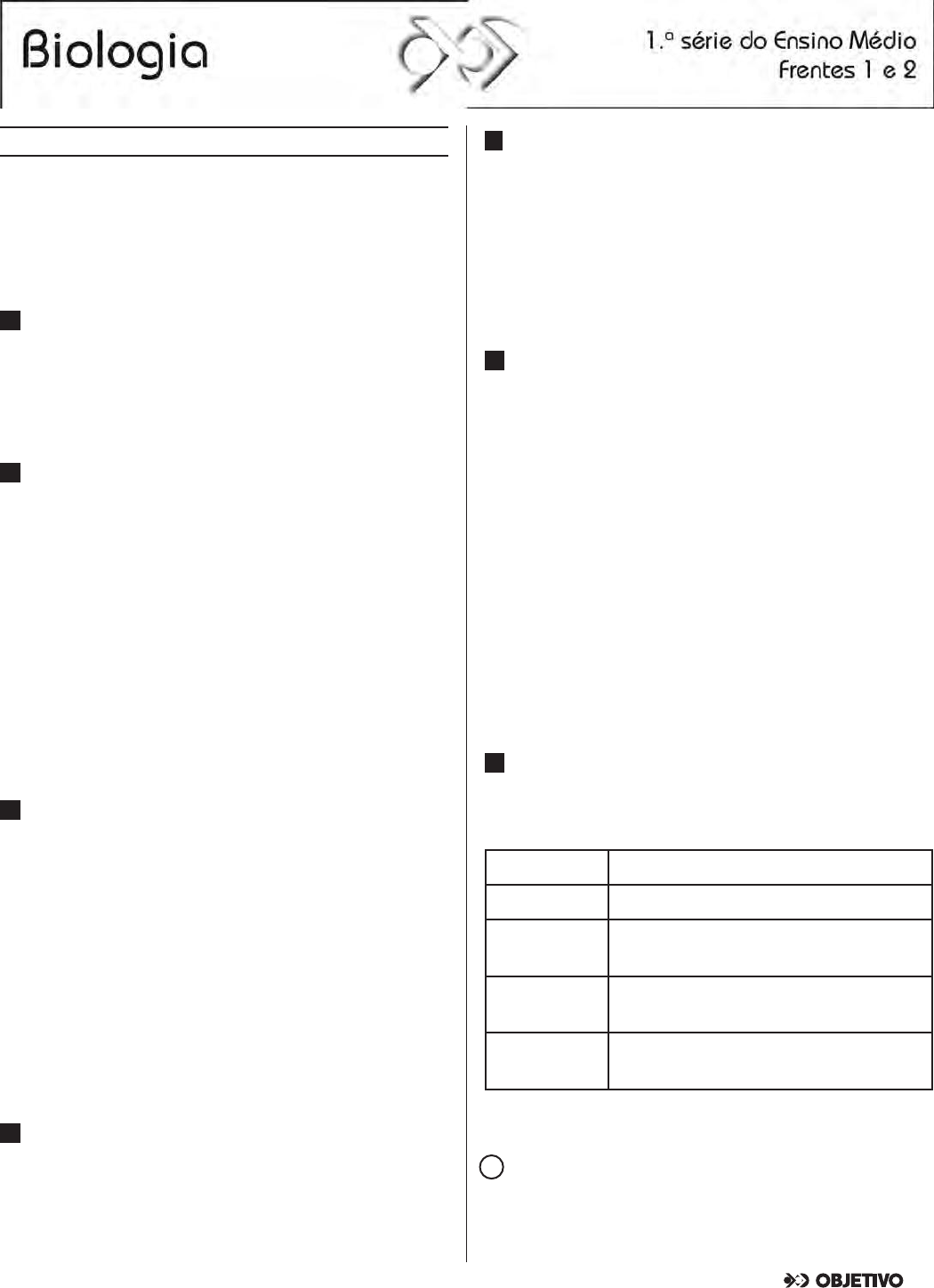 – 1 AULA 1 – FRENTE 1 Roteiro de estudo A biodiversidade O reino Monera Exercícios propostos 1 Em 1969, Whittaker dividiu os seres vivos em cinco reinos. Cite-os. Monera, Protista, Fungi, Plantae e Animalia. 2 O reino Monera inclui dois tipos de organismos primitivos. a) Cite duas características dos representantes do reino Monera. Organismos unicelulares e procariontes, ou seja, com material nuclear cons- tituído por uma molécula de DNA não envolvida por membrana. b) Quais são os dois tipos de organismos incluídos nesse reino? Bactérias e cianofíceas. 3 Em relação às bactérias, responda: a) Como são classificadas em relação à forma da célula? Cocos – esféricas Bacilos – bastonetes Vibriões – em forma de vírgula Espirilos – espiraladas b) Como se reproduzem? Cissiparidade – bipartição Conjugação – troca de material genético 4 Cite quatro doenças humanas que são causadas por bactérias. Tuberculose, sífilis, tétano e meningite. 5 Na taxonomia ou sistemática dos seres vivos, existem sete categorias de classificação. Cite-as na sequência da mais simples para a mais complexa. Espécie – gênero – família – ordem – classe – filo – reino 6 Em relação à nomenclatura científica, responda: a) No que consiste a nomenclatura binominal de uma espécie? Toda espécie apresenta dois nomes: o primeiro referente ao gênero e o segundo, à espécie. b) Como deve ser escrito o nome científico? Deve ser escrito em latim e em itálico ou grifado. 7 O sistema de classificação do seres vivos, proposto por Whittaker em 1969, agrupa os organismos em cinco reinos, de acordo com as características apresentadas a seguir: Monera procariontes Protista eucariontes unicelulares Plantae eucariontes multicelulares autótrofos fotossintetizantes Fungi eucariontes multicelulares com nutrição heterótrofa absortiva Animalia eucariontes multicelulares com nutrição heterótrofa ingestiva De acordo com essa proposta, sapo, bactéria, pinheiro e cogumelo são classificados, respectivamente, em a) Animalia, Monera, Plantae e Fungi. b) Animalia, Monera, Fungi e Plantae. c) Animalia, Plantae, Protista e Monera. d) Fungi, Animalia, Plantae e Monera. e) Monera, Animalia, Plantae e Protista. p_bio_1a2b.indd 1 30/4/2011 09:03:12 2 – 8 Se um ser vivo for formado por uma célula proca- riótica, ele 1 – não apresentará envoltório nuclear; 2 – poderá ser uma bactéria; 3 – não apresentará parede celular; 4 – apresentará ribossomos e lisossomos; 5 – não apresentará nucléolo nem mitocôndrias. Quais são as afirmações corretas? a) 1, 2 e 3. d) 3, 4 e 5. b) 1, 2 e 5. e) 1, 2, 3, 4 e 5. c) 1, 3 e 5. 9 Em algumas bactérias, a transferência do material genético através de pontes citoplasmáticas é uma reprodução do tipo a) transformação. d) esporulação. b) conjugação. e) cissiparidade. c) transdução. 10 Com relação ao nome científico do crustáceo Diacyclops bicuspidatus thomasi e às regras de nomenclatura biológica, é incorreto afirmar que a) a espécie é sempre referida de forma trinominal. b) o nome da espécie deve ser destacado em itálico ou sublinhado. c) Diacyclops é nome genérico e deve se escrito com inicial maiúscula. d) Thomasi é categoria taxonômica inferior a bicuspidatus. e) Bicuspidatus é o nome específico escrito sempre com inicial minúscula. 11 A respeito de um determinado grupo de organismos, conhecem-se as seguintes características: – Não possuem reprodução sexuada. – São capazes de utilizar o nitrogênio atmosférico. – Realizam a fotossíntese. – Não apresentam plastos. Esses seres são a) clorofíceas. d) briófitas. b) liquens. e) fungos. c) cianofíceas. 12 A bactéria causadora da tuberculose é a Mycobacterium tuberculosis, que, como todo ser procarionte, apresenta as seguintes características: a) parede celular, membrana plasmática, nucleoide e ribossomos. b) apenas membrana plasmática, nucléolo e uma molécula de DNA. c) cápsula externa, membrana nuclear e uma rede citoplasmática de plasmídios. d) apenas parede celular de celulose, citoplasma e nucleoplasma. e) capsídio, retículo endoplasmático e vacúolo digestivo. 13 Sobre as cianofíceas, é incorreto afirmar que a) não possuem núcleo individualizado. b) possuem clorofila como pigmento fotossintetizante. c) possuem cromoplastos. d) a reprodução é somente assexuada. e) são unicelulares ou coloniais. 14 Analise os itens propostos, relacionados com as bactérias. I. São organismos rudimentares, que fazem parte do rei- no Protista. II. São unicelulares e não revelam núcleo individualizado. III. Algumas são autótrofas, realizando fotossíntese e quimiossíntese. IV. Os cocos, vibriões, espirilos e bacilos são seus tipos morfológicos mais comuns. V. Transferem seu material genético por conjugação. Assinale: a) se I, III e V estiverem corretas. b) se II, III e IV estiverem corretas. c) se I, II, III e IV estiverem corretas. d) se apenas I estiver correta. e) se todas estiverem corretas. 15 Dentre os diversos tipos de algas, há um grupo que não apresenta núcleo diferenciado e plastos nas células. Trata-se do grupo das a) crisofíceas. d) cianofíceas. b) clorofíceas. e) rodofíceas. c) feofíceas. Exercícios complementares 1 Modernamente, os seres vivos são divididos em três domínios. Cite-os e caracterize-os. Archaea – arqueobactérias Bacteria – bactérias normais Eukaria – protistas, fungos, plantas e animais 2 A unidade básica da taxonomia é a espécie. Como a espécie pode ser definida? Conjunto de indivíduos semelhantes que se cruzam e produzem descenden- tes férteis. 3 Como ocorre a nutrição das bactérias? As autótrofas realizam fotossíntese e quimiossíntese. As heterótrofas são decompositoras (saprófitas) e parasitas. 4 Em relação às cianobactérias, responda: a) Que pigmentos apresentam? Clorofila e ficocianina. p_bio_1a2b.indd 2 30/4/2011 09:03:13 – 3 b) Qual