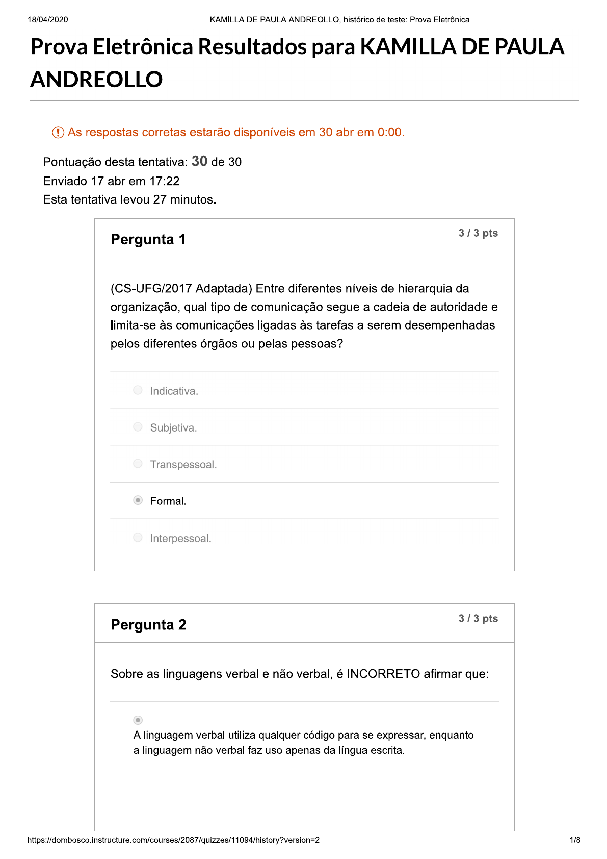 <p>18/04/2020 KAMILLA DE PAULA ANDREOLLO, histórico de teste: Prova Eletrônica Prova Eletrônica Resultados para KAMILLA DE PAULA ANDREOLLO ! As respostas corretas estarão disponíveis em 30 abr em 0:00. Pontuação desta tentativa: 30 de 30 Enviado 17 abr em 17:22 Esta tentativa levou 27 minutos. 3/3 pts Pergunta 1 (CS-UFG/2017 Adaptada) Entre diferentes níveis de hierarquia da organização, qual tipo de comunicação segue a cadeia de autoridade e limita-se às comunicações ligadas às tarefas a serem desempenhadas pelos diferentes órgãos ou pelas pessoas? Indicativa. Subjetiva. Transpessoal. Formal. Interpessoal. 3 / 3 pts Pergunta 2 Sobre as linguagens verbal e não verbal, é INCORRETO afirmar que: A linguagem verbal utiliza qualquer código para se expressar, enquanto a linguagem não verbal faz uso apenas da língua escrita. https://dombosco.instructure.com/courses/2087/quizzes/11094/history?version=2 1/8</p><p>18/04/2020 KAMILLA DE PAULA ANDREOLLO, histórico de teste: Prova Eletrônica Linguagem verbal e não verbal, quando simultâneas, colaboram para o entendimento do Linguem não verbal pode incluir sons, imagens expressões e gestos, por exemplo. A linguagem não verbal é aquela que utiliza qualquer código que não seja a palavra, enquanto a linguagem verbal utiliza a língua, seja oral ou escrita, para estabelecer comunicação. São utilizadas para criar atos de comunicação que nos permitem dizer algo. 3/3 pts Pergunta 3 (UDESC 2009) Assinale a alternativa correta em relação ao acento grave indicativo de crase estabelecido pela norma culta da língua Mas o boi continua sobre às pernas, mais duro que o samburá de cipó, os olhos de carvão imóveis e tristes À vista dos samburás com uns mirrados peixinhos, a comunidade se entristecia As mulheres de saias domingueiras, algumas com o filho no colo, ficavam à espreitar os maridos 2/8</p><p>18/04/2020 KAMILLA DE PAULA ANDREOLLO, histórico de teste: Prova Eletrônica Depois o boi adoeceu; ficou caído, à moscas, imóvel e rijo na sua armação de bambu verde Naquela época, a morte de um pescador por sezão cheirava à ironia na vila 3/3 pts Pergunta 4 (TJ-AP/2014) A comunicação interna tem atualmente uma grande importância nas empresas e nas instituições. objetivo é: ser a inconteste da direção da empresa em todos os momentos. fazer somente as propagandas internas para a divulgação da organização. fundamentalmente providenciar a redação de memorandos e circulares. unificar os discursos, dentro da organização, voltados para o público interno meramente informar aos trabalhadores as atividades da empresa ou instituição. 3/3 pts Pergunta 5 https://dombosco.instructure.com/courses/2087/quizzes/11094/history?version=2 3/8</p><p>18/04/2020 KAMILLA DE PAULA ANDREOLLO, histórico de teste: Prova Eletrônica (FUMARC/2013 Adaptada) Sobre a Redação Oficial, É INCORRETO afirmar que: sua finalidade básica é comunicar com impessoalidade e máxima clareza. exige emprego do padrão formal de linguagem. não deve ser longa demais a ponto de ser prolixa. deve permitir uma única interpretação e ser estritamente impessoal. dispensa a formalidade de tratamento, uma vez que o comunicador e o receptor são o Serviço Público. 3/3 pts Pergunta 6 (FCC/2010) As interferências que podem prejudicar a comunicação interpessoal são: diferenças profissionais, evitar julgamentos e respeitar opiniões diferentes. ouvir com atenção, praticar a empatia e a assertividade. descrédito no assunto, pronunciar as palavras corretamente e evitar estereótipos. diferenças culturais, pressão do tempo e falta de interesse no assunto. diferenças de idade, agressividade e colocar-se no lugar do outro. https://dombosco.instructure.com/courses/2087/quizzes/11094/history?version=2 4/8</p><p>18/04/2020 KAMILLA DE PAULA ANDREOLLO, histórico de teste: Prova Eletrônica Pergunta 7 3 /3 pts (FCC/2007) É preciso suprimir um ou mais sinais de crase em: À falta de coisa melhor para fazer muita gente assiste à televisão sem sequer atentar para o que está vendo Quem acha que agracia à juventude de hoje com elogios ao seu pragmatismo não está à salvo de ser o responsável pela frustração de toda uma geração Compreenda-se quem aspira à estabilidade de um emprego, mas prestem-se todas as homenagens que cultiva seus sonhos Os sonhos não se adquirem à vista: custa tempo para se elaborar dentro de nós a matéria de que são feitos, às vezes à revelia de nós mesmos Cabe à juventude de hoje dedicar-se à substituição dos apelos do mercado por impulsos que, em sua verdade natural, façam jus à capacidade humana de sonhar Pergunta 8 3/3 pts Uma das características de um memorando é: 5/8</p><p>18/04/2020 KAMILLA DE PAULA ANDREOLLO, histórico de teste: Prova Eletrônica poder ser usado tanto para comunicação externa quanto interna. ter seus despachos feitos em outra folha de papel, própria para essa finalidade. ser utilizado apenas como comunicação entre unidades administrativas do mesmo nível hierárquico. poder tratar de assuntos administrativos ou expor projetos, ideias ou diretrizes. designar, do destinatário, apenas o nome e o sobrenome. 3/3 pts Pergunta 9 Analise o cartum e responda à questão: S L D CAULOS Só doi quando eu respiro. Porto Alegre: 2001. No cartum apresentado, o significado da palavra escrita é reforçado pelos elementos visuais, próprios da linguagem não verbal. A 6/8</p><p>18/04/2020 KAMILLA DE PAULA ANDREOLLO, histórico de teste: Prova Eletrônica separação das letras da palavra em balões distintos contribui para expressar principalmente a seguinte ideia: desconhecimento das possibilidades de diálogo. desencontro de pensamentos sobre um assunto. dificuldade de conexão entre as pessoas. aceleração da vida na individual. desatenção com o trânsito. Pergunta 10 3/3 pts (Funiversa/2012) O papel administrativo interpessoal de ligação: decide a quem atribuir recursos. Prog
