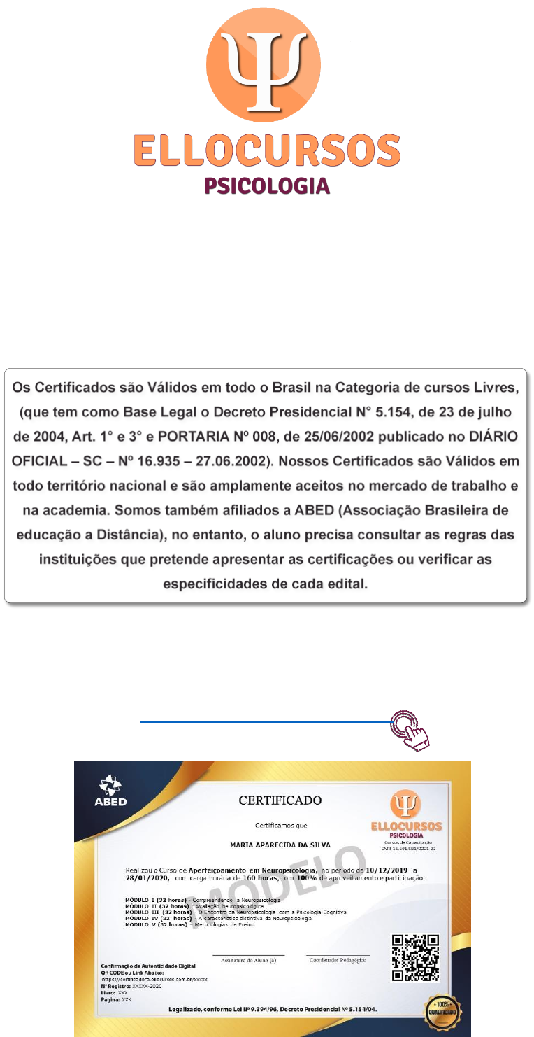 <p>Curso de Capacitação e Aperfeiçoamento</p><p>em Transtorno de Déficit de Atenção com</p><p>Hiperatividade - TDAH</p><p>Se ainda não adquiriu o CERTIFICADO de 180 HORAS pelo valor</p><p>promocional de R$ 57,00. Clique no link abaixo e adquira!</p><p>https://bit.ly/2zbNYiQ</p><p>Sumário</p><p>1 Introdução ao TDAH ........................................................................................................... 3</p><p>✓ Impulsividade .............................................................................................................. 4</p><p>✓ Sobre a desorganização ............................................................................................ 6</p><p>✓ TDAH e Hiperatividade .............................................................................................. 7</p><p>2 Diferentes Formas de TDAH .............................................................................................. 7</p><p>✓ Sinais de TDAH desparecendo após a adolescência ............................................. 8</p><p>✓ O fator mais importante é o hereditário? .................................................................. 9</p><p>✓ Frequência de ocorrências do TDAH........................................................................ 9</p><p>3 Diagnóstico ........................................................................................................................ 10</p><p>✓ Sinais de Hiperatividade mencionados no DSM-V ................................................ 11</p><p>✓ Sinais de Impulsividade de acordo com o DSM-V................................................. 12</p><p>4 Exigências da Associação Psiquiátrica Americana para se diagnosticar o TDAH ..... 13</p><p>5 Como o TDAH é considerado hoje .................................................................................. 13</p><p>6 Tratamento ........................................................................................................................ 15</p><p>7 Fatores Externos ............................................................................................................... 18</p><p>8 Fatores Genéticos ............................................................................................................. 19</p><p>9 Tipos de TDAH .................................................................................................................. 22</p><p>✓ Etiologia ..................................................................................................................... 23</p><p>✓ Multidisciplinaridade ................................................................................................. 25</p><p>Referencias ........................................................................................................................... 27</p><p>1 Introdução ao TDAH</p><p>A primeira descrição oficial do que hoje chamamos TDAH data de 1902,</p><p>quando um pediatra inglês, George Still, apresentou casos clínicos de crianças</p><p>com hiperatividade e outras alterações de comportamento, que na sua opinião</p><p>não podiam ser explicadas por falhas educacionais ou ambientais, mas que</p><p>deveriam ser provocadas por algum transtorno cerebral na época desconhecido</p><p>Algumas das denominações com as quais se conheceu esse mesmo</p><p>transtorno foram: síndrome da criança hiperativa, lesão cerebral mínima,</p><p>disfunção cerebral mínima, transtorno hipercinético, transtorno primário da</p><p>atenção.</p><p>O TDAH é um transtorno neurobiológico, com grande participação</p><p>genética (isto é, existem chances maiores de ele ser herdado), que tem início na</p><p>infância e que pode persistir na vida adulta, comprometendo o funcionamento da</p><p>pessoa em vários setores de sua vida, e se caracteriza por três grupos de</p><p>alterações: hiperatividade, impulsividade e desatenção.</p><p>Hiperatividade é o aumento da atividade motora. A pessoa hiperativa é</p><p>inquieta e está quase constantemente em movimento. Quando se trata de</p><p>criança, os professores descrevem que ela se levanta da carteira a todo instante,</p><p>mexe com um ou com outro, fala muito. Parece que é elétrica, ou que está com</p><p>um motorzinho ligado o tempo todo.</p><p>Raramente consegue ficar sentada, mas se é obrigada a permanecer</p><p>sentada, se revira, bate com os pés, mexe com as mãos, ou então acaba</p><p>adormecendo. Dificilmente consegue se interessar por uma brincadeira em que</p><p>tenha que ficar quieta, mas está sempre correndo, subindo em móveis, árvores,</p><p>e frequentemente em locais perigosos. Uma criança mais hiperativa nem mesmo</p><p>para comer consegue sentar, quanto mais para assistir a um programa de</p><p>televisão, ler um livro ou uma revista.</p><p>Adolescentes e adultos hiperativos costumam se mostrar de forma um</p><p>pouco diferente das crianças, pois é próprio dessas idades mais avançadas uma</p><p>redução normal da atividade motora. Então, muitas vezes o que predomina no</p><p>adolescente e no adulto é uma sensação interna de inquietação, ou eles se</p><p>mostram sempre ocupados com alguma coisa, dando a impressão de estarem</p><p>sempre muito atarefados, quando na verdade o que ocorre é uma dificuldade em</p><p>diminuir o nível de atividade. Adultos têm dificuldade em sair de férias, ou</p><p>comumente se ocupam com várias atividades ao mesmo tempo, na maior parte</p><p>das vezes sem conseguir completar nenhuma delas</p><p>A Hiperatividade é sinônimo de TDAH? Não, a rigor, hiperatividade</p><p>significa apenas o aumento da atividade motora, que pode ser encontrada em</p><p>diversos transtornos psíquicos, como o autismo, o transtorno bipolar e em certos</p><p>quadros ansiosos. A hiperatividade também pode ocorrer em decorrência de</p><p>certas doenças físicas (por exemplo, o hipertireoidismo), mas raramente pode</p><p>