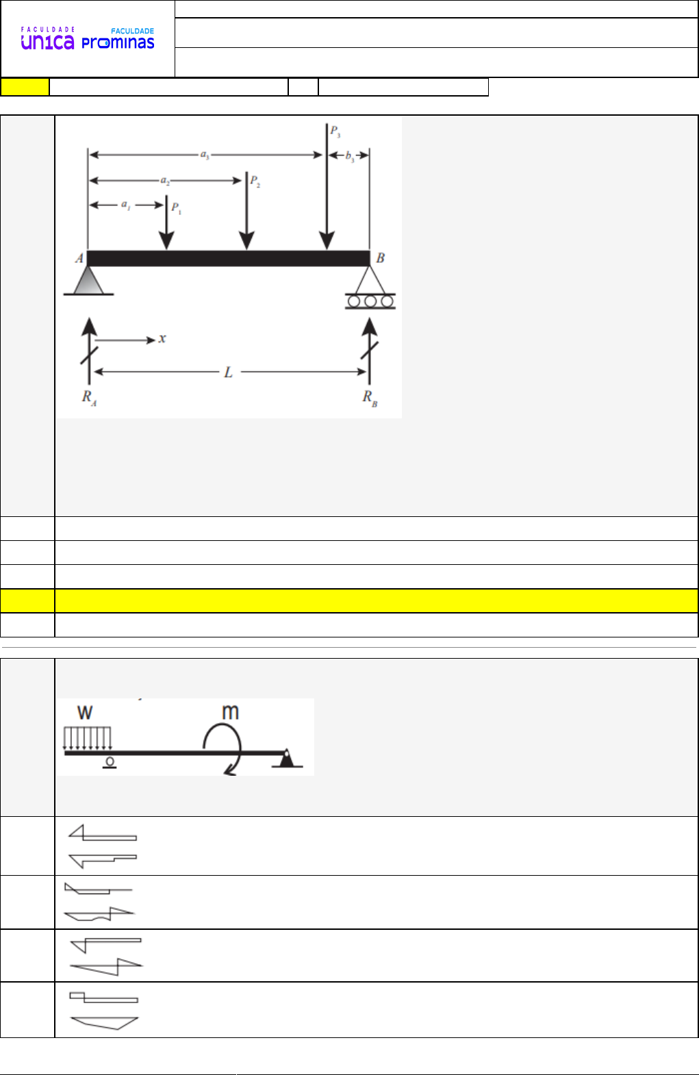 <p>04/09/2024 12:44:48 1/4</p><p>REVISÃO DE SIMULADO</p><p>Nome:</p><p>CHRISTIAN ADRIANO PONCEANO</p><p>Disciplina:</p><p>Sistemas Estruturais II</p><p>Respostas corretas são marcadas em amarelo X Respostas marcardas por você.</p><p>Questão</p><p>001</p><p>Fonte: GERE, J. M. Mecânica dos Materiais, 5. ed. São Paulo: Cengage Learning, 2011</p><p>Na figura em questão, tem-se uma viga de comprimento L com dois apoios, A e B. As</p><p>cargas aplicadas P são concentradas, sendo P3 > P2 > P1. As distâncias a e b, são</p><p>escalonadas de tal forma: a3 > a2 > a1 > b3. Baseando-se nessas informações, o</p><p>momento fletor de maior módulo, ou seja, momento fletor máximo, está em:</p><p>X A) Apoio A</p><p>B) Força de reação R2</p><p>C) Ponto de carga P1</p><p>D) Ponto de carga P2</p><p>E) Apoio B</p><p>Questão</p><p>002 Uma viga foi submetida a uma carga distribuída de módulo W a um momento extremo</p><p>m, como observado na Figura.</p><p>A seguir, assinale a alternativa que represente, respectivamente, o diagrama de esforço</p><p>cortante e momento fletor:</p><p>A)</p><p>X B)</p><p>C)</p><p>D)</p><p>04/09/2024 12:44:48 2/4</p><p>E)</p><p>Questão</p><p>003 Considere o diagrama de esforço cortante a seguir:</p><p>Atribuindo que todas as forças atuantes sobre ele são expressas em kN, avalie as</p><p>afirmações dadas:</p><p>A. No apoio D, existe uma reação vertical de 80 kN.</p><p>B. Entre C e E, o formato do diagrama de momento fletor é uma parábola de segundo</p><p>grau.</p><p>C. Entre A e B, há uma carga distribuída de forma uniforme de 20 kN/m.</p><p>D. O momento fletor máximo está localizado em D.</p><p>Estão corretas:</p><p>X A) A e B.</p><p>B) A, C e D.</p><p>C) A, B e D.</p><p>D) C e D.</p><p>E) B e C.</p><p>04/09/2024 12:44:48 3/4</p><p>Questão</p><p>004 (ADAPTADO DE ENADE, 2023). Para ser um bom executante de projetos estruturais, um</p><p>engenheiro deve ler e interpretar projetos. Isso resulta em uma execução segura,</p><p>durável, correta e com garantia. Observe a seguir um projeto de uma edificação, nele</p><p>há o detalhamento de uma viga de comprimento L, expressa em metros, também há a</p><p>representação do diagrama do seu momento fletor, expresso em kN/m.</p><p>De acordo com as informações apresentadas, pode-se afirmar que a principal função da</p><p>armadura longitudinal, que se localiza na parte inferior, será:</p><p>A) Combater a força normal atuante na viga.</p><p>X B) Combater o momento fletor negativo atuante na viga.</p><p>C) Combater o momento torsor atuante na viga.</p><p>D) Combater a força cortante atuante na viga.</p><p>E) Combater o momento fletor positivo atuante na viga.</p><p>Questão</p><p>005 (CESGRANRIO – 2011) A lei de Hooke, a respeito dos corpos elásticos submetidos a</p><p>tensão, enuncia-se como:</p><p>Alternativas</p><p>A) A tensão de cisalhamento deforma apenas a superfície do corpo.</p><p>B) A temperatura aumentando, diminui a deformação para dada tensão.</p><p>C) A tração provoca deformação maior que a compressão.</p><p>X D) tensão é diretamente proporcional à deformação.</p><p>E) A temperatura aumentando, diminui a tensão necessária para obter certa deformação.</p><p>Questão</p><p>006 Qual é a conclusão correta sobre o trabalho virtual realizado pelo sistema de forças em</p><p>equilíbrio sobre um ponto material?</p><p>A) O trabalho virtual é sempre negativo, independentemente do deslocamento virtual.</p><p>B) O trabalho virtual é diretamente proporcional à massa do ponto material.</p><p>X C) O trabalho virtual é sempre positivo, independentemente do deslocamento virtual.</p><p>D) O trabalho virtual é nulo para qualquer deslocamento virtual arbitrário imposto.</p><p>E) O trabalho virtual é inversamente proporcional à resultante das forças no sistema.</p><p>04/09/2024 12:44:48 4/4</p><p>Questão</p><p>007 Para os corpos rígidos, em relação aos trabalhos virtuais, assinale a alternativa correta.</p><p>A) "Para um corpo rígido em estado de desorganização, a soma algébrica dos trabalhos</p><p>virtuais de todas as forças (reais) que agem sobre ele é negativa, para todos os</p><p>deslocamentos virtuais arbitrários (compatíveis com os vínculos do corpo) que lhe</p><p>impusermos."</p><p>B) "Para um corpo rígido em estado de equilíbrio, a soma algébrica dos trabalhos virtuais</p><p>de todas as forças (reais) que agem sobre ele é negativa, para todos os deslocamentos</p><p>virtuais arbitrários (compatíveis com os vínculos do corpo) que lhe impusermos."</p><p>X C) "Para um corpo rígido em estado de desorganização, a soma algébrica dos trabalhos</p><p>virtuais de todas as forças (reais) que agem sobre ele é unitária, para todos os</p><p>deslocamentos virtuais arbitrários (compatíveis com os vínculos do corpo) que lhe</p><p>impusermos."</p><p>D) "Para um corpo rígido em estado de equilíbrio, a soma algébrica dos trabalhos virtuais</p><p>de todas as forças (reais) que agem sobre ele é unitária, para todos os deslocamentos</p><p>virtuais arbitrários (compatíveis com os vínculos do corpo) que lhe impusermos."</p><p>E) "Para um corpo rígido em estado de equilíbrio, a soma algébrica dos trabalhos virtuais</p><p>de todas as forças (reais) que agem sobre ele é nula, para todos os deslocamentos</p><p>virtuais arbitrários (compatíveis com os vínculos do corpo) que lhe impusermos."</p><p>Questão</p><p>008 Ao considerarmos o trabalho virtual W realizado pelo conjunto de forças Pi que atuam</p><p>sobre o ponto m quando ele sofre o deslocamento virtual δ, temos que</p><p>A) W= R â��â��δ â��=10.</p><p>B) W= R â��â��δ â��=0.</p><p>C) W= R â��â��δ â��=1.</p><p>X D) nenhuma das alternativas.</p><p>E) W= R â��â��δ â��=11.</p>