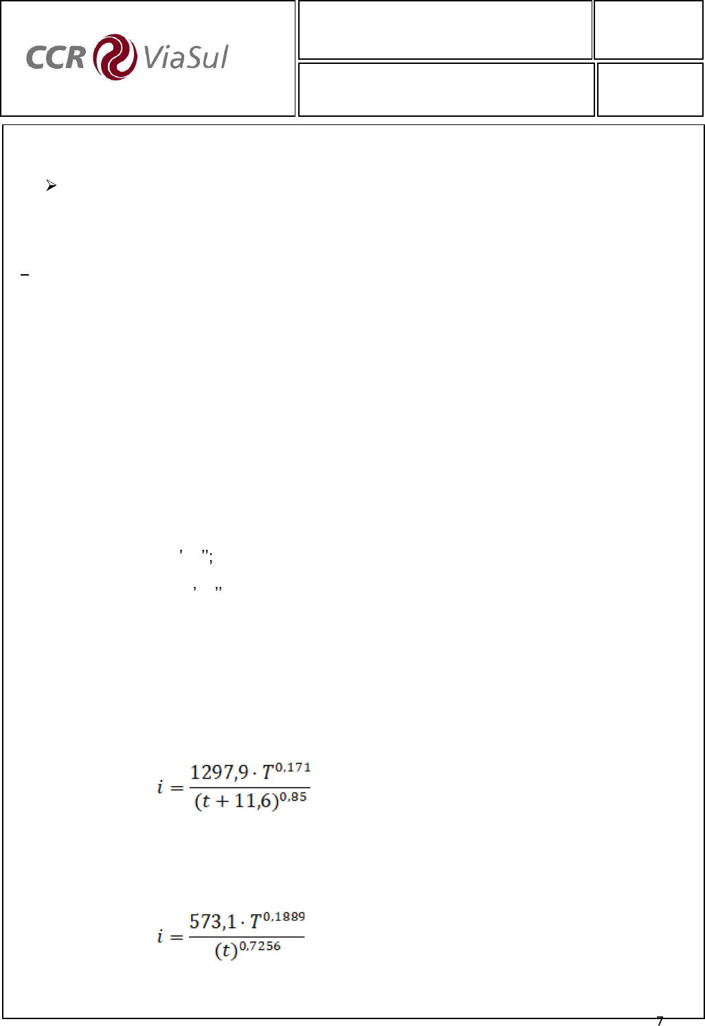 <p>Código interno:</p><p>VS-BR386/RS-0325.40-DRE-A1-DR/MD. B-201</p><p>Rev.:</p><p>0</p><p>Código ANTT:</p><p>VSL-BR386RS-325-345-DRE-ANT-MD-H1-201-R0</p><p>Folha:</p><p>7 de 92</p><p>Equação de chuvas intensas</p><p>Foi utilizada a equação IDF definida no Atlas Pluviométrico do Brasil, publicação do CPRM</p><p>Serviços Geológicos do Brasil, ano de 2015, que foi definida a partir da estação</p><p>pluviográfica denominada Porto Alegre.</p><p>Os dados para definição da equação IDF foram obtidos a partir dos registros históricos de</p><p>um pluviógrafo modelo IH, operado pelo INMET (Instituto Nacional de Meteorologia), no</p><p>período de setembro de 1974 a dezembro de 2014.</p><p>Posto Porto Alegre:</p><p>- Códigos: 03051011 (ANA) e 83967 (INMET);</p><p>- Município: Porto Alegre;</p><p>- Latitude: 30°03 13</p><p>- Longitude: 51°10 24 ;</p><p>- Altitude: 47,00.</p><p>As equações IDF (intensidade, duração e frequência) definidas foram as seguintes:</p><p>Para durações menores que 120 minutos:</p><p>Para durações maiores ou iguais a 120 minutos:</p><p>Código interno:</p><p>VS-BR386/RS-0325.40-DRE-A1-DR/MD. B-201</p><p>Rev.:</p><p>0</p><p>Código ANTT:</p><p>VSL-BR386RS-325-345-DRE-ANT-MD-H1-201-R0</p><p>Folha:</p><p>8 de 92</p><p>Onde:</p><p>i = intensidade pluviométrica média máxima, em mm por hora;</p><p>T = período de recorrência, em anos;</p><p>t = duração da precipitação pluviométrica, em minutos.</p><p>A tabela seguinte indica as intensidades, em mm/h, calculadas para várias durações e</p><p>diferentes períodos de recorrência.</p><p>Código interno:</p><p>VS-BR386/RS-0325.40-DRE-A1-DR/MD. B-201</p><p>Rev.:</p><p>0</p><p>Código ANTT:</p><p>VSL-BR386RS-325-345-DRE-ANT-MD-H1-201-R0</p><p>Folha:</p><p>9 de 92</p><p>4. METODOLOGIA DOS ESTUDOS HIDROLÓGICOS</p><p>As vazões de verificação da capacidade hidráulica das travessias dos cursos</p><p>foram definidas através da seguinte metodologia:</p><p>MÉTODO ÁREA DE DRENAGEM (km2)</p><p>Racional Área 4,00</p><p>Racional Corrigido 4,00 10,00</p><p>Hidrograma Unitário, do U.S. Soil Conservation Service 10,00 50,00</p><p>4.1 Método Racional</p><p>O cálculo da vazão de dimensionamento é baseado na fórmula Racional:</p><p>Onde:</p><p>Q = Vazão (m3/s);</p><p>c = Coeficiente de escoamento superficial (adimensional);</p><p>A = Área de drenagem (ha);</p><p>i = Intensidade pluviométrica (mm/min).</p><p>6</p><p>.. Aic</p><p>Q</p><p>Código interno:</p><p>VS-BR386/RS-0325.40-DRE-A1-DR/MD. B-201</p><p>Rev.:</p><p>0</p><p>Código ANTT:</p><p>VSL-BR386RS-325-345-DRE-ANT-MD-H1-201-R0</p><p>Folha:</p><p>10 de 92</p><p>Coeficiente de escoamento superficial</p><p>Para a determinação do coeficiente, são levadas em consideração as características</p><p>físicas da bacia, bem como o tipo de solo da região. No quadro a seguir são</p><p>apresentados os critérios e valores dos coeficientes de escoamento superficial de</p><p>projeto.</p><p>Código interno:</p><p>VS-BR386/RS-0325.40-DRE-A1-DR/MD. B-201</p><p>Rev.:</p><p>0</p><p>Código ANTT:</p><p>VSL-BR386RS-325-345-DRE-ANT-MD-H1-201-R0</p><p>Folha:</p><p>11 de 92</p><p>VALORES DOS COEFICIENTES DE ESCOAMENTO SUPERFICIAL (RUNOFF)</p><p>Tipo de Área de Drenagem Coeficiente C</p><p>Áreas Comerciais</p><p>Áreas centrais 0,70 0,95</p><p>Áreas de bairros 0,50 0,70</p><p>Áreas Residenciais</p><p>Residenciais isoladas 0,35 0,50</p><p>Unidades múltiplas, separadas 0,40 0,60</p><p>Unidades múltiplas, conjugadas 0,60 0,75</p><p>Áreas com lotes de 2.000 m2 ou maiores 0,30 0,45</p><p>Áreas suburbanas 0,25 0,40</p><p>Áreas com prédios de apartamentos 0,50 0,70</p><p>Áreas Industriais</p><p>Área com ocupação esparsa 0,50 0,80</p><p>Área com ocupação densa 0,60 0,90</p><p>Ruas</p><p>Revestimento asfáltico 0,70 0,95</p><p>Revestimento de concreto 0,80 0,95</p><p>Revestimento primário 0,70 0,85</p><p>Parques e cemitérios 0,10 0,25</p><p>Áreas sem Melhoramentos</p><p>Solo arenoso, declividade baixa < 2 % 0,05 0,10</p><p>Solo arenoso, declividade média entre 2 % e</p><p>7%</p><p>0,10 0,15</p><p>Solo arenoso, declividade alta > 7 % 0,15 0,20</p><p>Solo argiloso, declividade baixa < 2 % 0,15 0,20</p><p>Solo argiloso, declividade média entre 2 % e</p><p>7%</p><p>0,20 0,25</p><p>Solo argiloso, declividade alta > 7 % 0,25 0,30</p><p>Código interno:</p><p>VS-BR386/RS-0325.40-DRE-A1-DR/MD. B-201</p><p>Rev.:</p><p>0</p><p>Código ANTT:</p><p>VSL-BR386RS-325-345-DRE-ANT-MD-H1-201-R0</p><p>Folha:</p><p>12 de 92</p><p>Tempo de Concentração</p><p>California</p><p>Highways and Public Roads (Kirpich) , expressa por:</p><p>385,0</p><p>2</p><p>.57</p><p>eq</p><p>tc</p><p>I</p><p>L</p><p>Onde:</p><p>tc = Tempo de concentração (min);</p><p>L = Comprimento do talvegue (km);</p><p>Ieq = Declividade média do talvegue (m/km).</p><p>Intensidade Pluviométrica</p><p>A intensidade pluviométrica para cada bacia hidrográfica foi calculada a partir da</p><p>aplicação da equação de chuva válida para a área em estudo, conforme apresentadas</p><p>no capítulo 3.1 e considerando a duração da chuva igual ao tempo de concentração.</p><p>Período de recorrência</p><p>Foi utilizado o período de recorrência de 100 anos para determinação das vazões de</p><p>projeto sob as pontes, conforme preconizado nos critérios de projeto do DNIT.</p>