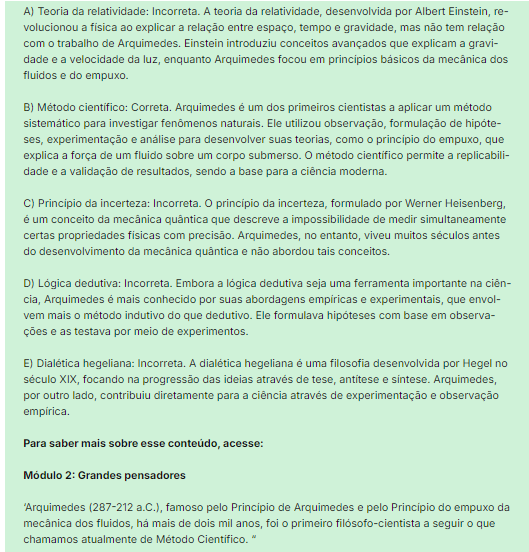 <p>A) Teoria da relatividade: Incorreta. A teoria da relatividade, desenvolvida por Albert Einstein, re- volucionou a ao explicar a relação entre espaço, tempo e gravidade, mas não tem relação com trabalho de Arquimedes. Einstein introduziu conceitos avançados que explicam a gravi- dade e a velocidade da luz, enquanto Arquimedes focou em principios básicos da mecânica dos fluidos e do empuxo. B) Método Correta. Arquimedes é um dos primeiros cientistas a aplicar um método sistemático para investigar fenômenos Ele utilizou observação, formulação de hipóte- ses, experimentação e análise para desenvolver suas teorias, como principio do empuxo, que explica a força de um fluido sobre um corpo O método cientifico permite a replicabili- dade e a validação de resultados, sendo a base para a ciência C) Principio da incerteza: O principio da incerteza, formulado por Werner Heisenberg, é um conceito da mecânica quântica que descreve a impossibilidade de medir simultaneamente certas propriedades fisicas com precisão. Arquimedes, no entanto, viveu muitos séculos antes do desenvolvimento da mecânica quântica e não abordou tais conceitos. D) Lógica dedutiva: Incorreta. Embora a lógica dedutiva seja uma ferramenta importante na ciên- cia, Arquimedes é mais conhecido por suas abordagens empiricas e experimentais, que envol- vem mais método indutivo do que dedutivo. Ele formulava com base em observa- ções e as testava por meio de experimentos. E) Dialética hegeliana: Incorreta. A dialética hegeliana é uma filosofia desenvolvida por Hegel no século XIX, focando na progressão das ideias através de tese, antitese e sintese. Arquimedes, por outro lado, contribuiu diretamente para a ciência através de experimentação e observação empirica. Para saber mais sobre esse acesse: Módulo 2: Grandes pensadores (287-212 a.C.), famoso pelo Principio de Arquimedes e pelo Principio do empuxo da mecânica dos fluidos, há mais de dois mil anos, foi primeiro filósofo-cientista a seguir que chamamos atualmente de Método Cientifico.</p>