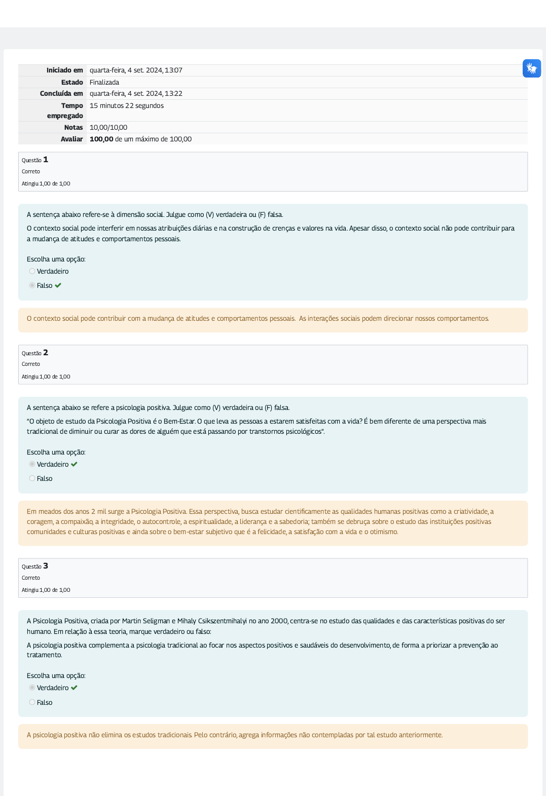 <p>Iniciado em quarta-feira, 4 set. 2024, 13:07</p><p>Estado Finalizada</p><p>Concluída em quarta-feira, 4 set. 2024, 13:22</p><p>Tempo</p><p>empregado</p><p>15 minutos 22 segundos</p><p>Notas 10,00/10,00</p><p>Avaliar 100,00 de um máximo de 100,00</p><p>Questão 1</p><p>Correto</p><p>Atingiu 1,00 de 1,00</p><p>Questão 2</p><p>Correto</p><p>Atingiu 1,00 de 1,00</p><p>Questão 3</p><p>Correto</p><p>Atingiu 1,00 de 1,00</p><p>A sentença abaixo refere-se à dimensão social. Julgue como (V) verdadeira ou (F) falsa.</p><p>O contexto social pode interferir em nossas atribuições diárias e na construção de crenças e valores na vida. Apesar disso, o contexto social não pode contribuir para</p><p>a mudança de atitudes e comportamentos pessoais.</p><p>Escolha uma opção:</p><p>Verdadeiro</p><p>Falso </p><p>O contexto social pode contribuir com a mudança de atitudes e comportamentos pessoais. As interações sociais podem direcionar nossos comportamentos.</p><p>A sentença abaixo se refere a psicologia positiva. Julgue como (V) verdadeira ou (F) falsa.</p><p>“O objeto de estudo da Psicologia Positiva é o Bem-Estar. O que leva as pessoas a estarem satisfeitas com a vida? É bem diferente de uma perspectiva mais</p><p>tradicional de diminuir ou curar as dores de alguém que está passando por transtornos psicológicos”.</p><p>Escolha uma opção:</p><p>Verdadeiro </p><p>Falso</p><p>Em meados dos anos 2 mil surge a Psicologia Positiva. Essa perspectiva, busca estudar cienti�camente as qualidades humanas positivas como a criatividade, a</p><p>coragem, a compaixão, a integridade, o autocontrole, a espiritualidade, a liderança e a sabedoria; também se debruça sobre o estudo das instituições positivas</p><p>comunidades e culturas positivas e ainda sobre o bem-estar subjetivo que é a felicidade, a satisfação com a vida e o otimismo.</p><p>A Psicologia Positiva, criada por Martin Seligman e Mihaly Csikszentmihalyi no ano 2000, centra-se no estudo das qualidades e das características positivas do ser</p><p>humano. Em relação à essa teoria, marque verdadeiro ou falso:</p><p>A psicologia positiva complementa a psicologia tradicional ao focar nos aspectos positivos e saudáveis do desenvolvimento, de forma a priorizar a prevenção ao</p><p>tratamento.</p><p>Escolha uma opção:</p><p>Verdadeiro </p><p>Falso</p><p>A psicologia positiva não elimina os estudos tradicionais. Pelo contrário, agrega informações não contempladas por tal estudo anteriormente.</p><p>Questão 4</p><p>Correto</p><p>Atingiu 1,00 de 1,00</p><p>Questão 5</p><p>Correto</p><p>Atingiu 1,00 de 1,00</p><p>Questão 6</p><p>Correto</p><p>Atingiu 1,00 de 1,00</p><p>As emoções positivas, o engajamento, os relacionamentos positivos, o signi�cado e a realização são elementos para:</p><p>Escolha uma opção:</p><p>a. Construir uma base sólida sobre a qual temos a possibilidade de edi�car uma vida feliz com estabelecimento de relações de apoio, cumprimento de</p><p>metas.</p><p></p><p>b. Construir o aspecto somente social, em que os relacionamentos e as interações são primordiais para o constructo coletivo.</p><p>c. Construir o aspecto somente psicológico, em que os comportamentos afetivos são imprescindíveis para o equilíbrio das emoções.</p><p>d. Construir o aspecto somente biológico, em que o físico humano quando bem desenvolvido promove o bem-estar pessoal.</p><p>Sua resposta está correta.</p><p>Cunhado por Seligman, o acrônimo PERMA signi�ca:</p><p>P (positive emotions – emoções positivas)</p><p>E (engagement – engajamento)</p><p>R (relationships – relacionamentos positivos)</p><p>M (meaning – signi�cado)</p><p>A (accomplishments – realização)</p><p>O compilado desses elementos permite benefícios pessoais e coletivos.</p><p>A sentença abaixo refere-se à Teoria Cognitivo Comportamental (TCC), também conhecida como a psicologia cognitiva. Julgue como (V) verdadeira ou (F) falsa.</p><p>A psicologia cognitiva indica que não são as situações que afetam como nós reagimos a elas, mas a maneira como a enxergamos. Ou seja, nossas reações são</p><p>comunicadas por meio da nossa perspectiva.</p><p>Escolha uma opção:</p><p>Verdadeiro </p><p>Falso</p><p>Para a psicologia cognitiva as situações geram pensamentos. Os pensamentos geram emoções. Em sequência, as emoções afetam nossa �siologia e esse processo</p><p>desencadeia ações e reações.</p><p>Considere a seguinte situação: José acredita que as pessoas são preguiçosas por natureza. Logo, ele tem um estilo de gestão que microgerencia o serviço de sua</p><p>equipe. As pessoas que trabalham com ele fazem o serviço a um custo emocional muito alto. O resultado a longo prazo é que o clima em sua equipe não é positivo,</p><p>apesar dele agir em consonância com aquilo que acredita.</p><p>Com base nessas informações escolha a opção correta:</p><p>Escolha uma opção:</p><p>a. José vive em dissonância cognitiva.</p><p>b. A consonância cognitiva é sempre boa.</p><p>c. José poderia melhorar o clima da sua equipe trabalhando mudanças nas suas crenças. </p><p>d. A forma de interpretação dos fatos é igual para todos, pois a verdade é uma só.</p><p>Sua resposta está correta.</p><p>A dissonância cognitiva é a discrepância entre as crenças e comportamentos. Consonância cognitiva é agir de acordo com as crenças. Em um ambiente coorporativo,</p><p>nem sempre a consonância cognitiva é boa, pois agir de acordo com suas crenças pode levar a um clima de equipe ruim. Neste caso, tem-se algumas opções de ações,</p><p>entre elas: pode-se tentar agir em dissonância cognitiva, o que a longo prazo gera con�itos internos que são prejudiciais à própria pessoa; pode-se tentar mudar as</p><p>crenças, o que é bem difícil e doloroso a curto prazo, mas que pode ter benefícios ao longo de toda a carreira gerencial.</p><p>Questão 7</p><p>Correto</p><p>Atingiu 1,00 de 1,00</p><p>Questão 