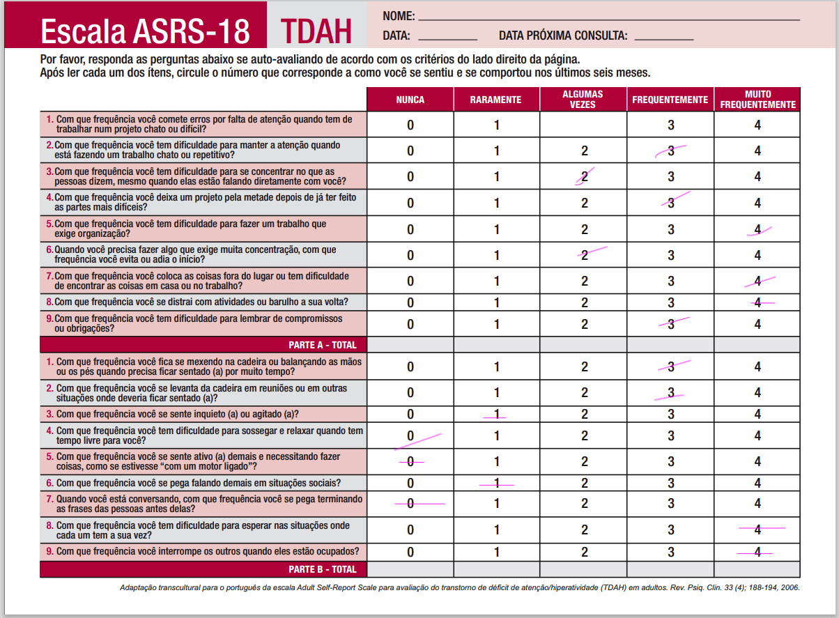 <p>NOME: Escala ASRS-18 TDAH DATA: DATA PRÓXIMA CONSULTA: Por favor, responda as perguntas abaixo se auto-avaliando de acordo com os critérios do lado direito da página. Após ler cada um dos circule 0 número que corresponde a como você se sentiu e se comportou nos últimos seis meses. ALGUMAS MUITO NUNCA RARAMENTE FREQUENTEMENTE VEZES FREQUENTEMENTE 1. Com que frequência você comete erros por falta de atenção quando tem de trabalhar num projeto chato ou difícil? 0 1 3 4 2. Com que frequência você tem dificuldade para manter a atenção quando está fazendo um trabalho chato ou repetitivo? 0 1 2 3 4 3. Com que frequência você tem dificuldade para se concentrar no que as pessoas dizem, mesmo quando elas estão falando diretamente com você? 0 1 3 4 4. Com que frequência você deixa um projeto pela metade depois de já ter feito as partes mais 0 1 2 3 4 5. Com que frequência você tem dificuldade para fazer um trabalho que exige organização? 0 1 2 3 4 6. Quando você precisa fazer algo que exige muita concentração, com que frequência você evita ou adia 0 início? 0 1 2 3 4 7. Com que frequência você coloca as coisas fora do lugar ou tem dificuldade de encontrar as coisas em casa ou no trabalho? 0 1 2 3 8. Com que frequência você se distrai com atividades ou barulho a sua volta? 0 1 2 3 9. Com que frequência você tem dificuldade para lembrar de compromissos ou obrigações? 0 1 2 3 4 PARTE A TOTAL 1. Com que frequência você fica se mexendo na cadeira ou balançando as mãos ou os pés quando precisa ficar sentado (a) por muito tempo? 0 1 2 3 4 2. Com que frequência você se levanta da cadeira em reuniões ou em outras 0 1 2 3 4 situações onde deveria ficar sentado (a)? 3. Com que frequência você se sente inquieto (a) ou agitado (a)? 0 1 2 3 4 4. Com que frequência você tem dificuldade para sossegar e relaxar quando tem tempo livre para você? 0 1 2 3 4 5. Com que frequência você se sente ativo (a) demais e necessitando fazer coisas, como se estivesse "com um motor ligado"? -0- 1 2 3 4 6. Com que frequência você se pega falando demais em situações sociais? 0 1 2 3 4 7. Quando você está conversando, com que frequência você se pega terminando 0 1 2 3 4 as frases das pessoas antes delas? 8. Com que frequência você tem dificuldade para esperar nas situações onde 0 1 2 3 4 cada um tem a sua vez? 9. Com que frequência você interrompe os outros quando eles estão ocupados? 0 1 2 3 4 PARTE TOTAL Adaptação transcultural para da escala Adult Self-Report Scale para avaliação do transtorno de déficit de (TDAH) em adultos. Rev. Psiq. Clin. 33 (4); 188-194,</p>