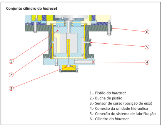 <p>Conjunto cilindro do hidroset 6 5 4 1 2 3 1.- Pistão do hidroset 2.- Bucha de pistão 3.- Sensor de curso (posição de eixo) 4.- Conexão da unidade hidráulica 5.- Conexão do sistema de lubrificação 6.- Cilindro do hidroset</p>