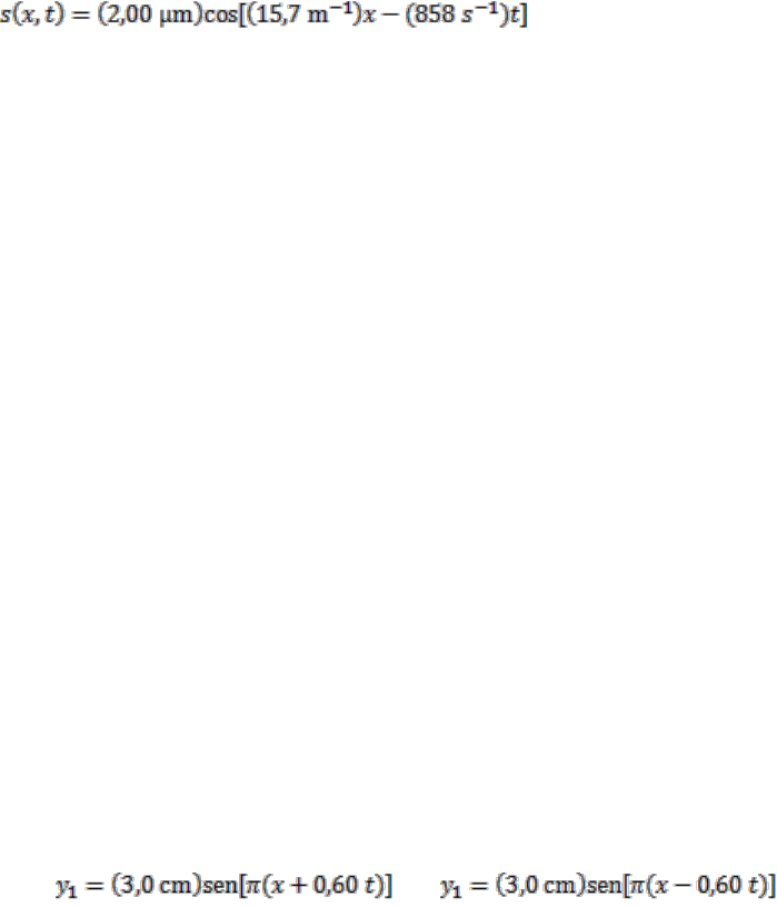 <p>F 228 – Primeiro semestre de 2010 – Lista 6 – Ondas II</p><p>1) Basicamente, os terremotos são ondas sonoras que se propagam através da Terra. Elas</p><p>são chamadas de ondas sísmicas longitudinais e transversais. Essas ondas se propagam</p><p>com velocidades diferentes. A velocidade das ondas longitudinais, chamadas de ondas</p><p>P, é 8000 m/s. As ondas transversais, chamadas ondas S, se propagam com uma</p><p>velocidade menor: 4500 m/s. Um sismógrafo registra as duas ondas provenientes de um</p><p>terremoto distante. Se a onda S chega 2,0 min após a onda P, a que distância do</p><p>aparelho ocorreu o terremoto? Pode-se considerar que as ondas se propaguem em linhas</p><p>retas, embora as ondas sísmicas reias sigam rotas mais complexas.</p><p>2) Uma onda sonora senoidal é descrita pelo deslocamento</p><p>a) Encontre a amplitude, o comprimento de onda e a velocidade dessa onda.</p><p>b) Determine o deslocamento instantâneo de um elemento do ar na posição x = 0,050 m</p><p>em t = 3,00 ms.</p><p>c) Determine a velocidade máxima do movimento oscilatório de um elemento.</p><p>3) Um diapasão gera ondas sonoras com uma freqüência de 246 Hz. As ondas propagam-</p><p>se em sentidos opostos ao longo de um corredor, são refletidas por paredes nas</p><p>extremidades e retornam. O corredor tem 47,0 m de comprimento e o diapasão está</p><p>posicionado a 14,0 m de uma extremidade. Qual é a diferença de fase entre as ondas</p><p>refletidas quando se encontram no diapasão?</p><p>4) Um alto-falante de um aparelho de som emite 1 W de potência sonora na freqüência 100</p><p>Hz. Admitindo que o som se distribui uniformemente em todas as direções, determine,</p><p>num ponto situado a 2 m de distância do alto-falante:</p><p>a) o nível sonoro em db;</p><p>b) a amplitude de pressão;</p><p>c) a amplitude de deslocamento. Tome a densidade do ar como 1,3 kg/m</p><p>3</p><p>.</p><p>d) A que distância do alto-falante o nível sonoro estaria 10 db abaixo do calculado em (a)?</p><p>5) Duas ondas senoidais que se combinam em um meio são descritas pelas funções de</p><p>onda:</p><p>e ,</p><p>onde x está em centímetros e t em segundos. Determine o deslocamento máximo do</p><p>movimento em:</p><p>a) x = 0,250 cm;</p><p>b) x = 0,500 cm;</p><p>c) e x = 1,50 cm.</p><p>d) Encontre os três menores valores de x que correspondem aos antinodos.</p><p>6) A freqüência fundamental de um tubo de órgão aberto corresponde a um Dó médio</p><p>(261,6 Hz na escala musical cromática). A terceira ressonância de um tubo de órgão</p><p>fechado tem a mesma freqüência. Quais são os comprimentos dos dois tubos?</p><p>7) Um diapasão com uma freqüência de 512 Hz é colocado perto do alto do tubo mostrado</p><p>na figura abaixo. O nível de água é abaixado de modo que o comprimento L aumenta</p><p>lentamente a partir de um valor inicial de 20,0 cm. Determine os dois valores seguintes</p><p>de L que correspondem aos modos ressonantes.</p><p>8) Um flautista escuta quatro batimentos por segundo quando compara a sua nota com a</p><p>nota emitida por um diapasão de 523 Hz (o que corresponde à nota Dó). Ele consegue</p><p>igualar sua freqüência à freqüência do diapasão puxando o “bocal de afinação” de modo</p><p>a aumentar ligeiramente o comprimento da flauta. Qual era a freqüência inicial emitida</p><p>pela flauta?</p><p>9) Dois trens viajam em sentidos opostos, sobre trilhos, com velocidades de mesma</p><p>magnitude. Um deles vem apitando. A freqüência do apito percebida por um passageiro</p><p>do outro trem varia entre os valores de 348 Hz, quando estão se aproximando, e 259 Hz,</p><p>quando estão se afastando.</p><p>a) Qual é a velocidade dos trens (em km/h)?</p><p>b) Qual é a freqüência do apito?</p><p>10) Uma sirene montada no telhado de um quartel de bombeiros emite som a uma</p><p>freqüência de 900 Hz. Um vento constante está soprando com velocidade de 15,0 m/s.</p><p>Considerando que a velocidade do som no ar calmo é de 343 m/s, encontre o</p><p>comprimento de onda do som da sirene</p><p>a) contra o vento e b) a favor do vento.</p><p>Os bombeiros voluntários estão se aproximando da sirene por várias direções a 15,0</p><p>m/s. Qual freqüência um bombeiro escuta se</p><p>c) ele ou ela está se aproximando de uma posição contra o vento, ou seja, está se movendo</p><p>na direção em que o vento está soprando?</p><p>d) Se ele ou ela está se movendo a partir de uma posição a favor do vento e movendo-se</p><p>contra o vento?</p>
