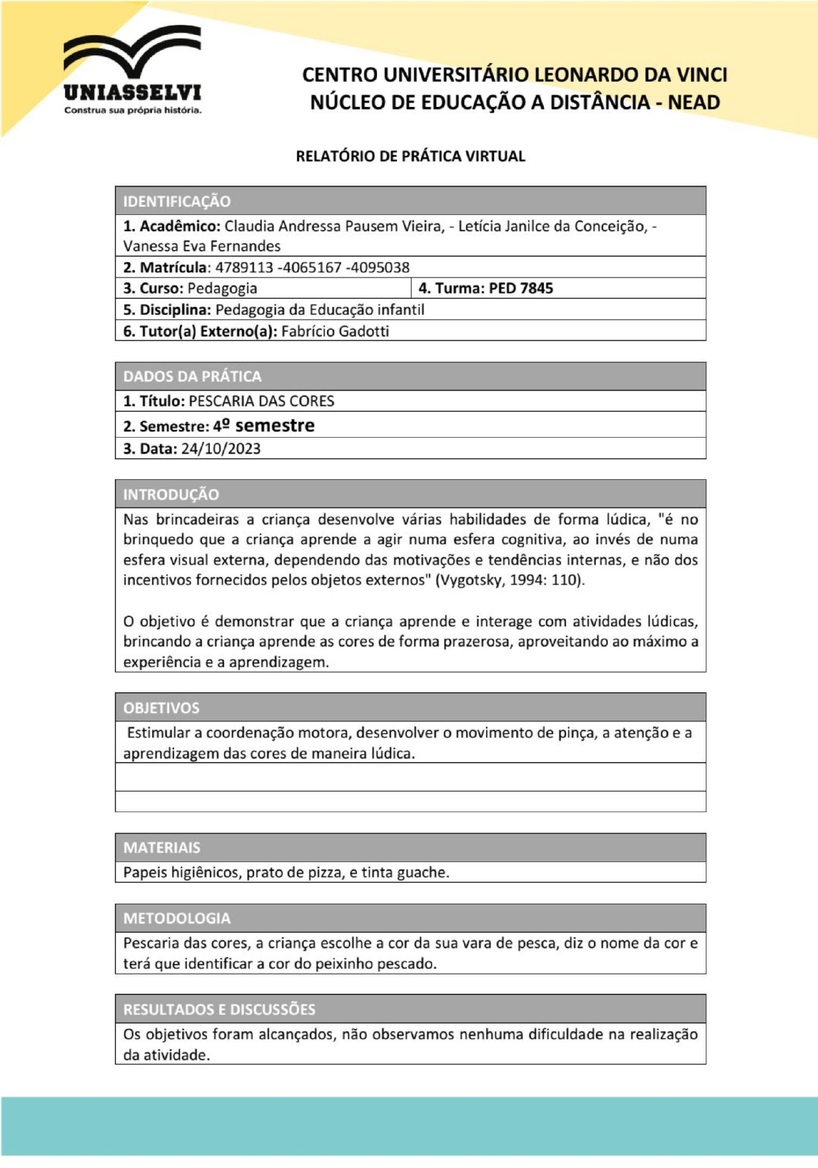 <p>CENTRO UNIVERSITÁRIO LEONARDO DA VINCI UNIASSELVI Construa sua própria história. NÚCLEO DE EDUCAÇÃO A DISTÂNCIA - NEAD RELATÓRIO DE PRÁTICA VIRTUAL IDENTIFICAÇÃO 1. Acadêmico: Claudia Andressa Pausem Vieira, Letícia Janilce da Conceição, - Vanessa Eva Fernandes 2. Matrícula: 4789113 -4065167 -4095038 3. Curso: Pedagogia 4. Turma: PED 7845 5. Disciplina: Pedagogia da Educação infantil 6. Tutor(a) Externo(a): Fabrício Gadotti DADOS DA PRÁTICA 1. Título: PESCARIA DAS CORES 2. Semestre: semestre 3. Data: 24/10/2023 INTRODUÇÃO Nas brincadeiras a criança desenvolve várias habilidades de forma lúdica, "é no brinquedo que a criança aprende a agir numa esfera cognitiva, ao invés de numa esfera visual externa, dependendo das motivações e tendências internas, e não dos incentivos fornecidos pelos objetos externos" (Vygotsky, 1994: 110). o objetivo é demonstrar que a criança aprende e interage com atividades lúdicas, brincando a criança aprende as cores de forma prazerosa, aproveitando ao máximo a experiência e a aprendizagem. OBJETIVOS Estimular a coordenação motora, desenvolver o movimento de pinça, a atenção e a aprendizagem das cores de maneira lúdica. MATERIAIS Papeis higiênicos, prato de pizza, e tinta guache. METODOLOGIA Pescaria das cores, a criança escolhe a cor da sua vara de pesca, diz o nome da cor e terá que identificar a cor do peixinho pescado. RESULTADOS E DISCUSSÕES Os objetivos foram alcançados, não observamos nenhuma dificuldade na realização da atividade.</p><p>CENTRO UNIVERSITÁRIO LEONARDO DA VINCI UNIASSELVI NÚCLEO DE EDUCAÇÃO A DISTÂNCIA - NEAD Construa sua própria história. REGISTRO FOTOGRÁFICO REFERÊNCIAS Vygotsky, L.S. (2001). Psicologia Pedagógica. São Paulo, Martins Fontes. Disponível em (1994). A formação social da mente. São Paulo, Martins Fontes. Acesso 25/10/2023.</p><p>MANUAL DA BRINQUEDOTECA ANEXO B (ATIVIDADES 1, 2, 3, 4, 5, 6 e 7) MODELO DO RELATÓRIO DA ATIVIDADE (Tópicos que precisam ser abordados em forma de redação no relatório). Acadêmico: Claudia Andressa Pausem Vieira, - Letícia Janilce da Conceição, - Vanessa Eva Fernandes Turma: PED 7845 Matrícula:4789113 -4065167 -4095038 Disciplina: Pedagogia da Educação infantil A data da aplicação e/ou observação:24/10/2023 o tema escolhido: Pescaria das cores A relação entre os conceitos vistos na teoria (roteiro da Atividade) com a prática conceitos da teoria atenderam os objetivos da teoria e da prática. Se os objetivos os foram alcançados (justificando a resposta):sim, os objetivos foram alcançados, pois as crianças aprenderam as cores de forma lúdica. E considerações finais: aspectos positivos e negativos da prática: Não foram observados aspectos negativos. Os aspectos positivos são de aprender as cores e aprimorar a coordenação motora de forma prazerosa.</p><p>MANUAL DA BRINQUEDOTECA ANEXO A (ATIVIDADES 1, 2, 3, 4, 5, 6 e 7) MODELO DO ROTEIRO DA ATIVIDADE: Disciplina: Pedagogia da Educação infantil Data: 24/10/2023 Tema Escolhido com justificativa: Pescaria das cores, atividade lúdica. Atividades que serão desenvolvidas: Pescaria das cores Tempo necessário: minutos Material Utilizado: Papeis higiênicos, prato de pizza, e tinta guache. Expectativas em relação às atividades (objetivos): Estimular a coordenação motora, desenvolver o movimento de pinça, a atenção e a aprendizagem das cores de maneira lúdica. Quantidade de alunos e faixa etária:18 alunos de 3 e 4 anos Construção de um texto (fundamentado teoricamente) na atividade que foi escolhida, dentro de cada disciplina. Nas brincadeiras a criança desenvolve várias habilidades de forma lúdica, "é no brinquedo que a criança aprende a agir numa esfera cognitiva, ao invés de numa esfera visual externa, dependendo das motivações e tendências internas, e não dos incentivos fornecidos pelos objetos externos" (Vygotsky, 1994: 110). o objetivo é demonstrar que a criança aprende e interage com atividades lúdicas, brincando a criança aprende de forma prazerosa, aproveitando ao máximo a experiência e a aprendizagem. Referências utilizadas: Vygotsky, L.S. (2001). Psicologia Pedagógica. São Paulo, Martins Fontes. Disponível em (1994). A formação social da mente. São Paulo, Martins Fontes. Acesso 25/10/2023.</p>