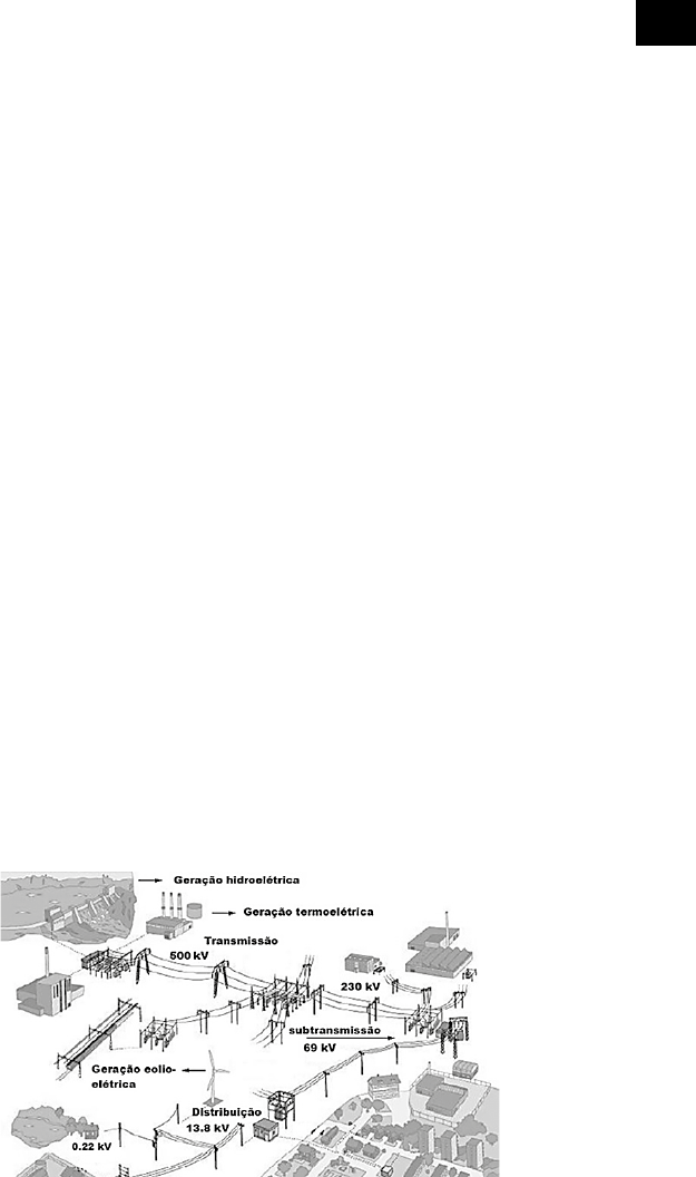 <p>Central Hidroelétrica 13</p><p>1</p><p>CENTRAL HIDROELÉTRICA</p><p>1.1 Introdução</p><p>Este capítulo faz uma apresentação virtual, prática e geral</p><p>das centrais hidrelétricas, mostrando e descrevendo o funciona-</p><p>mento dos vários equipamentos encontrados nesse tipo de cen-</p><p>tral elétrica. Este tipo de abordagem procura mostrar como são</p><p>as centrais hidroelétricas no sistema de potência real. Além dis-</p><p>so, o controle carga-frequência é modelado e exemplificado.</p><p>1.2 Sistemas Elétricos de Potência</p><p>A figura 1.1 mostra a estrutura genérica de um sistema de po-</p><p>tência formado por geradores, transformadores elevadores/abai-</p><p>xadores, linhas de transmissão e alimentadores de distribuição.</p><p>Figura 1.1 – Sistema elétrico de potência</p><p>Central Hidroelétrica14</p><p>Com a finalidade de fornecer, de forma concisa, as principais</p><p>informações sobre um sistema elétrico de potência, utiliza-se o</p><p>diagrama unifilar. O diagrama unifilar de um sistema elétrico é</p><p>obtido a partir do seu circuito monofásico equivalente (admite-</p><p>-se que o sistema é trifásico equilibrado) suprimindo-se o neutro.</p><p>A figura 1.2 mostra o diagrama unifilar do sistema elétrico da</p><p>figura 1.1.</p><p>Figura 1.2 – Diagrama unifilar do sistema elétrico da figura 1.1</p><p>Como pode ser observado nas figuras 1.1 e 1.2, o sistema</p><p>elétrico é dividido didaticamente em partes como geração, trans-</p><p>missão e distribuição, embora ele seja um sistema único, que</p><p>opera simultaneamente com todas as partes conectadas entre si.</p><p>No entanto, as companhias de energia administram áreas do sis-</p><p>tema de potência diferentes. Por exemplo, no Nordeste do Bra-</p><p>sil, a Companhia Hidroelétrico do São Francisco (Chesf) opera a</p><p>parte de geração e transmissão e as outras companhias, Compa-</p><p>nhia de Eletricidade do Ceará (Enel), Companhia de Eletricida-</p><p>de de Pernambuco (Celpe), Companhia de Eletricidade da Bahia</p><p>(Coelba) etc., operam a rede de distribuição de áreas específicas.</p><p>Portanto, os estudos elétricos em cada companhia são conduzi-</p><p>dos utilizando partes do sistema, como, por exemplo, somente</p><p>uma parte da rede de distribuição, ou seja, um estudo em um</p><p>alimentador do sistema de distribuição de energia, o qual possui</p><p>vários alimentadores.</p><p>Os estudos elétricos usando várias áreas, administradas por</p><p>várias companhias de energia, do sistema de transmissão são</p><p>Central Hidroelétrica 15</p><p>aqueles referentes ao sistema interligado do Brasil e são realiza-</p><p>dos pelo Operador Nacional do Sistema (ONS).</p><p>Os níveis de tensão utilizados nas várias partes do sistema</p><p>de potência são mostrados na tabela 1.1.</p><p>Tabela 1.1 – Níveis de tensão</p><p>COMPONENTE TENSÃO (kV)</p><p>Geração 2.2 a 22.0</p><p>(13.8)</p><p>Transmissão 138 a 1000</p><p>(138 – 230 – 500)</p><p>Subtransmissão 22 a 138</p><p>(34.5 – 69 – 138)</p><p>Distribuição Distribuição primária 3.8 a 22</p><p>(13.8)</p><p>Distribuição secundária 0.110 a 0.440</p><p>(0.127 – 0.220)</p><p>Os níveis de tensão utilizados pelas companhias de energia</p><p>no Brasil são os seguintes: 765 kV, 525 kV, 500 kV, 440 kV, 345</p><p>kV, 300 kV, 230 kV, 161 kV, 138 kV, 132 kV, 115 kV, 88 kV, 69 kV,</p><p>34,5 kV, 23 kV, 13,8 kV, 440 V, 380 V, 220 V, 127 V.</p><p>Os estudos elétricos conduzidos pelo ONS são referentes à</p><p>rede básica, que é definida conforme a Resolução no 433, de 10</p><p>de novembro de 2000, da Agência Nacional de Energia Elétrica</p><p>(Aneel) no seu artigo 3o:</p><p>Art. 3º Integram a rede básica as linhas de transmissão, os barramentos,</p><p>os transformadores de potência e os equipamentos com tensão igual ou</p><p>superior a 230 kV, com exceção das seguintes instalações e equipamentos:</p><p>I – Instalações de transmissão, incluindo as linhas de transmissão, trans-</p><p>formadores de potência e suas conexões, quando destinadas ao uso ex-</p><p>clusivo de centrais geradoras ou de consumidores, em caráter individu-</p><p>al ou compartilhado;</p><p>II – Instalações de transmissão de interligações internacionais e suas co-</p><p>nexões, autorizadas para fins de importação ou exportação de energia</p><p>elétrica; e</p><p>Central Hidroelétrica16</p><p>III – Transformadores de potência com tensão secundária inferior a 230</p><p>kV, inclusive a conexão.</p><p>Parágrafo único. As instalações e equipamentos de que tratam os incisos</p><p>I, II e III deste artigo serão de responsabilidade do acessante.</p><p>A energia elétrica pode ser produzida por diversos tipos de</p><p>centrais, sendo estas as principais: termoelétricas, nucleares e hi-</p><p>droelétricas.</p><p>As centrais termoelétricas utilizam, basicamente, combus-</p><p>tíveis fósseis (petróleo, carvão etc.), gerando a energia elétrica</p><p>a partir do calor produzido pela queima desses combustíveis,</p><p>como mostra a figura 1.3.</p><p>Figura 1.3 – Central termoelétrica</p><p>As centrais nucleares utilizam o calor produzido por com-</p><p>bustíveis nucleares como urânio e plutônio, como mostrado na</p><p>figura 1.4.</p><p>Central Hidroelétrica 17</p><p>Figura 1.4 – Central nuclear</p><p>O Brasil possui um potencial hidráulico significativo, que</p><p>deve ser aproveitado respeitando o meio ambiente. A seguir, as</p><p>centrais hidrelétricas serão descritas.</p><p>1.3 Centrais Hidrelétricas</p><p>Algumas das primeiras inovações em usar o poder da água</p><p>foram concebidas na China durante a dinastia Han entre 202 a.C</p><p>e 9 d.C. Martelos giratórios grandes e pesados alimentados por</p><p>uma roda de água de ajuste vertical foram usados para quebrar</p><p>grãos, minérios e no início da fabricação de papel.</p><p>Há mais de 2000 anos, os greg