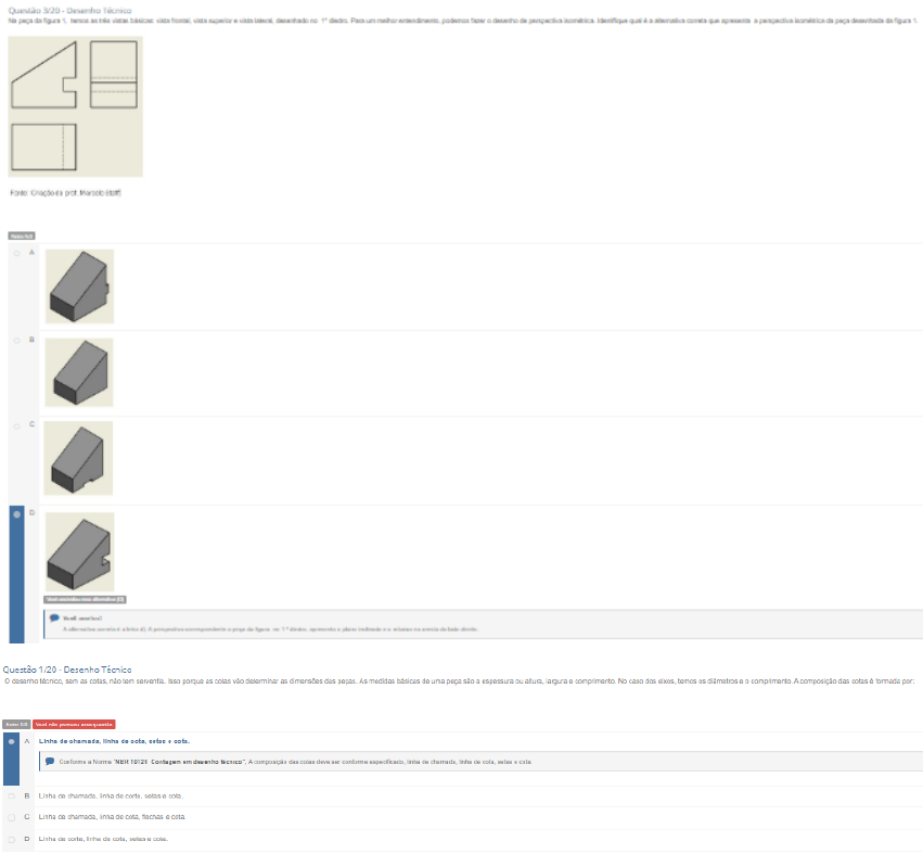 <p>3/20 Desenho da da A F Questão 1/20 Desenho Técnico desenho técnico sem as Isso as cotas As medidas de uma são ou No caso dos temos comprimento A composição das cotas por Linha de linha de Norma Contagem B Linha de chamada Linha de chamada linha de Linha de corte de cota</p><p>Questão 2/20 Desenho Técnico Na imagem é observar exemplos de corda, secante tangente numa CIRCUNFERÊNCIA SECANTE TANGENTE Ana Caroline de Bassi Conforme as Rotas e as imagens acima, termos da geometria relacionados à circunterência da às suas respectivas especificações [coluna da A um segmento de reta que passa pela e a cruza em dois pontos sem passar pelo centro. B Corda ) É um segmento de reta que passa pela e a em apenas um ponto. C Secante ) a curva que limita o ) É um segmento de reta que une dois pontos da circunferência sem passar pelo centro. Agora, marque a sequência correta da coluna da de cima para Nota A c. D.A.B. de Conforme 3. A é A relação coluna da com H coluna de conforme É curva limita É de que pelo É de H data pelo segmento de rela um Questão 4/20 Desenho Técnico Analise as alternativas marque a que apresenta corretamente a a vista em relação perspectiva A D Questão 5/20 Desenho Técnico Para as cilindrica ou possuir rasgos usamos linha de simetria indicando que iguals as duas Para localização de furos usamos inha de Esta linha A Linha B Linha A b) Norma 8403 de de no quando for localização de</p><p>Questão 6/20 Desenho Técnico desenho ou expressão uma de Em desenho Conforme NBR 10087 de em dois de projeção ou diedro afirmar No objeto estará tombado desenhado vistas vista frontal vista superior vista lateral II) Quanto mais ou mais utilizando métodos diedro para mesmo tempo para sistema de projeção terceiro diedro conhecido como Americano adotado pela norma norte-americana American National Standards Institute (ANSI) uso do sistema de do diedro das normas adotadas por cada Por no Brasil mais difundido uso do E que A B dos no No NBR contrário do Canada 14 projeção 2018) D Questão 7/20 Desenho Técnico sistema cotagem representação no desenho do através de valor unidade de Toda para descreven uma ou clara ser representada no as assertivas que seguem marque para as para as 1. principal função das cotas de maneira todas as dimensões das raios 2. utilizadas nas de chamada de cota Outro ponto importante encostar linha de nas linhas de contorno das um pequeno ser deixado o importante finalizar linhas de com as 3. Nos desenhos podemos colocar cotas verificar qual das vistas cota mais de que que construtor calculo cota pois pode haver erros de chamada indica onde da peça que linha cota indica colocado dimensão as setas da linha de cota cota valor numérico que indica tamanho real da peça A V-F -F-V principal função de IV da de cola de cola não Questão 8/20 Desenho Técnico Quando desenho de uma possui furos rebaixos para aplicado uma vista em carte no desenho atravessando toda peça em uma pois os furos rebaixos estão alinhados Considerando as informações das as assinalando V para as afirmativas para as relação ao emprego do desenho cortes nas projeções são ressaltados com podem ser caracterizadas como grossas traçadas em de Desenhos com cortes peças finas devem representados am negrito com em branco Quando Area de hachura for somento central ficando as bordas do sem Agora marque sequência de cima para A B F.V.V.F Conforme quandu for do D Questão 9/20 Desenho Técnico Considerando as textos das as afirmativas abaixo sobre os usos da perspectiva no uma forma representação de um de dimensões em uma de pode ser empregada desenhos de utilização produtos III Os desenhos em perspectiva podem ser obtidos utilizando os métodos de projeção projeção No perspectiva reconhecimento interpretação do Isso porque so com realidade que estamos acostumados no nosso A Apenas as afirmativas IV conforme de um - uma plans de OR Questão 10/20 Desenho Técnico A escalas são os tamanhos das ser desenhadas folha de Podemos definir qual tamanho do desenho que melhor representado na de Analise as assertivas que seguem marque para as OF para as A escala de redução quando as dimensões muito grande caber na de teremos que reduzir todas as suas por pela sendo denominado escala 1:2 escala natural quando for desenhado no tamanho natural sendo denominado escala 1:1 III) de quando as dimensões muito pequenas desenho ficar então temos que aumentar todas as dimensões por duplicando as para fazer desenho sendo denominado escala IV) Quando desenho apresentar linhas tanto na redução na corretas apenas as afirmativas: A B V-V-F-V b) 14 de redução natural 1:1 pub V-V-V-F D V-V-V-V Questão 11/20 Desenho Técnico Folha de desenho objetivo padronizar as dimensões das folhas utilizadas na execução de desenhos técnicos definir Temos cinco tipos de folhas de desenho que apresentam as dimensões diferentes denominadas pelos formatos da podemos A a) Norma de branco pré OR A3 A2A1 AD</p><p>Questão 12/20 Desenho Técnico A visual unifica A linguagem complexa visual a velocidade da luz pode um grande número de DONDIS Donis A. da linguagem visual Paulo: Martins Considerando as informações das analise as assinalando para as verdadeiras para as falsas em relação a visual Considerando as informações das analise as para as afirmativas para as falsas relação visual 10 desenho uma das maneiras mais rápidas eficazes de comunicação a. uma das básicas do Os primeiros desenhos realizados pelos seres humanos datam de até anos Quando pensamos em podemos desenho realista desenho desenho de fundamentação os desenhos desenho não desenho Quando descrevemos uma forma tamanho ou localização uso linguagem verbal mais eficiente do que uso da linguagem visual A V.V.V.V B F.V.V.V C Conforme correla quando ou localização da visual mab do que D Questão 13/20 Desenho Técnico Desenho Técnico temos diferentes tipos de com objetivo identificar cada do Quando 