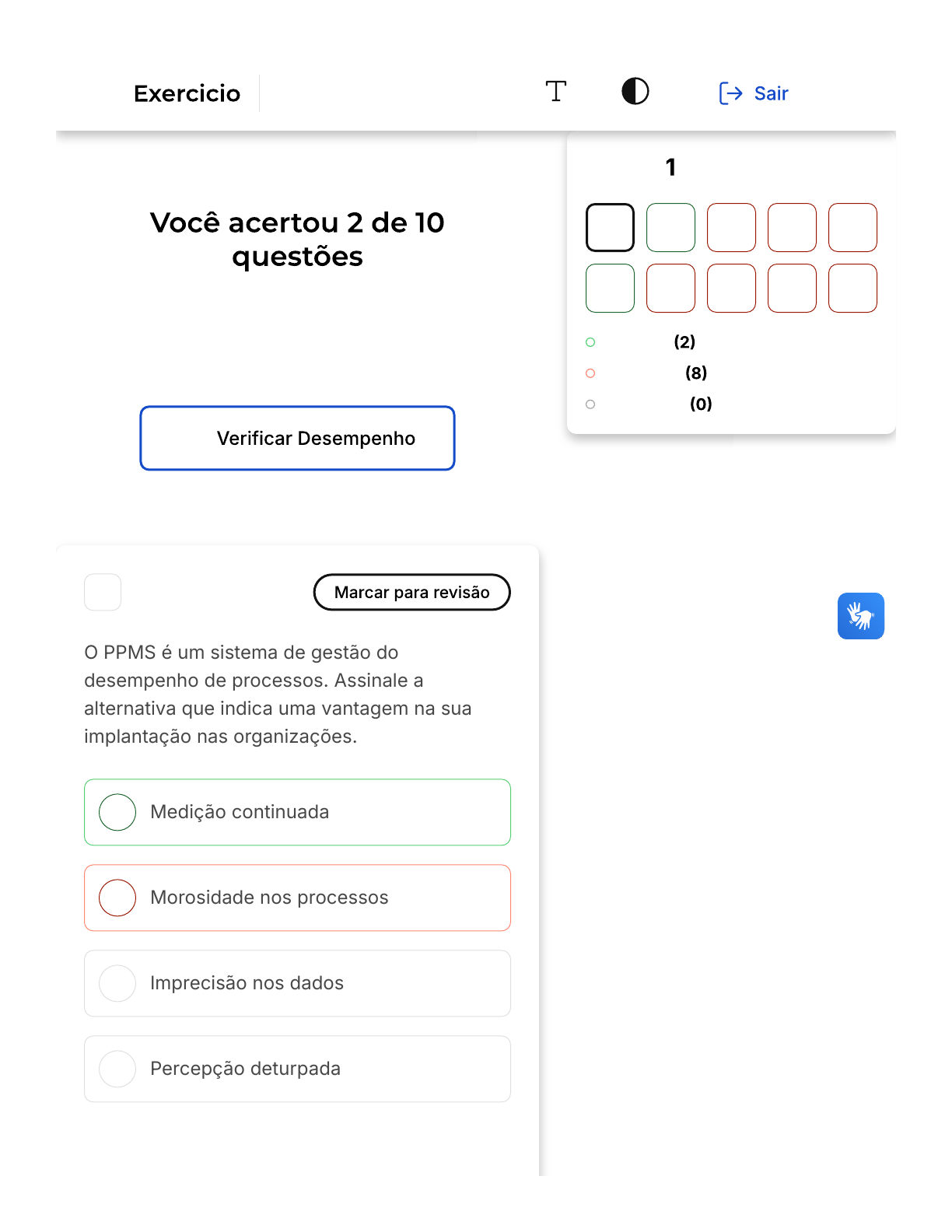 <p>Verifique o seu desempenho e continue</p><p>treinando! Você pode refazer o exercício</p><p>quantas vezes quiser.</p><p>A</p><p>B</p><p>C</p><p>D</p><p>1</p><p>O PPMS é um sistema de gestão do</p><p>desempenho de processos. Assinale a</p><p>alternativa que indica uma vantagem na sua</p><p>implantação nas organizações.</p><p>Medição continuada</p><p>Morosidade nos processos</p><p>Imprecisão nos dados</p><p>Percepção deturpada</p><p>Questão de 10</p><p>Corretas</p><p>Incorretas</p><p>Em branco</p><p>1 2 3 4 5</p><p>6 7 8 9 10</p><p>Avaliacao De Desempenho</p><p>Dos Processos</p><p>Firefox https://estacio.saladeavaliacoes.com.br/exercicio/66d8acc6c669e5c9f4...</p><p>1 of 15 04/09/2024, 15:56</p><p>E</p><p>A</p><p>Pouco uso de tecnologia</p><p>Opa! A alternativa correta é a letra</p><p>A. Confira o gabarito comentado!</p><p>A alternativa correta é a "Medição</p><p>continuada". O sistema PPMS, ao ser</p><p>implementado em uma organização,</p><p>permite uma medição contínua do</p><p>desempenho dos processos. Isso significa</p><p>que a avaliação do desempenho não é feita</p><p>de forma esporádica, mas sim de maneira</p><p>constante. Essa abordagem evita</p><p>distorções nas análises, pois permite um</p><p>acompanhamento mais preciso e em tempo</p><p>real do desempenho dos processos. As</p><p>demais alternativas listadas não</p><p>representam vantagens da implementação</p><p>do PPMS, mas sim possíveis desafios ou</p><p>problemas que podem surgir em qualquer</p><p>sistema de gestão.</p><p>2</p><p>Qual das alternativas abaixo apresenta uma</p><p>meta singular?</p><p>Coordenar os processos de pós-</p><p>vendas para aumentar as vendas.</p><p>Firefox https://estacio.saladeavaliacoes.com.br/exercicio/66d8acc6c669e5c9f4...</p><p>2 of 15 04/09/2024, 15:56</p><p>B</p><p>C</p><p>D</p><p>E</p><p>Participar da elaboração de</p><p>indicadores chaves para o processo</p><p>de modelagem de negócios.</p><p>Aumentar as vendas de todos os</p><p>setores em relação ao último período.</p><p>Reduzir o tempo de entrega dos</p><p>produtos aos clientes.</p><p>Aumentar em 12% as vendas do setor</p><p>de private label para alcançar um</p><p>aumento de 7% nas vendas gerais.</p><p>Parabéns, você selecionou a</p><p>alternativa correta. Confira o</p><p>gabarito comentado!</p><p>A alternativa correta é a E, que propõe</p><p>"Aumentar em 12% as vendas do setor de</p><p>private label para alcançar um aumento de</p><p>7% nas vendas gerais". Esta é considerada</p><p>uma meta singular porque é específica,</p><p>mensurável, alcançável, relevante e</p><p>temporal �SMART�. Ela é específica porque</p><p>se refere a um setor específico (private</p><p>label), é mensurável porque estabelece</p><p>uma porcentagem de aumento nas vendas,</p><p>é alcançável e relevante para o negócio e é</p><p>temporal porque implica um período de</p><p>tempo para alcançar a meta.</p><p>Firefox https://estacio.saladeavaliacoes.com.br/exercicio/66d8acc6c669e5c9f4...</p><p>3 of 15 04/09/2024, 15:56</p><p>A</p><p>B</p><p>C</p><p>D</p><p>E</p><p>3</p><p>Muitos são os modelos de gestão de</p><p>desempenho que existem. Nesse contexto, a</p><p>perspectiva da "árvore de metas" surgiu nos</p><p>anos 2000 e consiste nas seguintes</p><p>perspectivas:</p><p>I. Visão financeira</p><p>II. Visão sociedade</p><p>III. Visão sustentabilidade</p><p>IV. Visão cliente</p><p>V. Visão empregado</p><p>Assinale a alternativa que indica os itens</p><p>corretos.</p><p>I, II, IV e V, apenas.</p><p>I, III e V, apenas.</p><p>I, III, IV e V, apenas.</p><p>I, II, III, IV e V.</p><p>II, IV e V, apenas.</p><p>Opa! A alternativa correta é a letra</p><p>A. Confira o gabarito comentado!</p><p>A perspectiva da "árvore de metas" é um</p><p>Firefox https://estacio.saladeavaliacoes.com.br/exercicio/66d8acc6c669e5c9f4...</p><p>4 of 15 04/09/2024, 15:56</p><p>A</p><p>B</p><p>C</p><p>modelo de gestão de desempenho que</p><p>engloba diversas visões. A visão financeira</p><p>�I) é correta, pois se refere à saúde</p><p>financeira e rentabilidade da organização.</p><p>A visão sociedade �II) também é correta,</p><p>pois diz respeito ao impacto da</p><p>organização na sociedade. A visão</p><p>sustentabilidade �III) é incorreta, pois neste</p><p>modelo, a visão correta seria a de</p><p>inovação. A visão cliente �IV) é correta, pois</p><p>se refere à satisfação e retenção de</p><p>clientes. Por fim, a visão empregado �V) é</p><p>correta, pois se refere ao engajamento e</p><p>satisfação dos funcionários. Portanto, a</p><p>alternativa correta é a A� I, II, IV e V,</p><p>apenas.</p><p>4</p><p>Para se escolher os indicadores de</p><p>desempenho, estes devem atender alguns</p><p>critérios. Assinale a alternativa errada:</p><p>Periodicidade, Clareza e</p><p>Acessibilidade.</p><p>Periodicidade, Cautela e</p><p>Acessibilidade.</p><p>Abrangência, Seletividade e</p><p>Periodicidade.</p><p>Firefox https://estacio.saladeavaliacoes.com.br/exercicio/66d8acc6c669e5c9f4...</p><p>5 of 15 04/09/2024, 15:56</p><p>D</p><p>E</p><p>A</p><p>Abrangência, Comparabilidade e</p><p>Rastreabilidade.</p><p>Rastreabilidade, Abrangência e</p><p>Comparabilidade.</p><p>Opa! A alternativa correta é a letra</p><p>B. Confira o gabarito comentado!</p><p>A alternativa B é a errada, pois "Cautela"</p><p>não é um critério para a escolha de</p><p>indicadores de desempenho. Os critérios</p><p>corretos para a escolha de indicadores de</p><p>desempenho incluem: Periodicidade,</p><p>Clareza, Acessibilidade, Abrangência,</p><p>Seletividade, Comparabilidade e</p><p>Rastreabilidade. Portanto, a alternativa que</p><p>contém "Cautela" como um critério é a</p><p>alternativa incorreta.</p><p>5</p><p>Qual o indicador de desempenho correto a ser</p><p>usado quando queremos medir a categoria</p><p>Finança:</p><p>Custo da peça por minuto.</p><p>Firefox https://estacio.saladeavaliacoes.com.br/exercicio/66d8acc6c669e5c9f4...</p