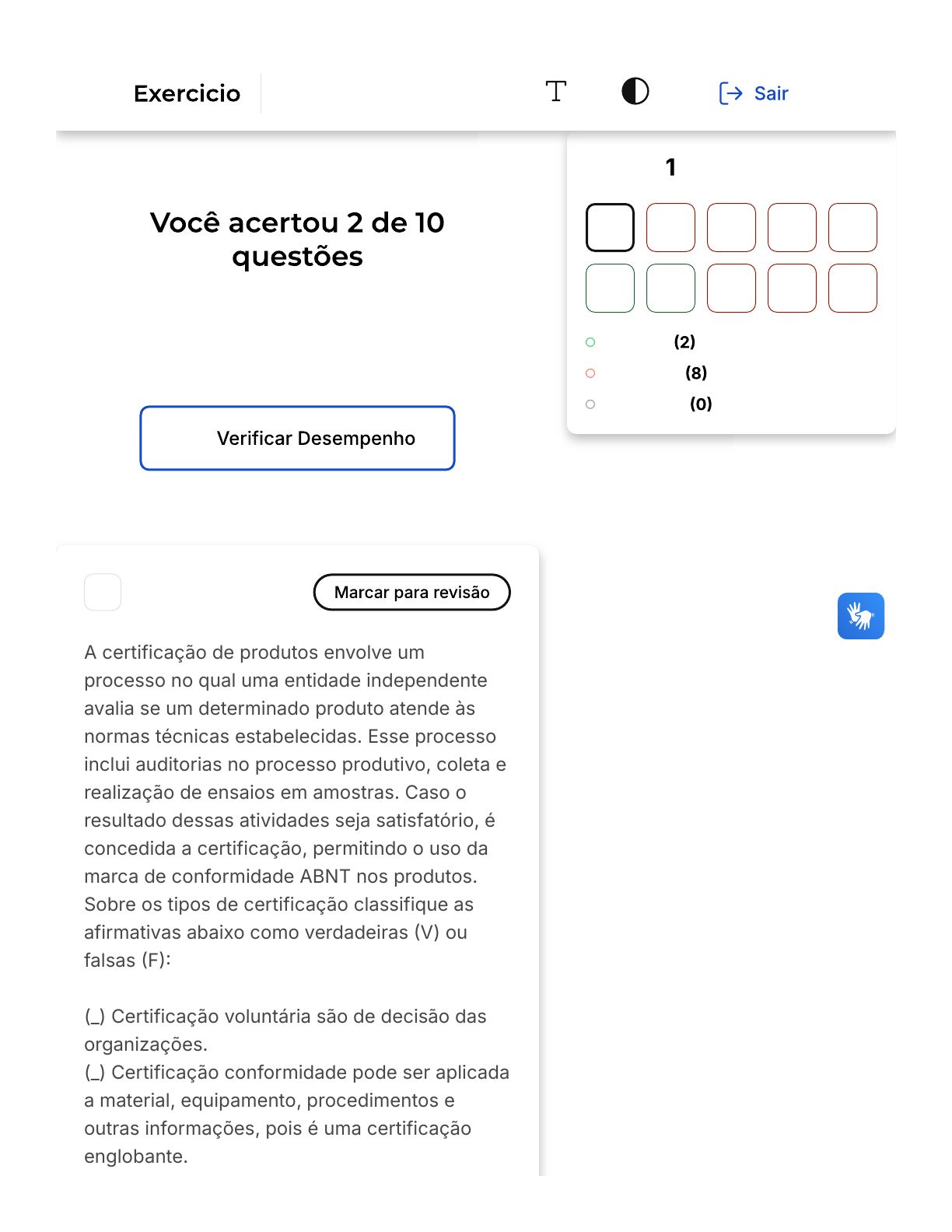 <p>Verifique o seu desempenho e continue</p><p>treinando! Você pode refazer o exercício</p><p>quantas vezes quiser.</p><p>1</p><p>A certificação de produtos envolve um</p><p>processo no qual uma entidade independente</p><p>avalia se um determinado produto atende às</p><p>normas técnicas estabelecidas. Esse processo</p><p>inclui auditorias no processo produtivo, coleta e</p><p>realização de ensaios em amostras. Caso o</p><p>resultado dessas atividades seja satisfatório, é</p><p>concedida a certificação, permitindo o uso da</p><p>marca de conformidade ABNT nos produtos.</p><p>Sobre os tipos de certificação classifique as</p><p>afirmativas abaixo como verdadeiras �V) ou</p><p>falsas �F��</p><p>(_) Certificação voluntária são de decisão das</p><p>organizações.</p><p>(_) Certificação conformidade pode ser aplicada</p><p>a material, equipamento, procedimentos e</p><p>outras informações, pois é uma certificação</p><p>englobante.</p><p>Questão de 10</p><p>Corretas</p><p>Incorretas</p><p>Em branco</p><p>1 2 3 4 5</p><p>6 7 8 9 10</p><p>Padroes De Conformidade</p><p>e Processos</p><p>Firefox https://estacio.saladeavaliacoes.com.br/exercicio/66d8ad81d6fc23ed66...</p><p>1 of 15 04/09/2024, 15:57</p><p>A</p><p>B</p><p>C</p><p>D</p><p>E</p><p>(_) Certificação compulsória tem como foco a</p><p>segurança da instituição.</p><p>(_) Certificação conformidade é exclusiva de</p><p>produtos industriais.</p><p>(_) Certificação compulsória tem como foco a</p><p>segurança nacional, incluindo a sociedade e o</p><p>meio ambiente.</p><p>Assinale a op��ão que apresenta a sequência</p><p>correta, de cima pra baixo.</p><p>V V F F V</p><p>F F V V F</p><p>V F V F V</p><p>V V V F F</p><p>F V F F V</p><p>Opa! A alternativa correta é a letra</p><p>A. Confira o gabarito comentado!</p><p>A certificação de conformidade é um</p><p>documento de espectro abrangente que</p><p>pode certificar qualquer material,</p><p>componente, equipamento, interface,</p><p>protocolo, procedimento, função, método e</p><p>atividade de organismos ou pessoas. A</p><p>Firefox https://estacio.saladeavaliacoes.com.br/exercicio/66d8ad81d6fc23ed66...</p><p>2 of 15 04/09/2024, 15:57</p><p>A</p><p>B</p><p>C</p><p>D</p><p>certificação compulsória dá prioridade às</p><p>questões de segurança, de interesse do</p><p>país e do cidadão, abrangendo as questões</p><p>relativas aos animais, vegetais, proteção da</p><p>saúde, do meio ambiente e temas</p><p>correlatos. A certificação voluntária é</p><p>decisão exclusiva do solicitante e tem</p><p>como objetivo garantir a conformidade de</p><p>processos, produtos e serviços às normas</p><p>elaboradas por entidades reconhecidas no</p><p>âmbito do Sinmetro.</p><p>2</p><p>A identificação das conformidades pode ser</p><p>realizada pelo comprador, quem adquire o</p><p>produto, pelo fornecedor, quem entrega o</p><p>produto. Existe ainda a possibilidade de um</p><p>terceiro ator durante a identificação, as</p><p>organizações independentes, a participação</p><p>delas:</p><p>pode fornecer estratégias a</p><p>organização</p><p>pode fornecer ideias para redução de</p><p>gastos</p><p>pode fornecer certificações para a</p><p>organização</p><p>pode fornecer conteúdos técnicos</p><p>Firefox https://estacio.saladeavaliacoes.com.br/exercicio/66d8ad81d6fc23ed66...</p><p>3 of 15 04/09/2024, 15:57</p><p>E</p><p>pode fornecer pontos de vista para a</p><p>organização.</p><p>Opa! A alternativa correta é a letra</p><p>C. Confira o gabarito comentado!</p><p>No contexto de avaliações e certificações,</p><p>um terceiro ator desempenha um papel</p><p>fundamental. Essas organizações</p><p>independentes são responsáveis por</p><p>conceder ou renovar certificações ao final</p><p>do processo de avaliação. Elas</p><p>desempenham um papel imparcial e</p><p>objetivo na verificação da conformidade e</p><p>excelência dos produtos, serviços ou</p><p>sistemas em questão. Ao atuarem como</p><p>uma entidade externa, esses terceiros</p><p>atores garantem a credibilidade e</p><p>confiabilidade das certificações, agregando</p><p>valor e confiança aos envolvidos. Seu papel</p><p>é crucial para fornecer uma avaliação</p><p>imparcial e transparente, assegurando que</p><p>os padrões e critérios estabelecidos sejam</p><p>cumpridos e mantidos ao longo do tempo.</p><p>3</p><p>Firefox https://estacio.saladeavaliacoes.com.br/exercicio/66d8ad81d6fc23ed66...</p><p>4 of 15 04/09/2024, 15:57</p><p>A</p><p>B</p><p>C</p><p>D</p><p>E</p><p>É possível haver não conformidade, que surgem</p><p>de fatores externos ou internos. Uma forma de</p><p>corrigir estas não conformidades é a</p><p>ferramenta:</p><p>Matriz GUT</p><p>Matriz de Gravidade</p><p>Matriz de Urgência</p><p>Matriz de Tendência</p><p>Matriz de não conformidades</p><p>Opa! A alternativa correta é a letra</p><p>A. Confira o gabarito comentado!</p><p>Quando as não conformidades são</p><p>encontradas, uma ferramenta muito útil é a</p><p>utilização da Matriz GUT na classificação</p><p>da gravidade de cada não conformidade. O</p><p>acrônimo GUT significa: Gravidade,</p><p>Urgência e Tendência.</p><p>4</p><p>Firefox https://estacio.saladeavaliacoes.com.br/exercicio/66d8ad81d6fc23ed66...</p><p>5 of 15 04/09/2024, 15:57</p><p>A</p><p>B</p><p>C</p><p>D</p><p>E</p><p>A conformidade é a análise do estado em que o</p><p>objeto ou serviço se encontra referente aos</p><p>padrões preestabelecidos para ele. É possível</p><p>verificar a conformidade em três momentos:</p><p>durante a aplicação dos projetos; da análise dos</p><p>registros; e durante a(s):</p><p>Finalização dos processos</p><p>Execução dos processos</p><p>Definição dos processos</p><p>Estratégias dos processos</p><p>Padronização dos processos</p><p>Opa! A alternativa correta é a letra</p><p>B. Confira o gabarito comentado!</p><p>A verificação da conformidade pode ser</p><p>avaliada em três momentos 