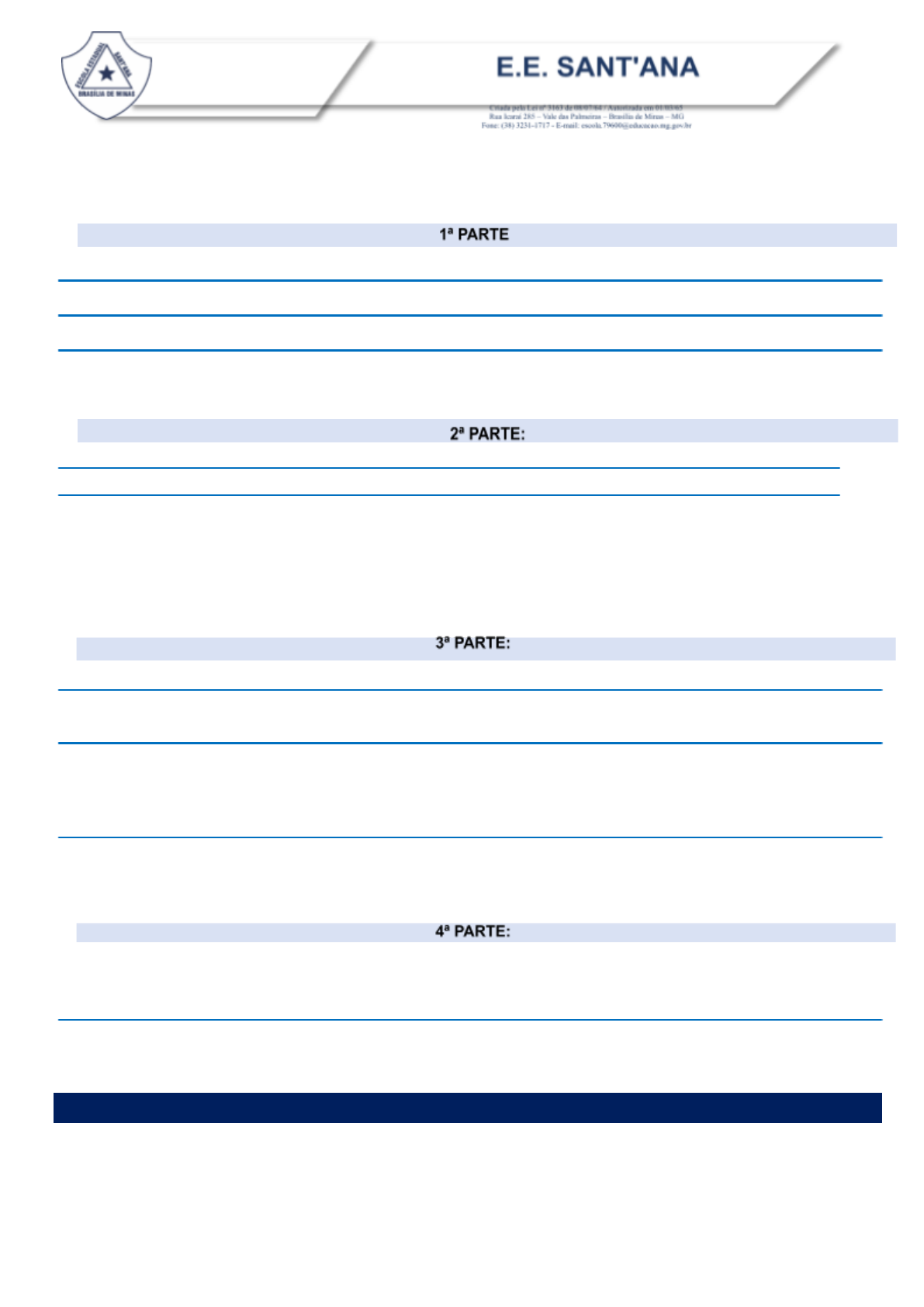 <p>ANEXO I</p><p>Planos de Estudo Educação de Jovens e Adultos</p><p>Plano de Estudo 3º PERÍODO- ENSINO MÉDIO / Turma - EJA</p><p>NOME DA ESCOLA: ESCOLA ESTADUAL SANT`ANA</p><p>PROFESSORA: Thaisa Ferreira da Silva</p><p>COMPONENTE CURRICULAR: Práticas Comunicativas e Criativas</p><p>ETAPA ESCOLAR: EJA ANO ESCOLAR: 3° TURMA: ENSINO MÉDIO BIMESTRE: 2°</p><p>CONTEÚDO:“ Inteligência necessária para o século XXI”.</p><p>HABILIDADE: (EMIFCG09) Participar ativamente da proposição, implementação e avaliação de solução para problemas</p><p>socioculturais e/ou ambientais em nível local, regional, nacional e/ou global, co responsabilizando-se pela realização de</p><p>ações e projetos voltados ao bem comum.</p><p>(CARGA-HORÁRIA: 1 aula semanal SEMANA: 13 a 19/05/2023</p><p>NOME DO ESTUDANTE: Todos os alunos da turma.</p><p>ATIVIDADES PROPOSTAS: Pesquisa sobre “ Inteligência necessária para o século XXI”.</p><p>ORIENTAÇÃO AOS ESTUDANTES E/OU RESPONSÁVEL:</p><p>Faça uma pesquisa sobre o tema: “ Inteligência necessária para o século XXI”.</p><p>Copie no caderno de Práticas Comunicativas e Criativas.</p><p>REFERÊNCIA BIBLIOGRÁFICAS:</p><p>CRMG/MG, Plano de Curso Anual da SEE-MG 2024, (referentes ao 3º Ano – Ensino Médio) e internet.</p><p>REGISTRO DAS ATIVIDADES:</p><p>Os estudantes deverão realizar a pesquisa no caderno de Práticas Comunicativas e Criativas, para conferência</p><p>em sala de aula.</p><p>COMO SERÁ AVALIADO O ESTUDANTE:</p><p>A atividade será avaliada em sala de aula (5,0).</p><p>ATIVIDADES</p><p>PLANO DE ESTUDOS – JOGOS ESCOLARES DE MINAS GERAIS – JEMG/2024</p>