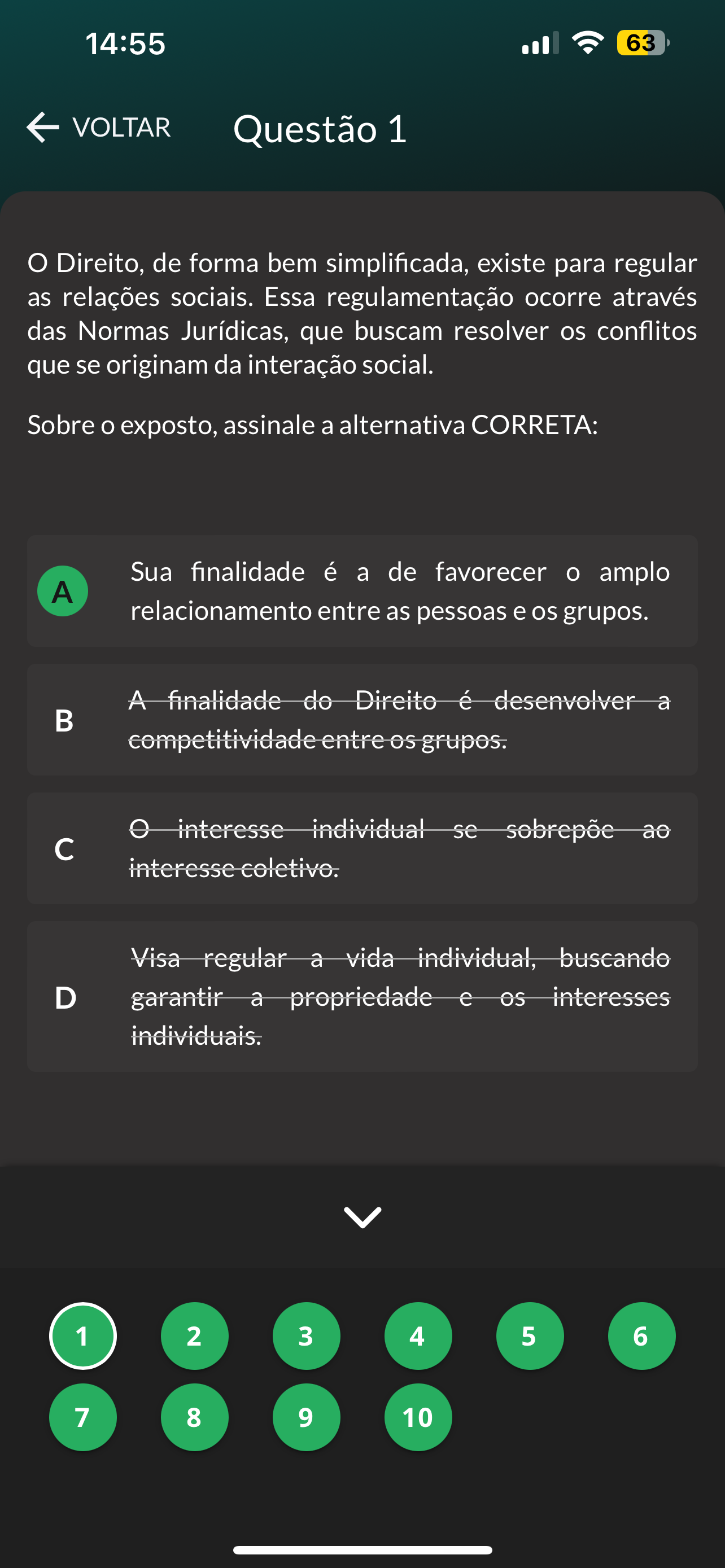 <p>14:55 63 VOLTAR Questão 1 O Direito, de forma bem simplificada, existe para regular as relações sociais. Essa regulamentação ocorre através das Normas Jurídicas, que buscam resolver os conflitos que se originam da interação social. Sobre exposto, assinale a alternativa CORRETA: Sua finalidade é a de favorecer amplo A relacionamento entre as pessoas e os grupos. A finalidade do Direito é desenvolver a competitividade entre grupos. interesse individual se sobrepõe ao C interesse coletivo. Visa regular a vida individual, buscando D garantir a propriedade e interesses individuais. 1 2 3 4 5 6 7 8 9 10</p>