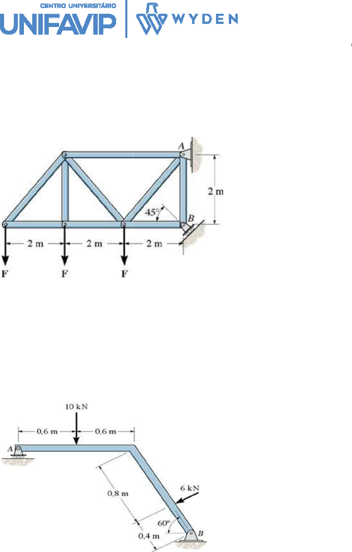 <p>Cap.5:</p><p>1. Determine os componentes horizontal e vertical da reação no pino A e a reação no rolete B,</p><p>necessárias para apoiar a treliça. Considere F = 600 N</p><p>2. Se o rolete em B é capaz de sustentar uma carga máxima de 3 kN, determine a maior</p><p>intensidade de cada uma das três forças que podem ser sustentadas pela treliça do exercício</p><p>anterior.</p><p>3. Determine a reação normal no rolete A e os componentes horizontal</p><p>para o equilíbrio do elemento.</p><p>Bacharelado em Engenharia Civil</p><p>Mecânica Geral</p><p>Professor Thiago Albuquerque</p><p>Determine os componentes horizontal e vertical da reação no pino A e a reação no rolete B,</p><p>necessárias para apoiar a treliça. Considere F = 600 N</p><p>2. Se o rolete em B é capaz de sustentar uma carga máxima de 3 kN, determine a maior</p><p>intensidade de cada uma das três forças que podem ser sustentadas pela treliça do exercício</p><p>3. Determine a reação normal no rolete A e os componentes horizontal e vertical no pino B</p><p>para o equilíbrio do elemento.</p><p>Bacharelado em Engenharia Civil</p><p>Mecânica Geral</p><p>Professor Thiago Albuquerque</p><p>Determine os componentes horizontal e vertical da reação no pino A e a reação no rolete B,</p><p>2. Se o rolete em B é capaz de sustentar uma carga máxima de 3 kN, determine a maior</p><p>intensidade de cada uma das três forças que podem ser sustentadas pela treliça do exercício</p><p>e vertical no pino B</p><p>Cap. 6</p><p>4. Determine a força em cada elemento da treliça e indique se esses elementos estão sob</p><p>tração ou compressão. Considere que P1 = 500 lb e P2 = 100 lb.</p><p>5. Determine a força em cada elemento da treliça e indique se esses elementos estão sob</p><p>tração ou compressão. Considere P1 = P2 = 4 kN.</p><p>6. Determine a força em cada elemento da treliça e indique se esses elementos estão sob</p><p>tração ou compressão. Considere P1 = 500 lb e P2 = 1500 lb.</p><p>Cap.9:</p><p>7. Determine a localização do centróide do fio:</p><p>8. Localize o centróide da área parabólica:</p><p>9. Localize a coordenada x do centróide da área sombreada:</p><p>10. Localize a coordenada z do centróide do cone elíptico reto:</p><p>11. Localize o centro de gravidade do conjunto de dois blocos. Os pesos específicos dos</p><p>materiais A e B são γA = 150 lb/pé</p><p>3</p><p>e γB = 400 lb/pé</p><p>3</p><p>Cap. 10:</p><p>12. Determine o momento de inércia da área sombreada em relação a x e y.</p><p>13. Determine o momento de inércia da área sombreada em relação a x</p><p>14. Determine o momento de inércia da área sombreada em relação a y</p><p>15. Localize a coordenada x do centróide da seção reta para o perfil em ângulo. Em seguida,</p><p>encontre o momento de inércia em relação ao eixo y’ que passa pelo centróide.</p>