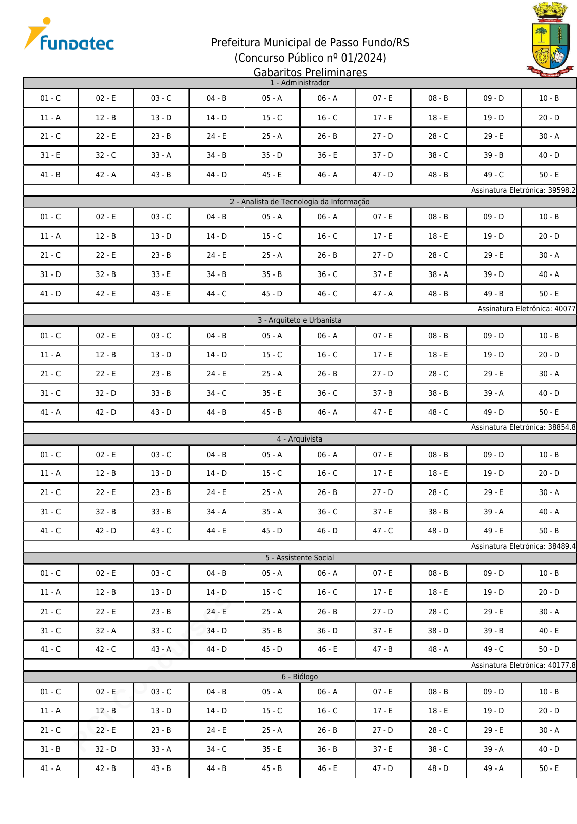 <p>pcimarkpci MDAwMDowMDAwOjAwMDA6MDAwMDowMDAwOmZmZmY6OThmODo0MWUw:V2VkLCAwNCBTZXAgMjAyNCAxNjo0NDoyOSAtMDMwMA==</p><p>www.pciconcursos.com.br</p><p>Prefeitura Municipal de Passo Fundo/RS</p><p>(Concurso Público nº 01/2024)</p><p>Gabaritos Preliminares</p><p>1 - Administrador</p><p>01 - C 02 - E 03 - C 04 - B 05 - A 06 - A 07 - E 08 - B 09 - D 10 - B</p><p>11 - A 12 - B 13 - D 14 - D 15 - C 16 - C 17 - E 18 - E 19 - D 20 - D</p><p>21 - C 22 - E 23 - B 24 - E 25 - A 26 - B 27 - D 28 - C 29 - E 30 - A</p><p>31 - E 32 - C 33 - A 34 - B 35 - D 36 - E 37 - D 38 - C 39 - B 40 - D</p><p>41 - B 42 - A 43 - B 44 - D 45 - E 46 - A 47 - D 48 - B 49 - C 50 - E</p><p>Assinatura Eletrônica: 39598.2</p><p>2 - Analista de Tecnologia da Informação</p><p>01 - C 02 - E 03 - C 04 - B 05 - A 06 - A 07 - E 08 - B 09 - D 10 - B</p><p>11 - A 12 - B 13 - D 14 - D 15 - C 16 - C 17 - E 18 - E 19 - D 20 - D</p><p>21 - C 22 - E 23 - B 24 - E 25 - A 26 - B 27 - D 28 - C 29 - E 30 - A</p><p>31 - D 32 - B 33 - E 34 - B 35 - B 36 - C 37 - E 38 - A 39 - D 40 - A</p><p>41 - D 42 - E 43 - E 44 - C 45 - D 46 - C 47 - A 48 - B 49 - B 50 - E</p><p>Assinatura Eletrônica: 40077</p><p>3 - Arquiteto e Urbanista</p><p>01 - C 02 - E 03 - C 04 - B 05 - A 06 - A 07 - E 08 - B 09 - D 10 - B</p><p>11 - A 12 - B 13 - D 14 - D 15 - C 16 - C 17 - E 18 - E 19 - D 20 - D</p><p>21 - C 22 - E 23 - B 24 - E 25 - A 26 - B 27 - D 28 - C 29 - E 30 - A</p><p>31 - C 32 - D 33 - B 34 - C 35 - E 36 - C 37 - B 38 - B 39 - A 40 - D</p><p>41 - A 42 - D 43 - D 44 - B 45 - B 46 - A 47 - E 48 - C 49 - D 50 - E</p><p>Assinatura Eletrônica: 38854.8</p><p>4 - Arquivista</p><p>01 - C 02 - E 03 - C 04 - B 05 - A 06 - A 07 - E 08 - B 09 - D 10 - B</p><p>11 - A 12 - B 13 - D 14 - D 15 - C 16 - C 17 - E 18 - E 19 - D 20 - D</p><p>21 - C 22 - E 23 - B 24 - E 25 - A 26 - B 27 - D 28 - C 29 - E 30 - A</p><p>31 - C 32 - B 33 - B 34 - A 35 - A 36 - C 37 - E 38 - B 39 - A 40 - A</p><p>41 - C 42 - D 43 - C 44 - E 45 - D 46 - D 47 - C 48 - D 49 - E 50 - B</p><p>Assinatura Eletrônica: 38489.4</p><p>5 - Assistente Social</p><p>01 - C 02 - E 03 - C 04 - B 05 - A 06 - A 07 - E 08 - B 09 - D 10 - B</p><p>11 - A 12 - B 13 - D 14 - D 15 - C 16 - C 17 - E 18 - E 19 - D 20 - D</p><p>21 - C 22 - E 23 - B 24 - E 25 - A 26 - B 27 - D 28 - C 29 - E 30 - A</p><p>31 - C 32 - A 33 - C 34 - D 35 - B 36 - D 37 - E 38 - D 39 - B 40 - E</p><p>41 - C 42 - C 43 - A 44 - D 45 - D 46 - E 47 - B 48 - A 49 - C 50 - D</p><p>Assinatura Eletrônica: 40177.8</p><p>6 - Biólogo</p><p>01 - C 02 - E 03 - C 04 - B 05 - A 06 - A 07 - E 08 - B 09 - D 10 - B</p><p>11 - A 12 - B 13 - D 14 - D 15 - C 16 - C 17 - E 18 - E 19 - D 20 - D</p><p>21 - C 22 - E 23 - B 24 - E 25 - A 26 - B 27 - D 28 - C 29 - E 30 - A</p><p>31 - B 32 - D 33 - A 34 - C 35 - E 36 - B 37 - E 38 - C 39 - A 40 - D</p><p>41 - A 42 - B 43 - B 44 - B 45 - B 46 - E 47 - D 48 - D 49 - A 50 - E</p><p>pcimarkpci MDAwMDowMDAwOjAwMDA6MDAwMDowMDAwOmZmZmY6OThmODo0MWUw:V2VkLCAwNCBTZXAgMjAyNCAxNjo0NDoyOSAtMDMwMA==</p><p>www.pciconcursos.com.br</p><p>Prefeitura Municipal de Passo Fundo/RS</p><p>(Concurso Público nº 01/2024)</p><p>Gabaritos Preliminares</p><p>Assinatura Eletrônica: 37809</p><p>7 - Cirurgião Dentista</p><p>01 - C 02 - E 03 - C 04 - B 05 - A 06 - A 07 - E 08 - B 09 - D 10 - B</p><p>11 - A 12 - B 13 - D 14 - D 15 - C 16 - C 17 - E 18 - E 19 - D 20 - D</p><p>21 - C 22 - E 23 - B 24 - E 25 - A 26 - B 27 - D 28 - C 29 - E 30 - A</p><p>31 - C 32 - D 33 - C 34 - C 35 - E 36 - C 37 - C 38 - A 39 - E 40 - B</p><p>41 - D 42 - E 43 - A 44 - A 45 - D 46 - D 47 - D 48 - A 49 - B 50 - B</p><p>Assinatura Eletrônica: 38061</p><p>8 - Contador (PM)</p><p>01 - C 02 - E 03 - C 04 - B 05 - A 06 - A 07 - E 08 - B 09 - D 10 - B</p><p>11 - A 12 - B 13 - D 14 - D 15 - C 16 - C 17 - E 18 - E 19 - D 20 - D</p><p>21 - C 22 - E 23 - B 24 - E 25 - A 26 - B 27 - D 28 - C 29 - E 30 - A</p><p>31 - A 32 - C 33 - E 34 - D 35 - D 36 - E 37 - B 38 - A 39 - B 40 - C</p><p>41 - B 42 - D 43 - D 44 - A 45 - C 46 - B 47 - D 48 - C 49 - B 50 - E</p><p>Assinatura Eletrônica: 38602.8</p><p>9 - Enfermeiro</p><p>01 - C 02 - E 03 - C 04 - B 05 - A 06 - A 07 - E 08 - B 09 - D 10 - B</p><p>11 - A 12 - B 13 - D 14 - D 15 - C 16 - C 17 - E 18 - E 19 - D 20 - D</p><p>21 - C 22 - E 23 - B 24 - E 25 - A 26 - B 27 - D 28 - C 29 - E 30 - A</p><p>31 - D 32 - B 33 - C 34 - C 35 - A 36 - E 37 - C 38 - E 39 - D 40 - B</p><p>41 - C 42 - E 43 - B 44 - A 45 - A 46 - E 47 - A 48 - D 49 - B 50 - D</p><p>Assinatura Eletrônica: 38413.8</p><p>10 - Engenheiro Agrônomo</p><p>01 - C 02 - E 03 - C 04 - B 05 - A 06 - A 07 - E 08 - B 09 - D 10 - B</p><p>11 - A 12 - B 13 - D 14 - D 15 - C 16 - C 17 - E 18 - E 19 - D 20 - D</p><p>21 - C 22 - E 23 - B 24 - E 25 - A 26 - B 27 - D 28 - C 29 - E 30 - A</p><p>31 - A 32 - E 33 - E 34 - E 35 - C 36 - D 37 - B 38 - D 39 - D 40 - B</p><p>41 - B 42 - A 43 - B 44 - B 45 - A 46 - A 47 - A 48 - D 49 - D 50 - B</p><p>Assinatura Eletrônica: 35200.8</p><p>11 - Engenheiro Civil</p><p>01 - C 02 - E 03 - C 04 - B 05 - A 06 - A 07 - E 08 - B 09 - D 10 - B</p><p>11 - A 12 - B 13 - D 14 - D 15 - C 16 - C 17 - E 18 - E 19 - D 20 - D</p><p>21 - C 22 - E 23 - B 24 - E 25 - A 26 - B 27 - D 28 - C 29 - E 30 - A</p><p>31 - D 32 - E 33 - A 34 - C 35 - C 36 - E 37 - B 38 - A 39 - E 40 - D</p><p>41 - B 42 - C 43 - D 44 - B 45 - C 46 - B 47 - E 48 - A 49 - A 50 - D</p><p>Assinatura Eletrônica: 38187</p><p>12 - Engenheiro Eletricista</p><p>01 - C 02 - E 03 - C 04 - B 05 - A 06 - A 07 - E 08 - B 09 - D 10 - B</p><p>11 - A 12 - B 13 - D 14 - D 15 - C 16 - C 17 - E 18 - E 19 - D 20 - D</p><p>21 - C 22 - E 23 - B 24 - E 25 - A 26 - B 27 - D 28 - C 29 - E 30 - A</p><p>31 - D 32 - B 33 - A 34 - E 35 - A 36 - C 37 - D 38 - D 39 - C 40 - A</p><p>pcimarkpci MDAwMDowMDAwOjAwMDA6MDAwMDowMDAwOmZmZmY6OThmODo0MWUw:V2VkLCAwNCBTZXAgMjAyNCAxNjo0NDoyOSAtMDMwMA==</p><p>www.pciconcursos.com.br</p><p>Prefeitura Municipal de Passo Fundo/RS</p><p>(Concurso Público nº 01/2024)</p><p>Gabaritos Prelimina