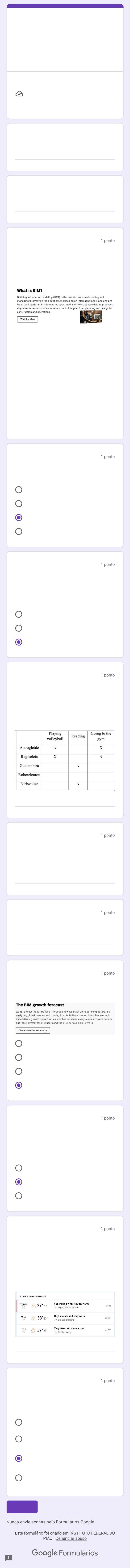 <p>E-mail *</p><p>1 ponto</p><p>1 ponto</p><p>lifecycle</p><p>digital representation</p><p>asset</p><p>across</p><p>1 ponto</p><p>Gostar</p><p>Parecer</p><p>Como</p><p>1 ponto</p><p>1 ponto</p><p>1 ponto</p><p>1 ponto</p><p>future</p><p>we</p><p>BIM</p><p>competitors</p><p>1 ponto</p><p>Gostar</p><p>Parecer</p><p>Como</p><p>1 ponto</p><p>1 ponto</p><p>On Wednesday the heat will increase.</p><p>Today and Thursday have the same</p><p>temperature.</p><p>In two different days there are high</p><p>possibilities of rain.</p><p>In three different days the weather</p><p>will be warm.</p><p>Nunca envie senhas pelo Formulários Google.</p><p>Este formulário foi criado em INSTITUTO FEDERAL DO</p><p>PIAUÍ. Denunciar abuso</p><p>305 - Edificações -</p><p>Trabalho</p><p>Leitura e interpretação de texto, likes e</p><p>dislikes, presente simples (do/does),</p><p>adjetivos e pronomes possessivos.</p><p>raykasharlyene@gmail.com Mudar de conta</p><p>* Indica uma pergunta obrigatória</p><p>Seu e-mail</p><p>Seu nome: *</p><p>Sua resposta</p><p>1 - Leia o trecho abaixo (retirado</p><p>de</p><p>https://www.autodesk.com/solu</p><p>tions/aec/bim) e responda EM</p><p>PORTUGUÊS: O que é BIM?</p><p>*</p><p>O nome em português é: Modelagem de</p><p>informação de construção. É um software</p><p>que integra criação e gerenciamento de</p><p>informação para um ativo construtivo. O</p><p>software baseia-se em um modelo pronto</p><p>inteligente e se habilita por uma plataforma</p><p>de nuvem. O BIM produz uma representação</p><p>digital usando dados estruturais e com</p><p>multidisciplinares para que possa fazer</p><p>desde o planejamento ao designer da</p><p>construção até e operações. Resumindo, ele</p><p>é um software que você joga os dados do</p><p>projeto juntamente dos comandos e então</p><p>ele cria o projeto.</p><p>2 - O pronome possessivo "its",</p><p>que aparece na penúltima linha</p><p>do trecho acima refere-se a:</p><p>*</p><p>3 - No trecho adaptado a seguir:</p><p>" Based on things like: structure,</p><p>multi-disciplinary data and</p><p>information." , a palavra "like"</p><p>tem o sentido de:</p><p>*</p><p>4 - Sobre gostar e não gostar,</p><p>escreva uma frase sobre</p><p>Regiscléia / playing</p><p>volleyball(de acordo com as</p><p>informações mostradas na</p><p>tabela):</p><p>*</p><p>Sua resposta</p><p>5 - Sobre a mesma tabela,</p><p>escreva uma frase sobre</p><p>Guatambira e Nirisvalter /</p><p>reading.</p><p>*</p><p>Sua resposta</p><p>6 - Outra frase sobre</p><p>Astrogleide/playing volleyball.</p><p>*</p><p>Sua resposta</p><p>7 - No texto abaixo a palavra</p><p>"our", na primeira linha, refere-se</p><p>a:</p><p>*</p><p>8 - Na última frase do trecho</p><p>acima; "Perfect for BIM users</p><p>and the BIM-curious alike", a</p><p>palavra "alike" tem seu sentido</p><p>voltado a:</p><p>*</p><p>9 - Observe a palavra "forecast"</p><p>no texto anterior e no texto</p><p>abaixo. Sem pesquisar, e</p><p>baseado(a) em seus</p><p>levantamentos, qual seria a</p><p>melhor tradução para esta</p><p>palavra?</p><p>*</p><p>Sua resposta</p><p>10 - A imagem da questão 9</p><p>mostra a temperatura na cidade</p><p>de Teresina. Marque a</p><p>alternativa falsa.</p><p>*</p><p>Enviar Limpar formulário</p><p>Formulários</p><p>04/09/2024, 12:55</p><p>Página 1 de 1</p>