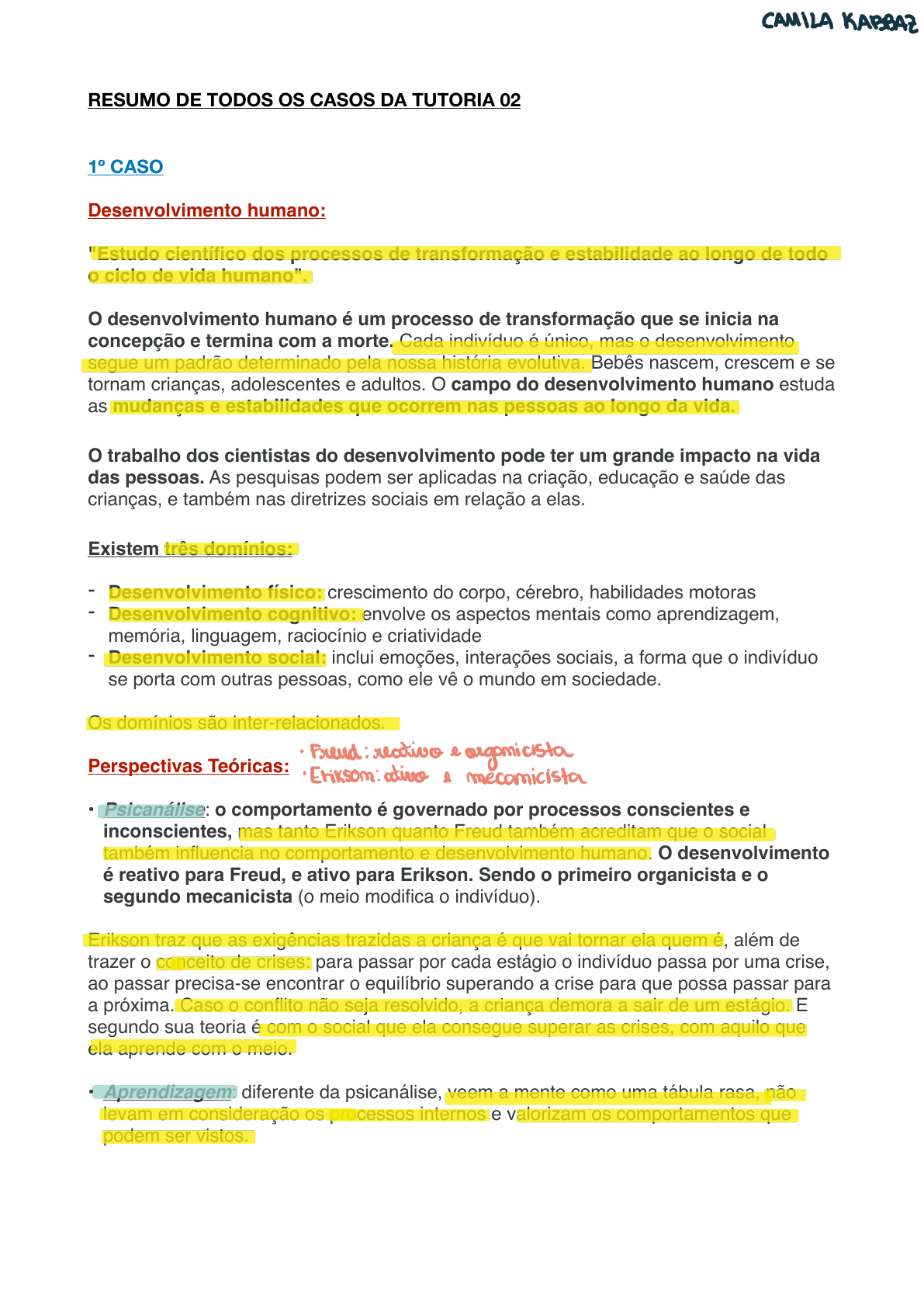 <p>RESUMO DE TODOS OS CASOS DA TUTORIA 02</p><p>1º CASO</p><p>Desenvolvimento humano:</p><p>"Estudo científico dos processos de transformação e estabilidade ao longo de todo</p><p>o ciclo de vida humano".</p><p>O desenvolvimento humano é um processo de transformação que se inicia na</p><p>concepção e termina com a morte. Cada indivíduo é único, mas o desenvolvimento</p><p>segue um padrão determinado pela nossa história evolutiva. Bebês nascem, crescem e se</p><p>tornam crianças, adolescentes e adultos. O campo do desenvolvimento humano estuda</p><p>as mudanças e estabilidades que ocorrem nas pessoas ao longo da vida.</p><p>O trabalho dos cientistas do desenvolvimento pode ter um grande impacto na vida</p><p>das pessoas. As pesquisas podem ser aplicadas na criação, educação e saúde das</p><p>crianças, e também nas diretrizes sociais em relação a elas.</p><p>Existem três domínios:</p><p>- Desenvolvimento físico: crescimento do corpo, cérebro, habilidades motoras</p><p>- Desenvolvimento cognitivo: envolve os aspectos mentais como aprendizagem,</p><p>memória, linguagem, raciocínio e criatividade</p><p>- Desenvolvimento social: inclui emoções, interações sociais, a forma que o indivíduo</p><p>se porta com outras pessoas, como ele vê o mundo em sociedade.</p><p>Os domínios são inter-relacionados.</p><p>Perspectivas Teóricas:</p><p>• Psicanálise: o comportamento é governado por processos conscientes e</p><p>inconscientes, mas tanto Erikson quanto Freud também acreditam que o social</p><p>também influencia no comportamento e desenvolvimento humano. O desenvolvimento</p><p>é reativo para Freud, e ativo para Erikson. Sendo o primeiro organicista e o</p><p>segundo mecanicista (o meio modifica o indivíduo).</p><p>Erikson traz que as exigências trazidas a criança é que vai tornar ela quem é, além de</p><p>trazer o conceito de crises: para passar por cada estágio o indivíduo passa por uma crise,</p><p>ao passar precisa-se encontrar o equilíbrio superando a crise para que possa passar para</p><p>a próxima. Caso o conflito não seja resolvido, a criança demora a sair de um estágio. E</p><p>segundo sua teoria é com o social que ela consegue superar as crises, com aquilo que</p><p>ela aprende com o meio.</p><p>• Aprendizagem: diferente da psicanálise, veem a mente como uma tábula rasa, não</p><p>levam em consideração os processos internos e valorizam os comportamentos que</p><p>podem ser vistos.</p><p>Tanto a teoria de Bandura como a do Behaviorismo são mecanicistas, mas o</p><p>Behaviorismo considera o indivíduo reativo enquanto Bandura considera o</p><p>indivíduo reativo e ativo também. Nessa perspectiva, é dito que a criança aprende e</p><p>se desenvolve repetindo ações que ela vê. E que o ambiente é um divisor de águas no</p><p>desenvolvimento de alguém.</p><p>É bidirecional pois depende como a criança reage ao ambiente, mas Bandura traz que</p><p>nem tudo depende do estímulo. A criança não imita todos os modelos, imita aqueles</p><p>em que se identifica, segundo Bandura.</p><p>• Cognitiva: Advinda de Piaget e Vygotsky, podem ser tanto mecanicistas quanto</p><p>organicistas, e consideram o indivíduo ativo.</p><p>A teoria de Piaget é dos estágios cognitivos, e a de Vygotsky se chama</p><p>sociocultural. Essas teorias têm foco no processamento de pensamentos e</p><p>comportamentos, levando em consideração memória, linguagem, e aspectos</p><p>cognitivos do desenvolvimento.</p><p>Vygotsky fala que a interação social é o que vai modular nosso desenvolvimento</p><p>cognitivo.</p><p>Existe uma zona de desenvolvimento proximal, que é um espaço de</p><p>desenvolvimento da criança, sendo o estágio em que a criança descobre as ações</p><p>que pode fazer sem ajuda do “andaime” que seria o pai ou a mãe dessa criança.</p><p>Essa teoria tem a aplicação de testes de inteligência para avaliar a zona de</p><p>desenvolvimento proximal, e até onde vai a mesma. Essa teoria também pode ser</p><p>considerada contextual pois leva em consideração o contexto em que o indivíduo está</p><p>inserido.</p><p>Já Piaget fala que não somente as experiências influenciam no desenvolvimento</p><p>cognitivo, mas também as experiências inatas.</p><p>Existem estágios:</p><p>- Organização: Quando a criança cria categorias que são esquemas;</p><p>• Termo de Piaget para a criação de categorias ou sistemas de conhecimento.</p><p>• Envolve o desenvolvimento de estruturas cognitivas chamadas esquemas, que são</p><p>modos de organizar informações sobre o mundo.</p><p>• Os esquemas começam como estruturas concretas e simples e se tornam</p><p>progressivamente mais abstratos e complexos à medida que a criança adquire</p><p>mais informações</p><p>- Adaptação: Refere-se ao modo como a criança lida com novas informações à luz do</p><p>que ela já sabe;</p><p>• Envolve dois processos complementares:</p><p>• Assimilação: incorporação de novas informações em estruturas cognitivas</p><p>existentes.</p><p>• Acomodação: ajuste das estruturas cognitivas para incorporar novas informações.</p><p>- Equilibração: Termo de Piaget para a tendência a procurar um equilíbrio estável entre</p><p>os elementos cognitivos;</p><p>• Obtido através do equilíbrio entre assimilação e acomodação.</p><p>• A busca pelo equilíbrio é uma força motivadora por trás do crescimento cognitivo,</p><p>levando a criança a ajustar suas estruturas cognitivas para corresponder às novas</p><p>experiências.</p><p>Vygotsky é mecanicista e considera o indivíduo ativo, já Piaget considera o indivíduo</p><p>ativo, mas é organicista e mecanicista.</p><p>A teoria do processamento de informação observa e analisa os processos mentais</p><p>envolvidos no processamento de informações, foi criada por diversos teóricos e bebe do</p><p>behaviorismo quando cita estímulo; o cérebro funciona como um computador, e
