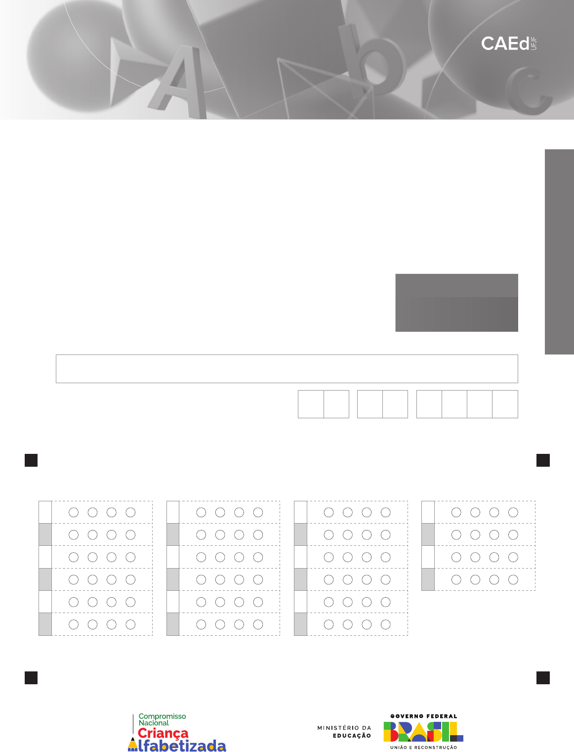 <p>CA D E R N O</p><p>Data de Nascimento</p><p>do(a) estudante</p><p>Nome do(a) estudante</p><p>M 0 2 0 1</p><p>AVALIAÇÃO CONTÍNUA DA APRENDIZAGEM</p><p>CICLO II</p><p>2024</p><p>2º ano do Ensino Fundamental</p><p>MATEMÁTICA</p><p>C</p><p>A</p><p>D</p><p>E</p><p>R</p><p>N</p><p>O</p><p>D</p><p>O</p><p>A</p><p>P</p><p>LI</p><p>C</p><p>A</p><p>D</p><p>O</p><p>R</p><p>CADERNO DO APLICADOR</p><p>44445544119977332299</p><p>01 DCBA</p><p>02 DCBA</p><p>03 DCBA</p><p>04 DCBA</p><p>05 DCBA</p><p>06 DCBA</p><p>07 DCBA</p><p>08 DCBA</p><p>09 DCBA</p><p>10 DCBA</p><p>11 DCBA</p><p>12 DCBA</p><p>13 DCBA</p><p>14 DCBA</p><p>15 DCBA</p><p>16 DCBA</p><p>17 DCBA</p><p>18 DCBA</p><p>19 DCBA</p><p>20 DCBA</p><p>21 DCBA</p><p>22 DCBA</p><p>EXEMPLO</p><p>Aplicador, ler SOMENTE a(s) informação(ões) que apresenta(m) o desenho de um megafone m.</p><p>M Vamos fazer juntos um exemplo de uma atividade.</p><p>Aplicador, ler SOMENTE a(s) informação(ões) que apresenta(m) o desenho de um megafone m.</p><p>M OBSERVE ABAIXO A CONTA QUE A PROFESSORA ANA ESCREVEU</p><p>NO QUADRO.</p><p>Não deve ser</p><p>lido.</p><p>15 + 4</p><p>M QUAL É O RESULTADO DESSA CONTA?</p><p>11</p><p>Não deve ser lido.</p><p>18</p><p>19</p><p>55</p><p>BL01M02</p><p>Aplicador, ler SOMENTE a(s) informação(ões) que apresenta(m) o desenho de um megafone m.</p><p>M OUÇA E OBSERVE O TEXTO ABAIXO PARA RESPONDER ÀS QUATRO</p><p>QUESTÕES A SEGUIR.</p><p>M OBSERVE, NA FIGURA ABAIXO, AS MERCADORIAS À VENDA NA</p><p>MERCEARIA DE HÉLIO E O FUNCIONÁRIO DAVI CARREGANDO UMA CAIXA</p><p>COM CARTELAS DE OVOS.</p><p>(M00061196_CEN)</p><p>M0201_APLIC</p><p>1</p><p>BL01M02</p><p>Aplicador, ler SOMENTE a(s) informação(ões) que apresenta(m) o desenho de um megafone m.</p><p>Questão 01 M00061198</p><p>M PARA ORGANIZAR A MERCEARIA, HÉLIO COLOCOU 25 CAIXAS DE LEITE</p><p>INTEGRAL E 13 CAIXAS DE LEITE DESNATADO EM UMA PRATELEIRA QUE</p><p>ESTAVA VAZIA.</p><p>M QUANTAS CAIXAS DE LEITE FORAM COLOCADAS, AO TODO, NESSA</p><p>PRATELEIRA?</p><p>q 83.</p><p>q 38.</p><p>q 28.</p><p>q 12.</p><p>M0201_APLIC</p><p>2</p><p>BL01M02</p><p>Aplicador, ler SOMENTE a(s) informação(ões) que apresenta(m) o desenho de um megafone m.</p><p>Questão 02 M00061197</p><p>M OBSERVE ABAIXO A CAIXA COM CARTELAS DE OVOS QUE DAVI</p><p>GUARDOU NO ESTOQUE DA MERCEARIA.</p><p>M A FORMA DESSA CAIXA LEMBRA QUAL FIGURA GEOMÉTRICA?</p><p>q</p><p>q</p><p>q</p><p>q</p><p>M0201_APLIC</p><p>3</p><p>BL01M02</p><p>Aplicador, ler SOMENTE a(s) informação(ões) que apresenta(m) o desenho de um megafone m.</p><p>Questão 03 M00061196</p><p>M OBSERVE ABAIXO AS QUANTIDADES DE MAÇÃS E DE PERAS VENDIDAS</p><p>PARA UM CLIENTE DA MERCEARIA DE HÉLIO.</p><p>M QUANTAS MAÇÃS FORAM VENDIDAS A MAIS DO QUE A QUANTIDADE DE</p><p>PERAS PARA ESSE CLIENTE?</p><p>q 27.</p><p>q 15.</p><p>q 3.</p><p>q 2.</p><p>M0201_APLIC</p><p>4</p><p>BL01M02</p><p>Aplicador, ler SOMENTE a(s) informação(ões) que apresenta(m) o desenho de um megafone m.</p><p>Questão 04 M00061200</p><p>M O GRÁFICO ABAIXO APRESENTA A QUANTIDADE DE PRODUTOS</p><p>DE HIGIENE QUE HÉLIO RECEBEU E GUARDOU NO ESTOQUE DE SUA</p><p>MERCEARIA.</p><p>0</p><p>10</p><p>20</p><p>30</p><p>40</p><p>50</p><p>60</p><p>70</p><p>80</p><p>90</p><p>100</p><p>DESODORANTEPASTA</p><p>DE DENTE</p><p>SABONETEESCOVA</p><p>DE DENTE</p><p>PRODUTOS DE HIGIENE</p><p>PRODUTOS DE HIGIENE</p><p>5050</p><p>7070</p><p>6060</p><p>4040</p><p>Q</p><p>U</p><p>A</p><p>N</p><p>TI</p><p>D</p><p>A</p><p>D</p><p>E</p><p>D</p><p>E</p><p>PR</p><p>O</p><p>D</p><p>U</p><p>TO</p><p>S</p><p>M DE ACORDO COM ESSE GRÁFICO, QUAL PRODUTO DE HIGIENE HÉLIO</p><p>RECEBEU EM MENOR QUANTIDADE?</p><p>q DESODORANTE.</p><p>q ESCOVA DE DENTE.</p><p>q PASTA DE DENTE.</p><p>q SABONETE.</p><p>M0201_APLIC</p><p>5</p><p>BL02M02</p><p>Aplicador, ler SOMENTE a(s) informação(ões) que apresenta(m) o desenho de um megafone m.</p><p>M OUÇA E OBSERVE O TEXTO ABAIXO PARA RESPONDER ÀS QUATRO</p><p>QUESTÕES A SEGUIR.</p><p>M CINCO AMIGOS COLECIONAM FIGURINHAS. OBSERVE ABAIXO ESSES</p><p>AMIGOS TROCANDO SUAS FIGURINHAS QUE SÃO REPETIDAS.</p><p>HUGO</p><p>LARA</p><p>MIGUEL</p><p>VERA</p><p>NELSON</p><p>(M00061571_CEN)</p><p>M0201_APLIC</p><p>6</p><p>BL02M02</p><p>Aplicador, ler SOMENTE a(s) informação(ões) que apresenta(m) o desenho de um megafone m.</p><p>Questão 05 M00061572</p><p>M UMA DAS CRIANÇAS SE CHAMA VERA. AS FIGURINHAS REPETIDAS QUE</p><p>VERA POSSUI ESTÃO REPRESENTADAS ABAIXO.</p><p>M QUANTAS FIGURINHAS REPETIDAS VERA POSSUI NO TOTAL?</p><p>q 42.</p><p>q 41.</p><p>q 7.</p><p>q 6.</p><p>M0201_APLIC</p><p>7</p><p>BL02M02</p><p>Aplicador, ler SOMENTE a(s) informação(ões) que apresenta(m) o desenho de um megafone m.</p><p>Questão 06 M00061573</p><p>M HUGO POSSUI 284 FIGURINHAS REPETIDAS. ELE ESCOLHEU 13 DESSAS</p><p>FIGURINHAS PARA PRESENTEAR LARA.</p><p>M COM QUANTAS FIGURINHAS REPETIDAS HUGO FICOU DEPOIS DE</p><p>PRESENTEAR LARA?</p><p>q 154.</p><p>q 271.</p><p>q 284.</p><p>q 297.</p><p>M0201_APLIC</p><p>8</p><p>BL02M02</p><p>Aplicador, ler SOMENTE a(s) informação(ões) que apresenta(m) o desenho de um megafone m.</p><p>Questão 07 M00061574</p><p>M OBSERVE ABAIXO A QUANTIDADE DE FIGURINHAS QUE CADA UM DOS</p><p>AMIGOS POSSUI EM SEU ÁLBUM.</p><p>267</p><p>HUGO</p><p>192</p><p>LARA</p><p>364</p><p>MIGUEL</p><p>495</p><p>NELSON</p><p>281</p><p>VERA</p><p>M QUAL É A ORDEM CRESCENTE DESSAS QUANTIDADES?</p><p>q 192 – 267 – 281 – 364 – 495.</p><p>q 281 – 192 – 364 – 495 – 267.</p><p>q 364 – 267 – 281 – 192 – 495.</p><p>q 495 – 364 – 281 – 267 – 192.</p><p>M0201_APLIC</p><p>9</p><p>BL02M02</p><p>Aplicador, ler SOMENTE a(s) informação(ões) que apresenta(m) o desenho de um megafone m.</p><p>Questão 08 M00061575</p><p>M NELSON USOU AS MOEDAS ABAIXO PARA COMPRAR 1 PACOTE DE</p><p>FIGURINHAS.</p><p>M VERA COMPROU UM PACOTE DE FIGURINHAS IGUAL AO QUE NELSON</p><p>COMPROU, USANDO SOMENTE MOEDAS DE 1 REAL.</p><p>M QUAL É O CONJUNTO DE MOEDAS DE 1 REAL QU