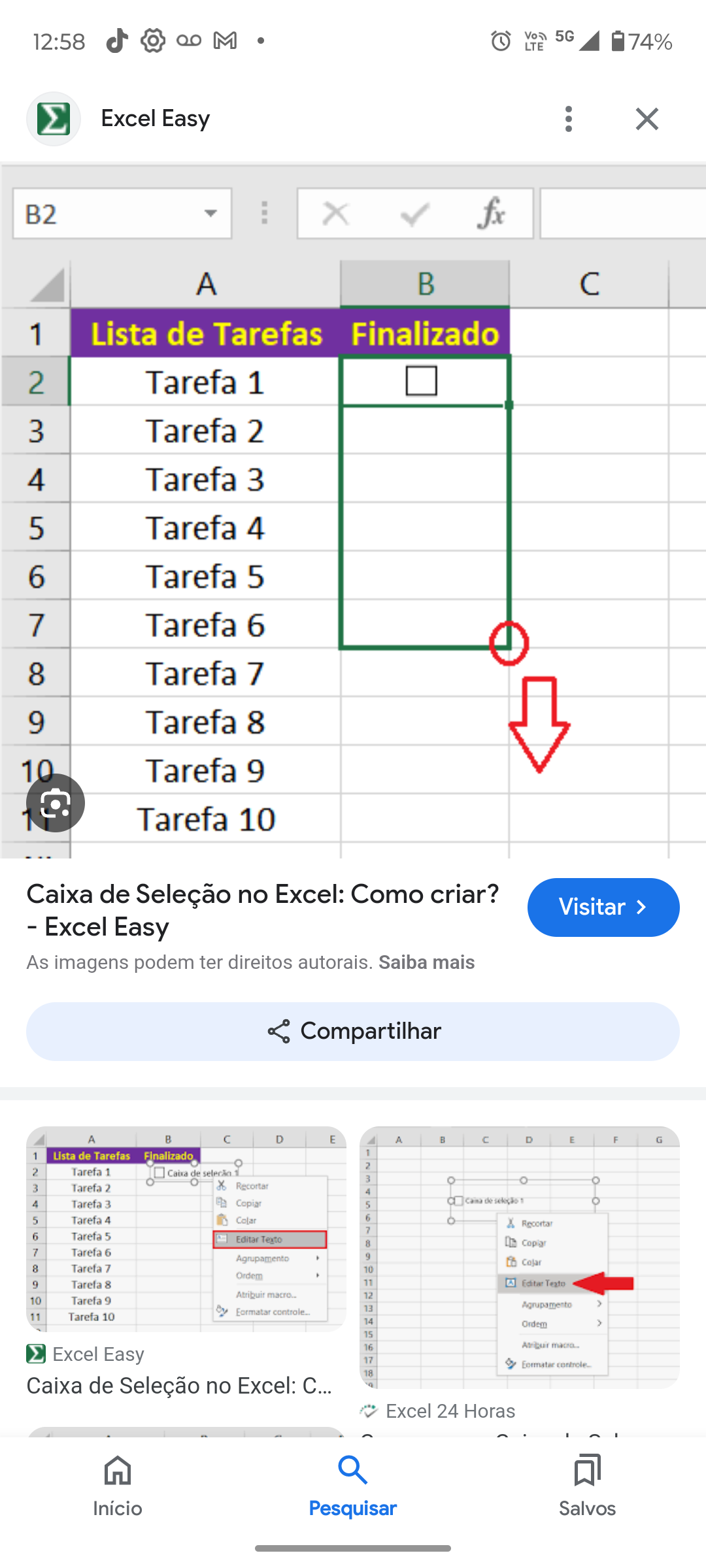 <p>12:58 5G LTE 74% Excel Easy X B2 A B C 1 Lista de Tarefas Finalizado 2 Tarefa 1 3 Tarefa 2 4 Tarefa 3 5 Tarefa 4 6 Tarefa 5 7 Tarefa 6 8 Tarefa 7 9 Tarefa 8 10 Tarefa 9 Tarefa 10 Caixa de Seleção no Excel: Como criar? Visitar > - Excel Easy As imagens podem ter direitos autorais. Saiba mais Compartilhar A B C D E A B 1 Lista de Tarefas Finalizado 1 2 2 Tarefa 1 Caixa de seleção 1 3 3 Tarefa 2 Recortar 4 4 Tarefa 3 5 de 1 5 Tarefa 4 Colar 6 7 6 Tarefa 5 Editar Texto 8 7 Tarefa 6 Agrupamento 9 8 Tarefa 7 10 Ordem 9 Tarefa 8 11 Editar 12 10 Tarefa 9 Formatar controle. 13 Agrupamento 11 Tarefa 10 14 Ordem 15 16 Excel Easy 17 18 Caixa de Seleção no Excel: C Excel 24 Horas Início Pesquisar Salvos</p>