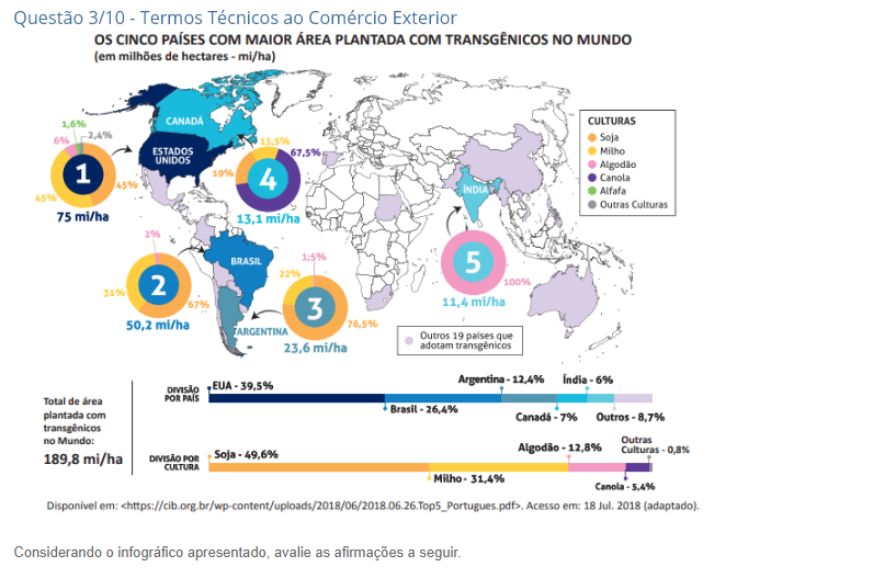 <p>Questão 3/10 - Termos Técnicos ao Comércio Exterior os CINCO PAÍSES COM MAIOR ÁREA PLANTADA COM TRANSGÊNICOS NO MUNDO (em milhões de hectares - mi/ha) 1,6% CANADA CULTURAS 2,4% 6% 13.5% Soja ESTADOS Milho UNIDOS 1 Algodão 19% 45% 4 Canola INDIA Alfafa 45% Outras Culturas 75 mi/ha 13,1 mi/ha 2% BRASIL 5 22% 31% 2 100% 67% 3 11,4 mi/ha 50,2 mi/ha Outros 19 países que - 23,6 mi/ha adotam transgênicos Argentina India 6% EUA 39.5% Total de área POR PAÍS Brasil plantada com Canada 7% Outros 8,7% transgênicos no Mundo: Outras Algodão 12,8% DIVISÃO POR Soja Culturas 0,8% 189,8 mi/ha CULTURA Milho 31,4% Canola 5.4% Disponível Acesso em: 18 Jul. 2018 (adaptado). Considerando 0 infográfico apresentado, avalie as afirmações a seguir.</p>