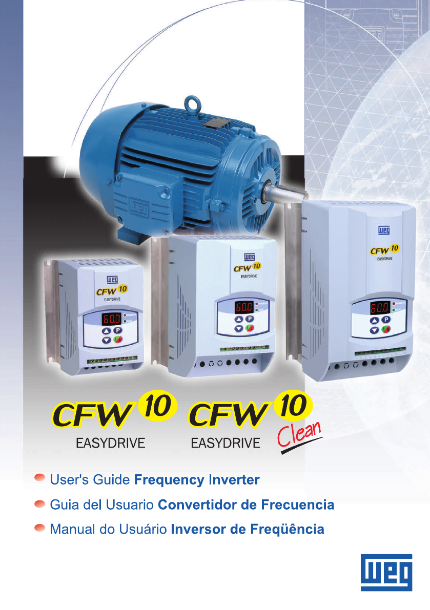 <p>Série: CFW-10</p><p>Software: versão 2.0X e 2.2X</p><p>0899.5860 P/6</p><p>ATENÇÃO!</p><p>É muito importante conferir se a</p><p>versão de software do inversor é</p><p>igual a indicada acima.</p><p>11/2007</p><p>MANUAL DO</p><p>INVERSOR DE</p><p>FREQÜÊNCIA</p><p>4</p><p>Sumário das Revisões</p><p>A tabela abaixo descreve as revisões ocorridas neste</p><p>manual:</p><p>Revisão Descrição da Revisão Capítulo</p><p>1 Primeira Revisão -</p><p>2 Revisão Geral -</p><p>3 Inclusão CFW-10 MEC II e -</p><p>Filtro EMC MEC I</p><p>4 Inclusão CFW-10 MEC III e -</p><p>Filtros EMC MEC II e MEC III</p><p>5 Inclusão das Versões Plus e Clean -</p><p>do CFW-10</p><p>6</p><p>Inclusão dos modelos trifásicos, -</p><p>Cold Plate e com filtro Built-in</p><p>Índice</p><p>Referência Rápida dos Parâmetros,</p><p>Mensagens de Erro e Estado</p><p>I Parâmetros ................................................................ 08</p><p>II Mensagens de Erro .................................................... 11</p><p>III Outras Mensagens ...................................................... 11</p><p>CAPÍTULO 1</p><p>Instruções de Segurança</p><p>1.1 Avisos de Segurança no Manual ............................ 12</p><p>1.2 Aviso de Segurança no Produto ............................. 12</p><p>1.3 Recomendações Preliminares ............................... 12</p><p>CAPÍTULO 2</p><p>Informações Gerais</p><p>2.1 Sobre o Manual ...................................................... 14</p><p>2.2 Versão de Software................................................ 14</p><p>2.3 Sobre o CFW-10.................................................... 15</p><p>2.4 Etiquetas de Identificação do CFW-10 ................... 19</p><p>2.5 Recebimento eArmazenamento ............................ 21</p><p>CAPÍTULO 3</p><p>Instalação e Conexão</p><p>3.1 Instalação Mecânica ................................................ 22</p><p>3.1.1 Ambiente ............................................................ 22</p><p>3.1.2 Dimensões do CFW-10 ..................................... 22</p><p>3.1.3 Posicionamento/Fixação.................................... 25</p><p>3.1.3.1 Montagem em Painel ................................ 26</p><p>3.1.3.2 Montagem em Superfície .......................... 26</p><p>3.2 Instalação Elétrica .................................................... 26</p><p>3.2.1 Bornes de Potência e Aterramento .................... 26</p><p>3.2.2 Localização das Conexões de Potência,</p><p>Aterramento e Controle ...................................... 27</p><p>3.2.3 Fiação e fusíveis para Potência e Aterramento .. 28</p><p>3.2.4 Conexões de Potência ....................................... 29</p><p>3.2.4.1 Conexões da Entrada CA ......................... 31</p><p>3.2.4.2 Conexões da Saída................................... 31</p><p>3.2.4.3 Conexões de Aterramento ......................... 32</p><p>3.2.5 Conexões de Sinal e Controle............................ 34</p><p>3.2.6 Acionamentos Típicos ........................................ 36</p><p>3.3 Diretiva Européia de Compatibilidade Eletromagnética -</p><p>Requisitos para Instalações ..................................... 38</p><p>3.3.1 Instalação ........................................................... 39</p><p>3.3.2 Especificação dos Níveis de Emissão e</p><p>Imunidade .......................................................... 40</p><p>3.3.3 Inversores e Filtros ............................................. 41</p><p>3.3.4 Características dos Filtros EMC ........................ 43</p><p>Índice</p><p>CAPÍTULO 4</p><p>Uso da HMI</p><p>4.1 Descrição da Interface Homem-Máquina ................. 47</p><p>4.2 Uso da HMI .............................................................. 48</p><p>4.2.1 Uso da HMI para Operação do Inversor .............. 48</p><p>4.2.2 Sinalizações/Indicações no Display da HMI ....... 49</p><p>4.2.3 Parâmetros de Leitura ....................................... 50</p><p>4.2.4 Visualização/Alteração de Parâmetros .............. 50</p><p>CAPÍTULO 5</p><p>Energização/Colocação em Funcionamento</p><p>5.1 Preparação para Energização ................................. 52</p><p>5.2 Energização ............................................................ 52</p><p>5.3 Colocação em Funcionamento ................................ 53</p><p>5.3.1 Colocação em Funcionamento - ............................</p><p>Operação pela HMI ............................................ 53</p><p>5.3.2 Colocação em Funcionamento -</p><p>Operação via Bornes ......................................... 54</p><p>CAPÍTULO 6</p><p>Descrição Detalhada dos Parâmetros</p><p>6.1 Simbologia Utilizada ................................................ 55</p><p>6.2 Introdução ................................................................ 55</p><p>6.2.1 Controle V/F (Escalar) ........................................ 55</p><p>6.2.2 Fontes de Referência de Freqüência ................. 56</p><p>6.2.3 Comandos ......................................................... 59</p><p>6.2.4 Definição das Situações de Operação Local/</p><p>Remoto .............................................................. 59</p><p>6.3 Relação de Parâmetros ........................................... 60</p><p>6.3.1 Parâmetros de Acesso e de Leitura -</p><p>P000 a P099 ..................................................... 61</p><p>6.3.2 Parâmetros de Regulação - P100 a P199 ......... 62</p><p>6.3.3 Parâmetros de Configuração - P200 a P398 ..... 70</p><p>6.3.4 Parâmetros das</p><p>Funções Especiais - P500 a P599 .................... 86</p><p>6.3.4.1 Introdução ................................................. 86</p><p>6.3.4.2 Descrição ................................................. 87</p><p>6.3.4.3 Guia para Colocação em Funcionamento . 89</p><p>CAPÍTULO 7</p><p>Solução e Prevenção de Falh