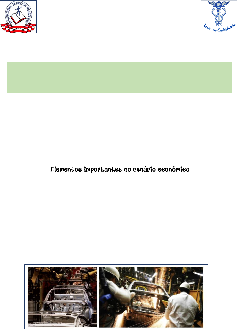 <p>INSTITUTO ESTADUAL DE EDUCAÇÃO PROFESSOR ISAÍAS</p><p>CURSO TÉCNICO EM CONTABILIDADE</p><p>HABILIDADE: ECONOMIA E MERCADO</p><p>1º MÓDULO – TURMA TC1A PROFª DANIELA OLIVEIRA</p><p>ECONOMIA</p><p>“É a ciência que estuda os recursos escassos e as alternativas de produção, para atender as</p><p>necessidades ilimitadas dos indivíduos.”</p><p>“...compete o estudo da ação econômica do homem, envolvendo essencialmente o processo de</p><p>produção, a geração e a apropriação da renda, o dispêndio e a acumulação” (Rossetti, p.31).</p><p>Desta forma, a economia se preocupa em entender, estudar e analisar situações de</p><p>escassez envolvidas em processos produtivos ou prestações de serviços.</p><p>Atenção: um dos recursos econômicos para a produção é a mão-de-obra. Em alguns</p><p>setores da economia a mão-de-obra é escassa porque nestes setores há a necessidade de</p><p>pessoas com maior qualificação técnica e nem todos atendem a este requisito. Assim, aqueles</p><p>poucos que possuem essa melhor qualificação profissional são disputados pelas empresas que</p><p>deles necessitam para compor seus quadros de pessoal. Essa disputa aumenta o valor do</p><p>recurso, ou seja, aumenta o valor dos salários ofertados para estas pessoas qualificadas. Isto</p><p>ocorre porque há escassez deste tipo de recurso nestes setores da economia.</p><p>A economia é movimentada em função de alguns elementos-chave que estão</p><p>presentes nos processos de produção e consumo. Podemos observar alguns destes elementos</p><p>a seguir, bem como suas definições e conceitos.</p><p>• Agentes: comportamento dos consumidores de bens e serviços. Ex.: pessoas, empresas</p><p>e governo.</p><p>• Escassez: produtos escassos são aqueles que em alguns momentos tem sua oferta</p><p>reduzida para os consumidores.</p><p>Por exemplo, o leite na entressafra de produção; nesta época de escassez, o leite custará</p><p>mais caro para o consumidor.</p><p>• Produção: processo produtivo para gerar riqueza e satisfação para consumidores. Ex:</p><p>produção de um carro.</p><p>Figura 1: Linha de Produção de um carro.</p><p>INSTITUTO ESTADUAL DE EDUCAÇÃO PROFESSOR ISAÍAS</p><p>CURSO TÉCNICO EM CONTABILIDADE</p><p>HABILIDADE: ECONOMIA E MERCADO</p><p>1º MÓDULO – TURMA TC1A PROFª DANIELA OLIVEIRA</p><p>• Mercado: local onde se comercializam produtos ou serviços. Ex: mercado de</p><p>carros, mercado de boi, mercado de ações, hospital, delegacia de polícia, etc.</p><p>Figura 2: Bolsa de valores e operadores durante pregão na Bolsa de Valores de São Paulo (Bovespa).</p><p>Quando falamos de agentes econômicos estamos nos referindo a todas as pessoas,</p><p>empresas e setores públicos que de alguma forma realizam transações comerciais (compra e</p><p>venda de mercadorias e serviços). Se existem transações comerciais é porque inicialmente</p><p>temos uma necessidade de consumir algo ou de sermos atendidos por algum prestador de</p><p>serviços.</p><p>Agentes Econômicos são todos os indivíduos, empresas e órgãos públicos que</p><p>participam de um mercado e possuem uma relação de troca de bens ou serviços.</p><p>Os agentes econômicos: As famílias - Empresas – Governo</p><p>Figura 1: Agentes econômicos.</p><p>AGENTE ECONÔMICO FUNÇÕES</p><p>Famílias Consumir</p><p>Empresas não financeiras Produzir bens e prestação de serviços</p><p>Instituições financeiras Prestação de serviços financeiros</p><p>Estado (ou Administração Pública) Fornecimento de bens e serviços que visão a satisfação das</p><p>necessidades coletivas e a redistribuição do rendimento.</p><p>Restante do mundo Operações econômicas e financeiras de um país com outros</p><p>países estrangeiros</p><p>INSTITUTO ESTADUAL DE EDUCAÇÃO PROFESSOR ISAÍAS</p><p>CURSO TÉCNICO EM CONTABILIDADE</p><p>HABILIDADE: ECONOMIA E MERCADO</p><p>1º MÓDULO – TURMA TC1A PROFª DANIELA OLIVEIRA</p><p>❖ NECESSIDADES: A necessidade é a força que movimenta os agentes econômicos. As</p><p>necessidades geram as transações de compra de bens e serviços, o que movimenta a economia.</p><p>Devemos considerar que muitas das transações de compra ocorrem por impulso ou por</p><p>conveniência. Isto ocorre quanto nos deparamos com uma, uma promoção em uma loja e</p><p>decidimos por comprar aquele bem, mesmo não tenda a necessidade imediata de adquiri-lo, mas</p><p>o fazemos porque é vantajoso do ponto de vista do preço, por exemplo.</p><p>As necessidades são classificadas como, primárias, secundárias e coletivas, as quais serão</p><p>descritas abaixo:</p><p>-Primárias: alimentação, vestuário, habitação, transporte, higiene</p><p>A partir destas necessidades primárias aparecem dois fenômenos econômicos</p><p>fundamentais que são a Lei da oferta e a Lei da Demanda</p><p>-Secundárias: são aquelas vinculadas ao desejo ou ao impulso.</p><p>- Coletivas: referem-se aos serviços públicos.</p><p>❖ BENS: Os produtos fabricados pelas empresas ou os serviços prestados por empresas</p><p>ou pessoas físicas, são classificados em:</p><p>- Bens livres: São aqueles bens intangíveis, de livre acesso a todos e que não possuem valor,</p><p>Ex: o ar, o mar, a luz solar.</p><p>- Bens econômicos: Diferentemente dos bens livres, estes são aqueles bens úteis que possuem</p><p>preços, são relativamente escassos e são atribuídos a algum esforço humano.</p><p>Os bens econômicos, ou seja, aqueles que possuem um valor ou preço se dividem em:</p><p>Bens materiais: São aqueles que como o próprio nome diz, são materiais e tangíveis. Ex: roupas,</p><p>carros, alimentos, etc.</p><p>Os bens materiais podem ser divididos em:</p><p>a) Bens de consumo: São destinados à satisfação das necessidades humanas, podendo</p><p>ser duráveis, como no caso de imóveis, ou não-duráveis, como gasolina, alimentos,</p><p>bebidas, etc.</p><p>b) Bens de capital: Empregados 