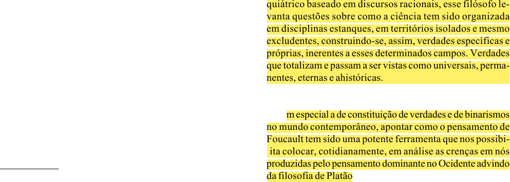 <p>245</p><p>1 Endereço: Rua João Pessoa 154 apto. 403. CEP.: 24220-331 - Niteroi</p><p>- RJ. E-mail: tunico@cruiser.com.br</p><p>Psicologia: Teoria e Pesquisa</p><p>Set-Dez 2001, Vol. 17 n. 3, pp. 245-248</p><p>O Efeito Foucault: Desnaturalizando</p><p>Verdades, Superando Dicotomias</p><p>Cecilia Maria Bouças Coimbra e</p><p>Maria Livia do Nascimento1</p><p>Universidade Federal Fluminense</p><p>RESUMO - Este artigo parte de idéias contidas em algumas obras de Foucault, levantando questões referentes à produção de</p><p>verdades, a hegemonia da ciência positiva e aos binarismos presentes no mundo contemporâneo. Aponta, ainda, como o</p><p>pensamento desse filósofo tem sido uma potente ferramenta, que tem possibilitado colocar em análise as crenças produzidas</p><p>pelo pensamento platônico, ainda hoje dominante no Ocidente. A partir daí, coloca em discussão a divisão psicologia versus</p><p>política, procurando pensar que efeitos têm sido produzidos por tal dicotomia cotidiana.</p><p>Palavras-chave: verdade; dicotomias; práticas psi.</p><p>The Foucault Effect: Changing</p><p>Truths, Overcoming Dicotomies</p><p>ABSTRACT - The present article is based on ideas contained in some of Foucault’ s works, rising questions regarding the way</p><p>truth is produced, the hegemonical stand-point of positive science and the present binarysms in contemporary world. It still</p><p>points out how the thought of this philosopher has been a strong tool, which has turned possible to put under analysis the</p><p>beliefs produced by the platonic thought, yet dominant in the Occident. From this, it puts under discussion the division</p><p>psychology versus policy, trying to think which effects has been produced by this dicotomy.</p><p>Key words: truth; dichotomies; psy practices.</p><p>A História da Loucura, um de seus primeiros escritos,</p><p>que neste ano completa quarenta anos, inaugura uma histó-</p><p>ria dos processos de exclusão presentes no mundo ocidental</p><p>que, baseados em teorias científico-positivistas - ainda hoje</p><p>hegemônicas - têm produzido verdades sobre os considera-</p><p>dos diferentes, sistematicamente rotulados, estigmatizados</p><p>e excluídos (Foucault, 1972/1995). Nesta obra Foucault ques-</p><p>tiona a separação entre razão e loucura, onde esta é tomada</p><p>como o inverso da razão, como a desrazão. Para tanto, dis-</p><p>cute o conjunto dos discursos que foram se impondo pela</p><p>razão ao falar sobre a não razão. Razão que se torna uma</p><p>figura de poder e passa a funcionar também como um meca-</p><p>nismo de exclusão (Ewald, 1995). Ao discutir o saber psi-</p><p>quiátrico baseado em discursos racionais, esse filósofo le-</p><p>vanta questões sobre como a ciência tem sido organizada</p><p>em disciplinas estanques, em territórios isolados e mesmo</p><p>excludentes, construindo-se, assim, verdades específicas e</p><p>próprias, inerentes a esses determinados campos. Verdades</p><p>que totalizam e passam a ser vistas como universais, perma-</p><p>nentes, eternas e ahistóricas.</p><p>Nosso objetivo aqui não se prende a uma análise desta</p><p>sua primeira obra, mas a partir de algumas idéias ali presen-</p><p>tes, em especial a de constituição de verdades e de binarismos</p><p>no mundo contemporâneo, apontar como o pensamento de</p><p>Foucault tem sido uma potente ferramenta que nos possibi-</p><p>lita colocar, cotidianamente, em análise as crenças em nós</p><p>produzidas pelo pensamento dominante no Ocidente advindo</p><p>da filosofia de Platão. Posteriormente, colocaremos em dis-</p><p>cussão a divisão psicologia versus política, procurando pen-</p><p>Parece-me que o que se deve levar em consideração no intelec-</p><p>tual não é, portanto, “o portador de valores universais”; ele é</p><p>alguém que ocupa uma posição específica, mas cuja especi-</p><p>ficidade está ligada às funções gerais do dispositivo de verda-</p><p>de em nossas sociedades. Em outras palavras, o intelectual</p><p>tem uma tripla especificidade: a especificidade de sua posição</p><p>de classe (...); a especificidade de suas condições de vida e de</p><p>trabalho, ligadas a sua condição de intelectual (...); finalmen-</p><p>te, a especificidade da verdade nas sociedades contemporâne-</p><p>as. É então que sua posição pode adquirir uma significação</p><p>geral, que seu combate local ou específico acarreta efeitos,</p><p>tem implicações que não são somente profissionais ou setoriais.</p><p>Ele funciona ou luta ao nível geral deste regime de verdade,</p><p>que é tão essencial para as estruturas e para o funcionamento</p><p>de nossa sociedade. Há um combate “pela verdade” ou, ao</p><p>menos, “em torno da verdade”- entendendo-se, mais uma vez,</p><p>que por verdade não quero dizer “o conjunto das coisas ver-</p><p>dadeiras a descobrir ou a fazer aceitar”, mas o “conjunto das</p><p>regras segundo as quais se distingue o verdadeiro do falso e se</p><p>atribui ao verdadeiro efeitos específicos de poder”; entenden-</p><p>do-se também que não se trata de um combate “em favor” da</p><p>verdade, mas em torno do estatuto da verdade e do papel eco-</p><p>nômico-político que ela desempenha (Foucault, 1988, p. 13).</p><p>Dentre as diferentes contribuições de Foucault nos mais</p><p>diversos domínios do saber, tais como psiquiatria, justiça,</p><p>história, medicina, este artigo privilegia a questão da produ-</p><p>ção de verdades, da dicotomia entre psicologia e política e</p><p>alguns de seus efeitos sobre nossas práticas.</p><p>246 Psic.: Teor. e Pesq., Brasília, Set-Dez 2001, Vol. 17 n. 3, pp. 245-248</p><p>C. M. B. Coimbra e M. L. do Nascimento</p><p>sar porque ela tem sido construída e vivida de forma tão</p><p>dicotômico-excludente.</p><p>Partimos do pressuposto que as verdades são produções</p><p>histórico-sociais e que nós, os intelectuais, cientistas, pes-</p><p>quisado