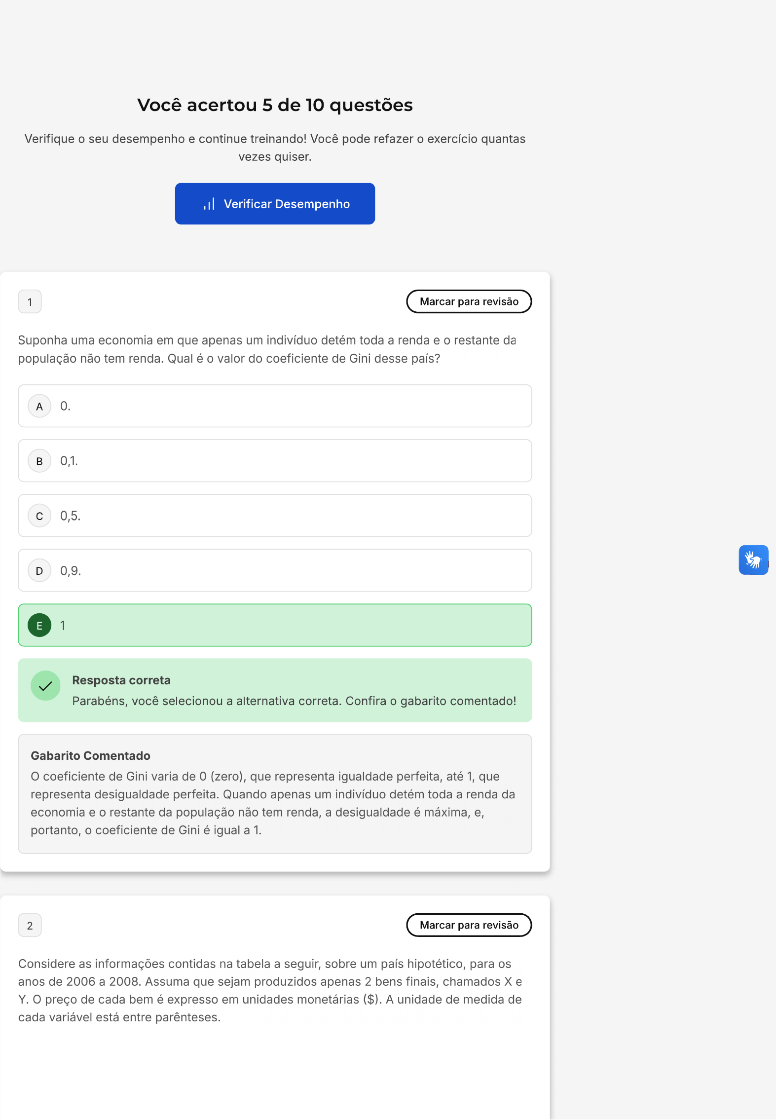 <p>Você acertou 5 de 10 questões Verifique o seu desempenho e continue treinando! Você pode refazer o exercício quantas vezes quiser. Verificar Desempenho 1 Marcar para revisão Suponha uma economia em que apenas um indivíduo detém toda a renda e o restante da população não tem renda. Qual é o valor do coeficiente de Gini desse país? A 0. B 0,1. C 0,5. D 0,9. E 1 Resposta correta Parabéns, você selecionou a alternativa correta. Confira o gabarito comentado! Gabarito Comentado coeficiente de Gini varia de 0 (zero), que representa igualdade perfeita, até 1, que representa desigualdade perfeita. Quando apenas um indivíduo detém toda a renda da economia e o restante da população não tem renda, a desigualdade é máxima, e, portanto, o coeficiente de Gini é igual a 1. 2 Marcar para revisão Considere as informações contidas na tabela a seguir, sobre um país hipotético, para os anos de 2006 a 2008. Assuma que sejam produzidos apenas 2 bens finais, chamados X e Y. preço de cada bem é expresso em unidades monetárias ($). A unidade de medida de cada variável está entre parênteses</p><p>População Bem Quantidade Preço Ano (habitantes) Final (unidades) (R$) 5 10000 2006 100 Y 10 20000 x 10 5000 2007 125 Y 20 10000 x 15 4000 2008 150 Y 15 10000 - Houve uma redução de 10% no PIB real, a preços de 2006, entre os anos de 2007 e 2008. Il PIB real para o ano de 2008, a preços de 2006, é igual a $210.000,00. III PIB real per capita, a preços de 2006, cresceu entre os anos de 2006 e 2007. IV deflator do PIB, a preços de 2006, sofreu uma queda de 50%, entre 2006 e 2007. V - A taxa de crescimento anual do PIB real per capita independe da escolha do ano-base para os preços. Com base nas informações da tabela, assinale a alternativa correta: A As alternativas II, III e V são falsas B As alternativas II, III e V são verdadeiras. C Apenas a alternativa é verdadeira. D Somente a alternativa é falsa. E As alternativas I, IV e V são verdadeiras. Resposta incorreta Opa! A alternativa correta é a letra A. Confira o gabarito comentado! Gabarito Comentado A resposta correta é: As alternativas II, III e V são falsas 3 Marcar para revisão Sobre os indicadores socioeconômicos, assinale a alternativa correta. coeficiente de Gini mede a distribuição de renda e varia entre zero e um. A Quanto mais próxima de zero, menos desigual é a distribuição, e quanto mais próxima de um, mais desigual é. índice de desenvolvimento humano, assim como o PIB, mede o B desenvolvimento de uma nação IDH, da dimensão da renda, agrega informações sobre educação e investimento. Considera uma nação hipotética Felicilândia cuja renda per capita em 2020 é C de mil reais. Seu coeficiente de Gini em 2020 foi de 0,347. Felicilândia é um país desenvolvido e com baixa desigualdade.</p><p>O índice de desenvolvimento humano mede o desenvolvimento de um país e permite comparações entre países. O IDH é composto de renda, educação e D longevidade. Seus valores variam entre zero e um. Quanto mais perto de um, mais desenvolvido é considerado o país, quanto mais próximo de zero, menos desenvolvido ele é. A taxa de desemprego é um indicador sobre o estado do mercado de trabalho e E calcula quantas pessoas não estão trabalhando em uma economia. X Resposta incorreta Opa! A alternativa correta é a letra D. Confira o gabarito comentado! Gabarito Comentado A alternativa correta é a D, que afirma que o Índice de Desenvolvimento Humano (IDH) mede o desenvolvimento de um país e permite comparações entre países. O IDH é composto por três dimensões: renda, educação e longevidade. Seus valores variam entre zero e um, sendo que quanto mais próximo de um, mais desenvolvido é considerado o país, e quanto mais próximo de zero, menos desenvolvido ele é. Portanto, o IDH é um indicador socioeconômico importante para avaliar o nível de desenvolvimento de um país, levando em consideração não apenas a renda, mas também a educação e a expectativa de vida da população. 4 Marcar para revisão índice de desenvolvimento humano (IDH) é uma medida resumida do progresso a longo prazo que considera três dimensões do desenvolvimento humano. Quais são as três dimensões básicas do desenvolvimento humano consideradas no cálculo do IDH? A PIB, inflação e emprego. B Educação, saúde e emprego. Renda, educação e expectativa de vida. D Renda, inflação e expectativa de vida. E Emprego, inflação e saúde. Resposta correta Parabéns, você selecionou a alternativa correta. Confira o gabarito comentado! Gabarito Comentado O IDH é calculado a partir de três dimensões básicas do desenvolvimento humano: renda, educação e expectativa de vida. O indicador de renda é calculado a partir do PIB per capita do país, o indicador de educação é calculado com base na taxa de</p><p>alfabetização e na taxa de conclusão do ensino fundamental e médio, e o indicador de expectativa de vida é a média de anos que se espera que uma pessoa viva ao nascer. 5 Marcar para revisão Sobre as contas nacionais, assinale a alternativa incorreta: A remessa de dinheiro de brasileiros que residem no exterior a familiares no Brasil A aumenta a Renda Nacional Bruta. PIB corresponde ao valor adicionado de todos os bens e serviços produzidos B em um país, sendo que, por valor adicionado, entende-se o valor da produção mais o consumo dos bens intermediários. Em geral, países com alto grau de endividamento externo têm, ceteris paribus, o C PIB maior que o PNB. acúmulo de estoques indesejados é contabilizado como investimento nas D contas nacionais. Um bem é produzido em 2000 e vendido em 2001. Este bem contribui para o PIB E de 2001. X Resposta incorreta Opa! A alternativa correta é a letra B. Confira o gabarito comentado! Gabarito Comentado A alternativa B está incorreta. PIB (Produto Interno Bruto) não corresponde ao valor da produção mais o consumo dos bens intermediários. 
