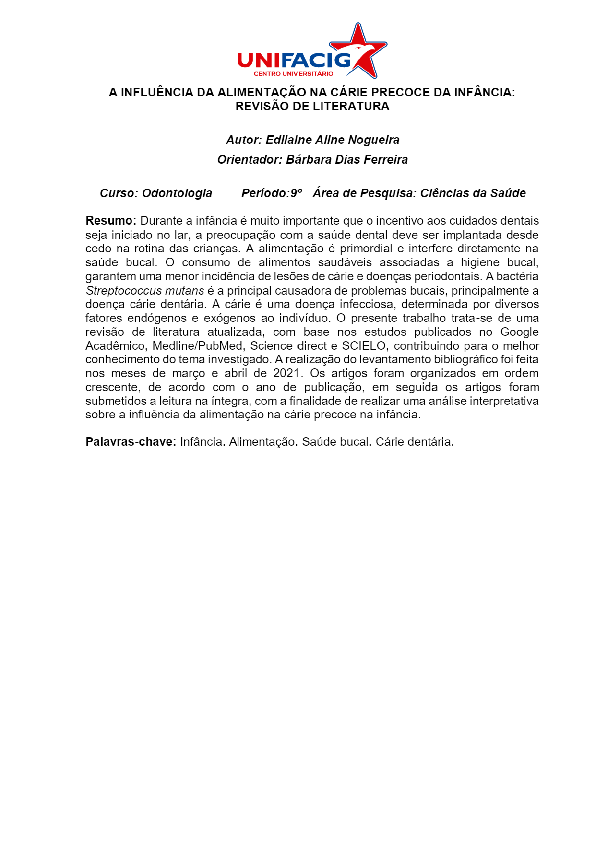 <p>UNIFACIG CENTRO UNIVERSITÁRIO A INFLUÊNCIA DA ALIMENTAÇÃO NA CÁRIE PRECOCE DA INFÂNCIA: REVISÃO DE LITERATURA Autor: Edilaine Aline Nogueira Orientador: Bárbara Dias Ferreira Curso: Odontologia Período:9° Área de Pesquisa: Ciências da Saúde Resumo: Durante a infância é muito importante que o incentivo aos cuidados dentais seja iniciado no lar, a preocupação com a saúde dental deve ser implantada desde cedo na rotina das crianças. A alimentação é primordial e interfere diretamente na saúde bucal. consumo de alimentos saudáveis associadas a higiene bucal, garantem uma menor incidência de lesões de cárie e doenças periodontais. A bactéria Streptococcus mutans é a principal causadora de problemas bucais, principalmente a doença cárie dentária. A cárie é uma doença infecciosa, determinada por diversos fatores endógenos e exógenos ao indivíduo. presente trabalho trata-se de uma revisão de literatura atualizada, com base nos estudos publicados no Google Acadêmico, Medline/PubMed, Science direct e SCIELO, contribuindo para o melhor conhecimento do tema investigado. A realização do levantamento bibliográfico foi feita nos meses de março e abril de 2021. Os artigos foram organizados em ordem crescente, de acordo com o ano de publicação, em seguida os artigos foram submetidos a leitura na íntegra, com a finalidade de realizar uma análise interpretativa sobre a influência da alimentação na cárie precoce na infância. Palavras-chave: Infância. Alimentação. Saúde bucal. Cárie dentária.</p><p>UNIFACIG CENTRO UNIVERSITÁRIO 1. INTRODUÇÃO Durante a infância e adolescência é muito importante que o incentivo aos cuidados dentais seja iniciado no lar, a preocupação com a saúde dental deve ser implantada desde cedo na rotina das crianças (FELDENS et al, 2010). A alimentação é primordial e interfere diretamente na saúde bucal. consumo de alimentos saudáveis associadas a higiene bucal, garantem uma menor incidência de cáries e doenças periodontais (FERNANDES, 2014). A cárie é a destruição do dente causada por bactérias presentes na flora bucal quando há acúmulo de resíduos de alimentos. O consumo excessivo de alimentos ricos em carboidratos e açúcares favorecem o desequilíbrio da microbiota bucal, favorecendo o surgimento de cáries e placa bacteriana, essa que posteriormente pode causar também doenças periodontais (LEMOS, 2014). Segundo Souza Filho et al (2006), estima-se que as doenças bucais atingem cerca de 3,5 milhões de pessoas em todo o mundo, a cárie é a doença mais comum, afetando dentes permanentes e decíduos. A educação em saúde bucal e a assimilação de hábitos de higiene da boca por meio dos pais, educadores e cuidadores são muito importantes para a preservação da dentição permanente, assim como a inserção da alimentação saudável desde os primeiros anos de vida (OLIVEIRA, 2016). É comum que alimentos como biscoitos recheados e guloseimas façam parte da rotina da criança, por serem alimentos facilmente encontrados, até mesmo em muitos ambientes escolares ou nos arredores dos mesmos, no entanto, na fase de troca de dentes, é necessário maior vigilância pelos responsáveis, já que é uma fase mais crítica, em que a criança está se preparando para receber o conjunto permanente de dentes (OLIVEIRA, 2016). O objetivo do presente estudo é analisar a literatura acerca da importância da alimentação para a saúde bucal em crianças na primeira infância, visando relacionar a influência dos alimentos na incidência de doenças bucais como a cárie.</p><p>2.DESENVOLVIMENTO 2.1. Referencial Teórico 2.1.1. Primeira Infância A primeira infância também conhecida como período pré-operatório, é a fase que compreende de 0 a 6 anos, e segundo Piaget (1972), se caracteriza pela incapacidade de a criança sair do seu próprio ponto de vista e aceitar o do outro. As características que são marcantes nessa etapa são: animismo (capacidade de dar vida aos seres não vivos), antropomorfismo (atribuir formas humanas a seres não humanos) e artificialismo (crença de que todas as coisas foram criadas por uma entidade divina para o homem) (MANTOVANI, 2000). É nessa fase de descobertas até os 2 anos de idade que comumente as crianças levem todos os objetos a boca, como uma forma de experimentação oral, para conhecer texturas dos objetos e seus gostos, acredita-se que introduzir objetos na boca está associado ao prazer da amamentação (CORREA, 2010). Logo nessa fase, faz- se necessária a introdução dos hábitos de higiene bucal e vigilância dos responsáveis. 2.1.2. Cárie Dentária A cárie dentária é uma patologia multifatorial infecciosa ligada a colonização de bactérias, produção salivar e a alimentação, que pode ocasionar além da perda estética do dente, também a perda do mesmo (LOPES et al, 2015). A bactéria Streptococcus mutans é a principal causadora de problemas bucais, principalmente a doença cárie dentária (Figura 1). A cárie é uma doença infecciosa, determinada por diversos fatores endógenos e exógenos ao indivíduo. A bactéria Streptococcus mutans tem a capacidade de aderir ao esmalte dentário e a produção de biofilme dental através de formação de polissacarídeos extracelulares (LEMOS, 2014). Os são estruturas de elevada massa molecular compostas por carboidratos que ao serem adicionados no alimento, se comportam como agentes emulsificantes e espessantes (LEMOS, 2014). A produção bacteriana de é um mecanismo de defesa frente às diversidades encontradas no meio de sobrevivência e essa substância é a mesma ofertada em leites fermentados, amplamente consumido na infância (LEMOS, 2014). Ogata et al. (2018) demonstram que é na primeira infância que ocorre normalmente a introdução da sacarose na alimentação, que é mais cariogênico de todos os carboidratos e a introduzindo no primeiro ano de vida do bebê, fase em que estão rom