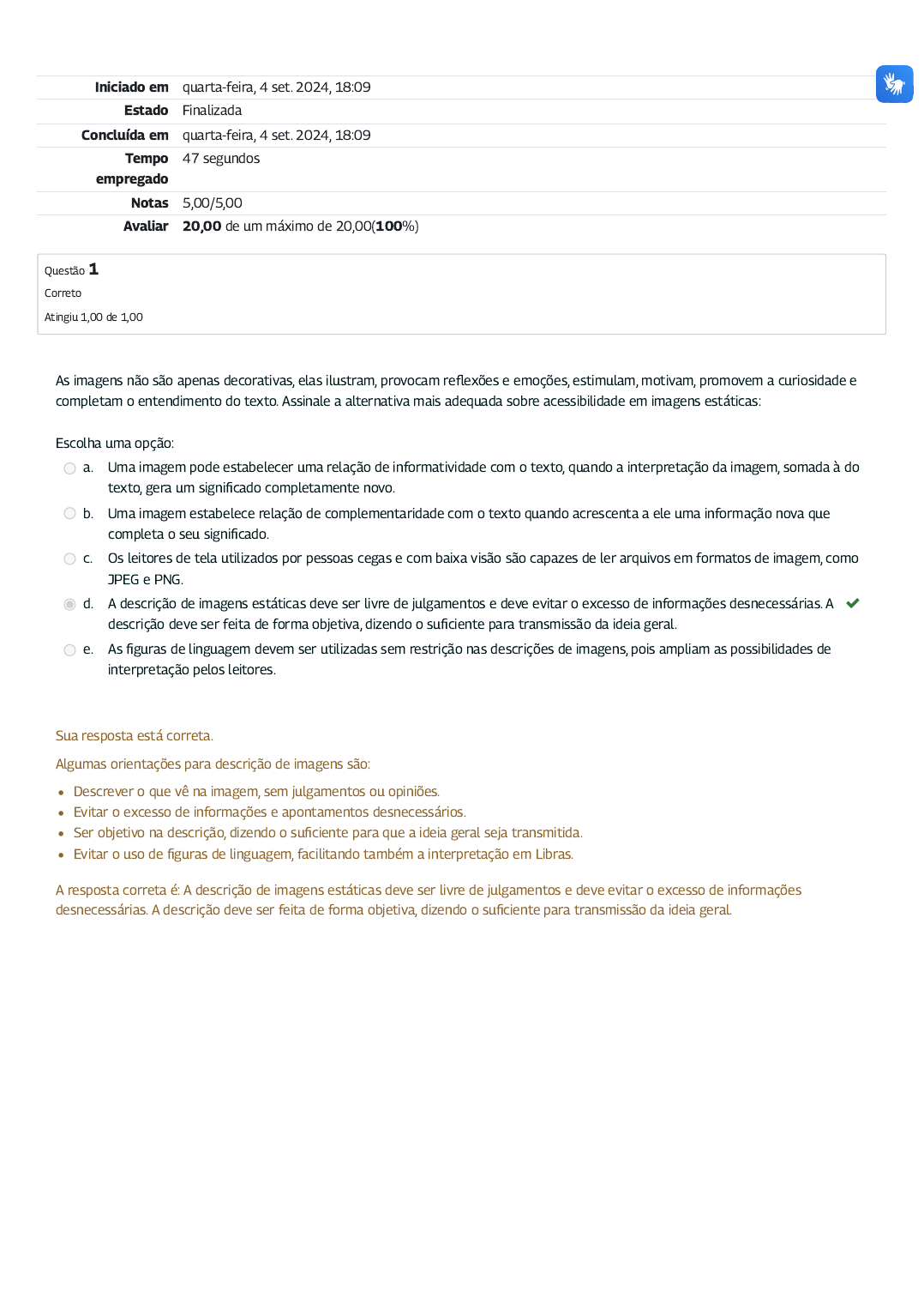 <p>Iniciado em quarta-feira, 4 set. 2024, 18:09</p><p>Estado Finalizada</p><p>Concluída em quarta-feira, 4 set. 2024, 18:09</p><p>Tempo</p><p>empregado</p><p>47 segundos</p><p>Notas 5,00/5,00</p><p>Avaliar 20,00 de um máximo de 20,00(100%)</p><p>Questão 1</p><p>Correto</p><p>Atingiu 1,00 de 1,00</p><p>As imagens não são apenas decorativas, elas ilustram, provocam re�exões e emoções, estimulam, motivam, promovem a curiosidade e</p><p>completam o entendimento do texto. Assinale a alternativa mais adequada sobre acessibilidade em imagens estáticas:</p><p>Escolha uma opção:</p><p>a. Uma imagem pode estabelecer uma relação de informatividade com o texto, quando a interpretação da imagem, somada à do</p><p>texto, gera um signi�cado completamente novo.</p><p>b. Uma imagem estabelece relação de complementaridade com o texto quando acrescenta a ele uma informação nova que</p><p>completa o seu signi�cado.</p><p>c. Os leitores de tela utilizados por pessoas cegas e com baixa visão são capazes de ler arquivos em formatos de imagem, como</p><p>JPEG e PNG.</p><p>d. A descrição de imagens estáticas deve ser livre de julgamentos e deve evitar o excesso de informações desnecessárias. A</p><p>descrição deve ser feita de forma objetiva, dizendo o su�ciente para transmissão da ideia geral.</p><p></p><p>e. As �guras de linguagem devem ser utilizadas sem restrição nas descrições de imagens, pois ampliam as possibilidades de</p><p>interpretação pelos leitores.</p><p>Sua resposta está correta.</p><p>Algumas orientações para descrição de imagens são:</p><p>Descrever o que vê na imagem, sem julgamentos ou opiniões.</p><p>Evitar o excesso de informações e apontamentos desnecessários.</p><p>Ser objetivo na descrição, dizendo o su�ciente para que a ideia geral seja transmitida.</p><p>Evitar o uso de �guras de linguagem, facilitando também a interpretação em Libras.</p><p>A resposta correta é: A descrição de imagens estáticas deve ser livre de julgamentos e deve evitar o excesso de informações</p><p>desnecessárias. A descrição deve ser feita de forma objetiva, dizendo o su�ciente para transmissão da ideia geral.</p><p>Questão 2</p><p>Correto</p><p>Atingiu 1,00 de 1,00</p><p>Questão 3</p><p>Correto</p><p>Atingiu 1,00 de 1,00</p><p>Considerando as disposições normativas sobre acessibilidade, o Ministério da Educação, em parceria com a Universidade Federal do Rio</p><p>de Janeiro, desenvolveu o Mecdaisy. Assinale a alternativa mais adequada sobre o Mecdaisy.</p><p>Escolha uma opção:</p><p>a. O Mecdaisy é um formato utilizado para tornar conteúdos acessíveis.</p><p>b. O Mecdaisy é um sistema voltado ao ensino de técnicas da escrita em braile.</p><p>c. O Mecdaisy é uma solução tecnológica que tem como função principal a produção de livros impressos compatíveis com</p><p>leitores de tela.</p><p>d. O Mecdaisy é uma solução tecnológica que permite a produção de livros em formato digital acessível no padrão Daisy. </p><p>e. O padrão Daisy não permite a exportação de textos para impressão em braile nem a leitura em caracteres ampliados.</p><p>Sua resposta está correta.</p><p>O Mecdaisy é uma solução tecnológica que permite a produção de livros em formato digital acessível no padrão Daisy (Digital Accessible</p><p>Information System).</p><p>Esse padrão apresenta facilidade de navegação pelo texto, permitindo a reprodução sincronizada de trechos selecionados, o recuo e o</p><p>avanço de parágrafos e a busca de seções ou capítulos. Possibilita também anexar anotações aos arquivos do livro, exportar o texto</p><p>para impressão em Braille, bem como a leitura em caracteres ampliados. Todo texto é indexado, facilitando, assim, a navegação por</p><p>meio de índices ou buscas rápidas.</p><p>A resposta correta é: O Mecdaisy é uma solução tecnológica que permite a produção de livros em formato digital acessível no padrão</p><p>Daisy.</p><p>Para que planilhas, grá�cos e tabelas sejam disponibilizados no meio digital com um bom nível de acessibilidade, é importante ter</p><p>cuidado com a formatação e a disposição dos elementos. Sobre esses cuidados, assinale a alternativa mais adequada:</p><p>Escolha uma opção:</p><p>a. As células mescladas e divididas não acarretam prejuízo aos so�wares de leitura de tela utilizado por pessoas cegas.</p><p>b. O contraste entre a cor de fundo e o texto nas células não possui qualquer impacto para acessibilidade.</p><p>c. Os leitores de tela não conseguem associar o cabeçalho às células de conteúdo em uma tabela.</p><p>d. Ao inserir uma imagem, grá�co ou �gura em um documento Excel ou Calc, é essencial fornecer uma descrição para eles</p><p>em uma caixa de texto alternativo.</p><p></p><p>e. Os nomes das guias de uma planilha não podem ser lidos pelos so�wares de leitura de tela.</p><p>Sua resposta está correta.</p><p>É essencial fornecer um texto alternativo às imagens que transmitem conteúdo em um documento. Assim, ao inserir uma imagem,</p><p>grá�co ou �gura, forneça uma descrição para eles em uma caixa de texto alternativo.</p><p>A resposta correta é: Ao inserir uma imagem, grá�co ou �gura em um documento Excel ou Calc, é essencial fornecer uma descrição</p><p>para eles em uma caixa de texto alternativo.</p><p>Questão 4</p><p>Correto</p><p>Atingiu 1,00 de 1,00</p><p>Questão 5</p><p>Correto</p><p>Atingiu 1,00 de 1,00</p><p>Sobre as práticas que ajudam a reduzir barreiras em documentos digitais, assinale a alternativa mais adequada:</p><p>Escolha uma opção:</p><p>a. A descrição de imagens é facultada em imagens que transmitem conteúdo.</p><p>b. A descrição de imagens que transmitem conteúdo facilita o acesso de pessoas que utilizam leitores de tela. </p><p>c. A descrição de imagens sempre deve ser feita em caixa de texto alternativo.</p><p>d. Os documentos digitais não precisam oferecer