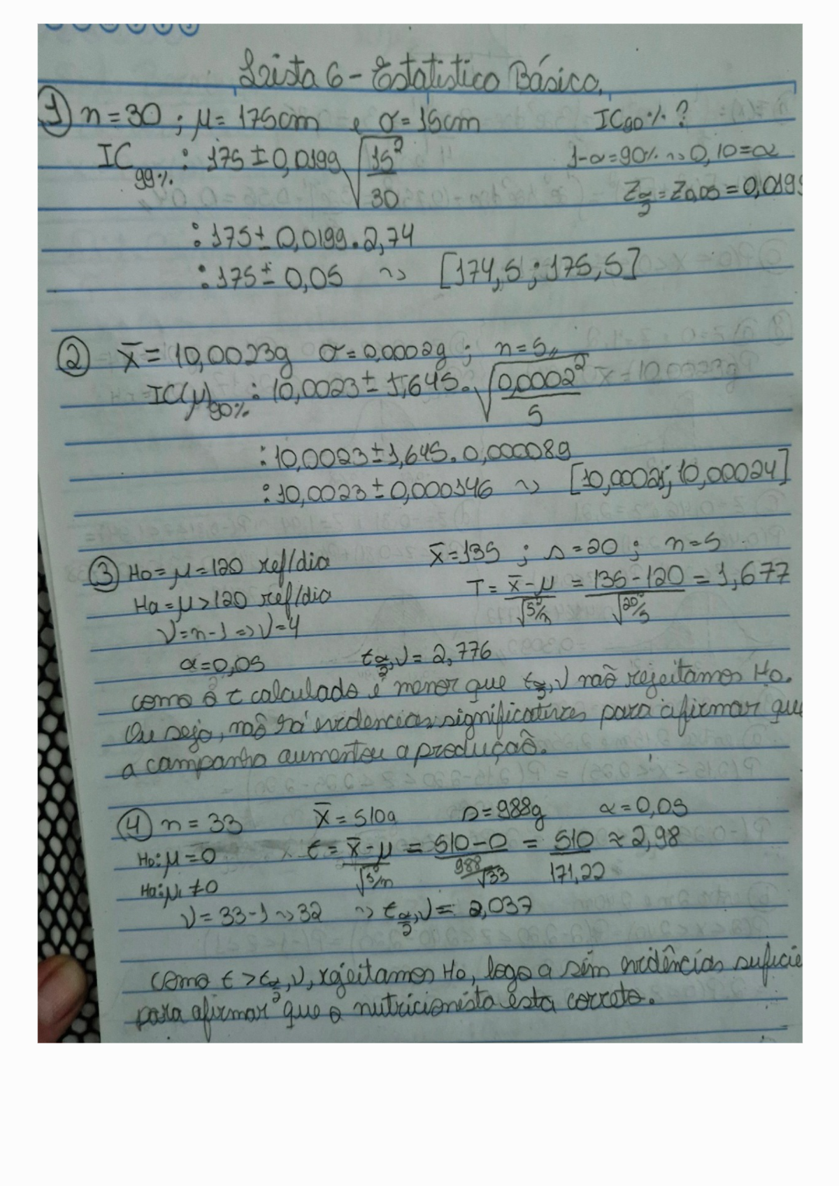 <p>- Estatistico 30 175cm IC : 152 10=02 99% 30 175+ 10,0199.2,74 2 ; 90% 5 3 120 ref/dia Ha=ju>120 = 1,677 2,776 como calculads l rad Ou ra para afirmar are a aumentor a 4 n=33 = 171,22 V= 2,037 logs a sim para que Q nutricionista esta correto.</p>