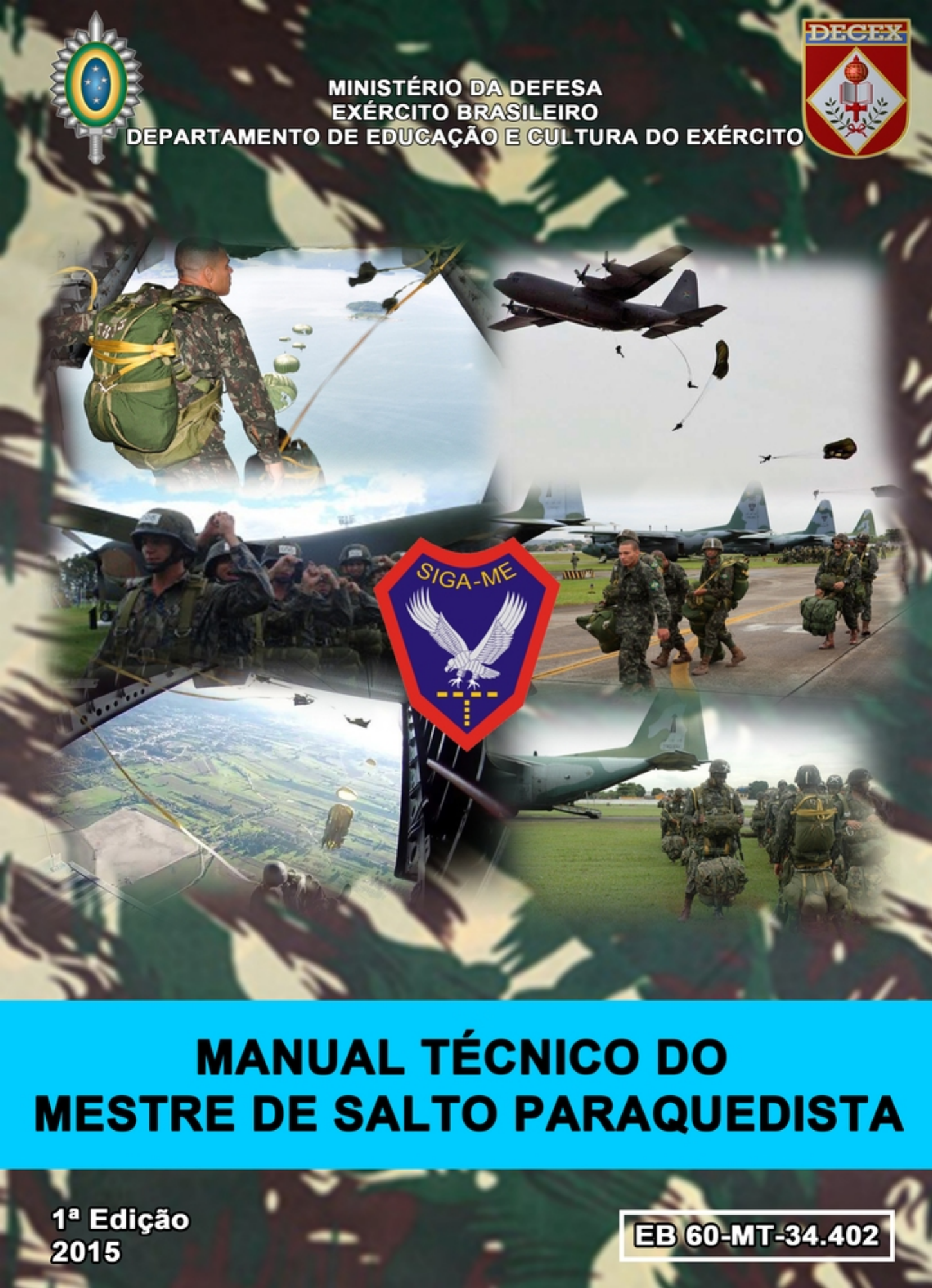 <p>MINISTÉRIO DA DEFESA</p><p>EXÉRCITO BRASILEIRO</p><p>DEPARTAMENTO DE EDUCAÇÃO E CULTURA DO EXÉRCITO</p><p>MANUAL TÉCNICO DO MESTRE DE SALTO</p><p>PARAQUEDISTA</p><p>1ª Edição</p><p>2015</p><p>PORTARIA Nr 02 DECEx, DE 12 DE JANEIRO DE 2015.</p><p>Aprova o Manual Técnico do</p><p>Mestre de Salto Paraquedista</p><p>(EB60-MT-34.402) 1ª Edição, 2015</p><p>e dá outras providências.</p><p>O CHEFE DO DEPARTAMENTO DE EDUCAÇÃO E CULTURA DO</p><p>EXÉRCITO, no uso da delegação de competência conferida pelo Art 44 das</p><p>Instruções Gerais para as Publicações Padronizadas do Exército (EB10-IG-01.002),</p><p>aprovadas pela Portaria do Comandante do Exército Nr 770, de 7 de dezembro de</p><p>2011, resolve:</p><p>Art 1º Aprovar o Manual Técnico do Mestre de Salto Paraquedista (EB60-</p><p>MT-34.402) 1ª Edição, 2015, que com esta baixa.</p><p>Art 3º Estabelecer que esta Portaria entre em vigor na data de sua</p><p>publicação.</p><p>Gen Div JOSÉ CARLOS DOS SANTOS</p><p>Respondendo pela Chefia do Departamento de Educação e Cultura do Exército</p><p>Publicado no Boletim do Exército Nr 6, de 6 de fevereiro de 2015.</p><p>Art 2º Revogar a publicação T 57-270-MESTRE DE SALTO</p><p>AEROTERRESTRE - Port Min Nr 370, de 9 de novembro de 1965 (BE 52/1965).</p><p>FOLHA REGISTRO DE MODIFICAÇÕES (FRM)</p><p>NÚMERO DE</p><p>ORDEM</p><p>ATO DE</p><p>APROVAÇÃO</p><p>PÁGINAS</p><p>AFETADAS</p><p>DATA</p><p>ÍNDICE DOS ASSUNTOS</p><p>Capítulo I - INTRODUÇAO</p><p>1.1 Finalidade...................................................................................................... 1-1</p><p>1.2 Considerações iniciais........................................................................................ 1-1</p><p>1.3 O mestre de salto............................................................................................... 1-1</p><p>1.4 Funções desempenhadas pelo mestre de salto ................................................ 1-2</p><p>1.5 Outras atividades desempenhadas pelo Ms....................................................... 1-2</p><p>1.6 Deveres do Ms Av............................................................................................... 1-2</p><p>1.7 Deveres do Aux Ms Av (Anv C-105)................................................................... 1-3</p><p>1.8 Deveres do Ms Eqp............................................................................................ 1-3</p><p>1.9 Deveres do Op Intf (Anv C-105) ou Aux Ms Nr 1 (Anv C-130)........................... 1-3</p><p>1.10 Deveres Aux Ms Nr 2 (Anv C-130).................................................................... 1-4</p><p>1.11 Deveres do Aux Ms Av (Anv C-95)................................................................... 1-4</p><p>1.12 Ordens dadas pelo Ms Av................................................................................. 1-5</p><p>1.13 Material do mestre de salto............................................................................... 1-5</p><p>1.14 Normas para recebimento de paraquedas........................................................ 1-6</p><p>1.15 Preparativos para as missões de lançamento.................................................. 1-6</p><p>1.16 Equipagem e ajustagem................................................................................... 1-7</p><p>1.17 Inspeção dos saltadores................................................................................... 1-7</p><p>1.18 Divisão e organização das equipes.................................................................. 1-8</p><p>1.19 Devolução dos paraquedas.............................................................................. 1-8</p><p>Capítulo II - MEDIDAS DE SEGURANÇA NOS AERÓDROMOS E</p><p>DURANTE OS VOOS</p><p>2.1 Considerações gerais......................................................................................... 2-1</p><p>2.2 Definições........................................................................................................... 2-1</p><p>2.3 Segurança nos aeródromos................................................................................ 2-2</p><p>2.4 Segurança no voo............................................................................................... 2-3</p><p>2.5 Segurança durante os lançamentos................................................................... 2-4</p><p>Capítulo III - LANÇAMENTO AEROTERRESTRE</p><p>3.1 Considerações gerais......................................................................................... 3-1</p><p>3.2 Corrida para a zona de lançamento.................................................................... 3-1</p><p>3.3 Circuito da aeronave........................................................................................... 3-2</p><p>3.4 Classificação dos lançamentos .......................................................................... 3-3</p><p>3.5 Lançamento de animais ..................................................................................... 3-4</p><p>3.6 Sinais para o lançamento.................................................................................... 3-4</p><p>3.7 Sequência dos sinais para o lançamento........................................................... 3-5</p><p>3.8 Tipos de formação.............................................................................................. 3-6</p><p>3.9 Formação tática básica....................................................................................... 3-7</p><p>3.10 Conceitos.......................................................................................................... 3-8</p><p>Capítulo IV - ZONA DE LANÇAMENTO</p><p>4.1 Definições........................................................................................................... 4-1</p><p>4.2 Identificação da zona de lançamento................................................